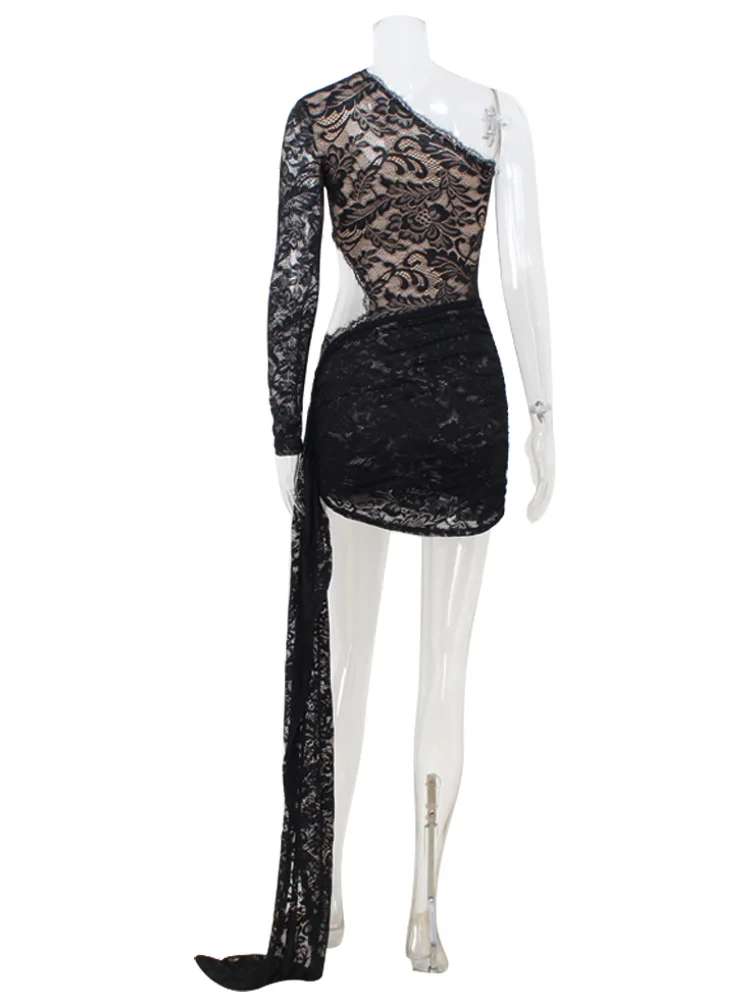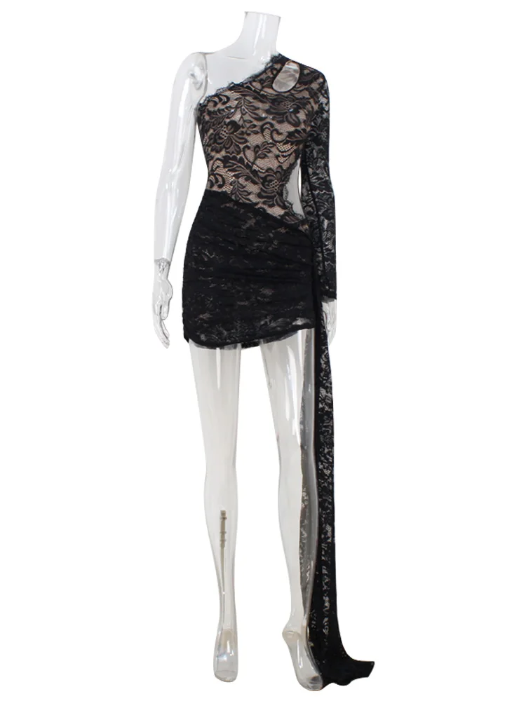 Ahagaga Sexy Sheer Women's Mini Dresses Lace Solid Sheath Long Sleeves One Shoulder Ribbon Sheath Slim Fit Streetwear Vestidos