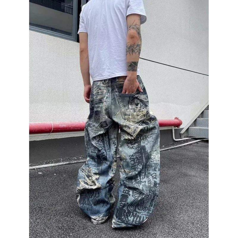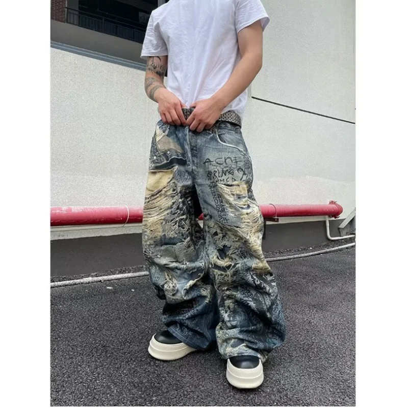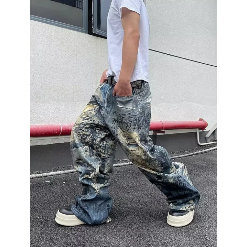 American High Street Retro 3D Digital Illusion Worn out Men's Women's Loose Straight Leg Wide Leg Long Jeans Casual Faion