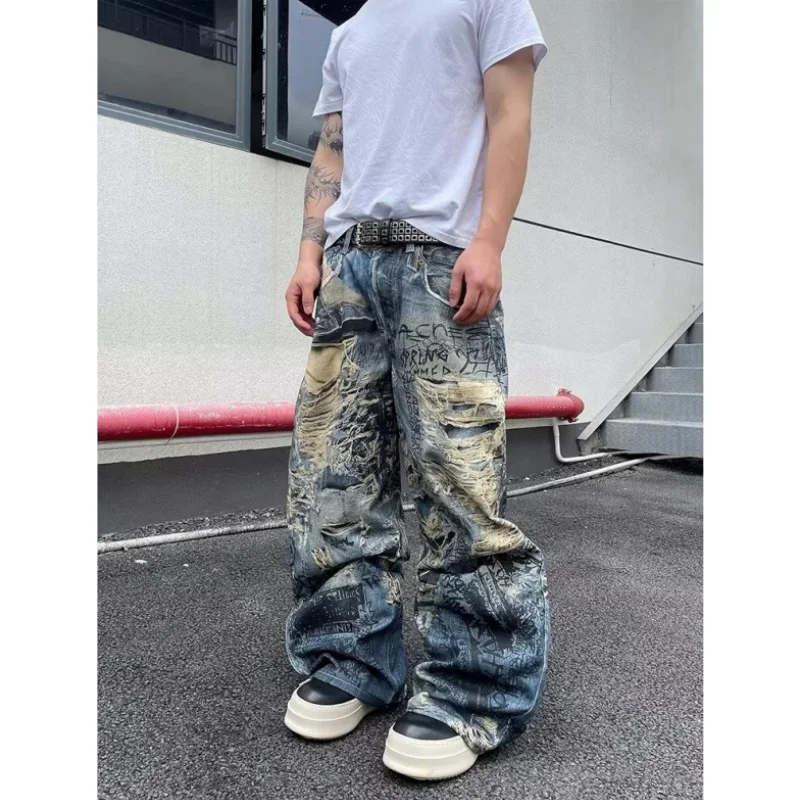 The distressed denim adds a rugged, edgy look, perfect for those who want to stand out from the crowd.