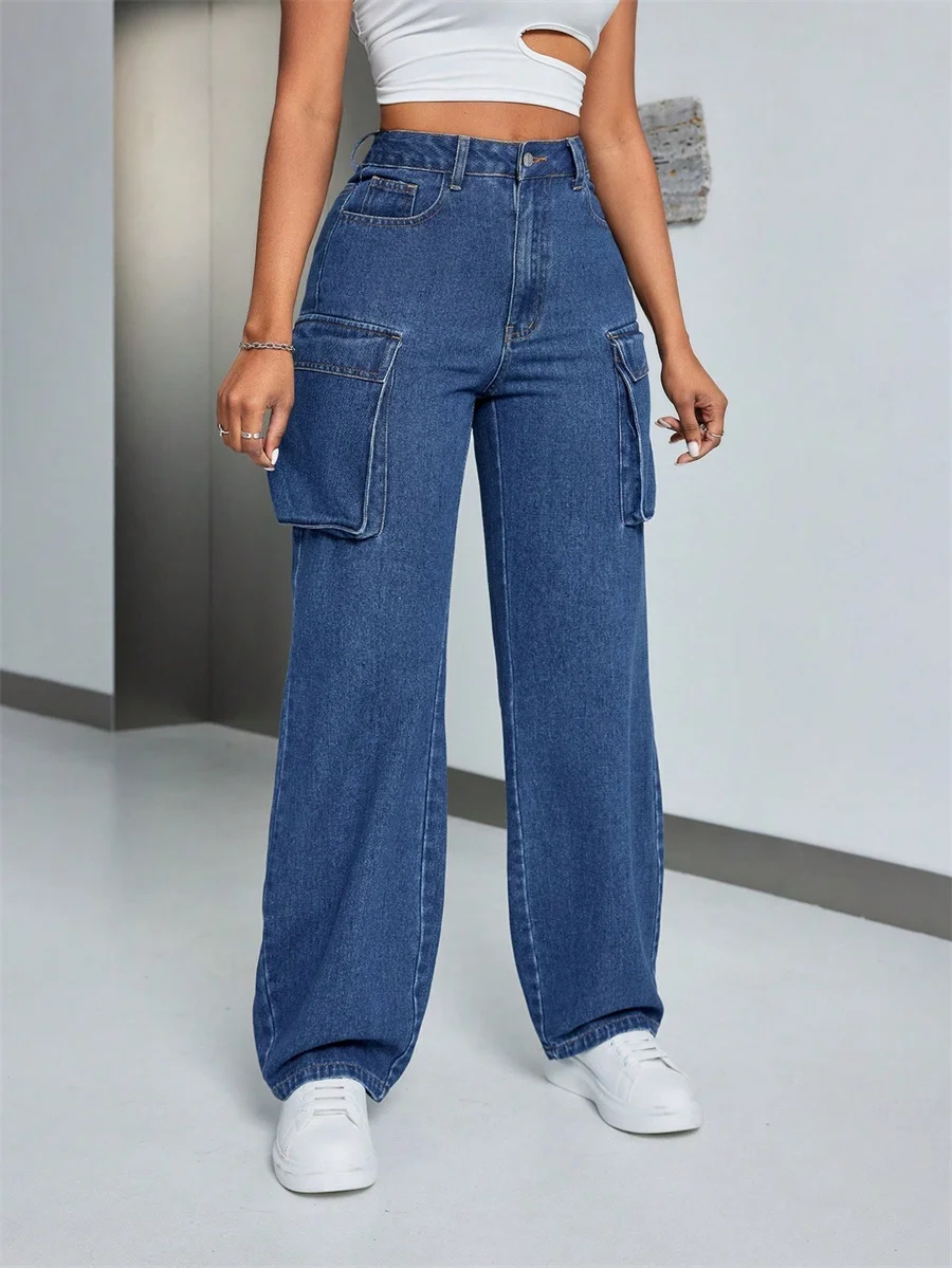 Benuynffy High Waist Multi-pocket Loose Cargo Jeans Women's Streetwear Casual Zipper Fly Washed Straight Leg Denim Pants