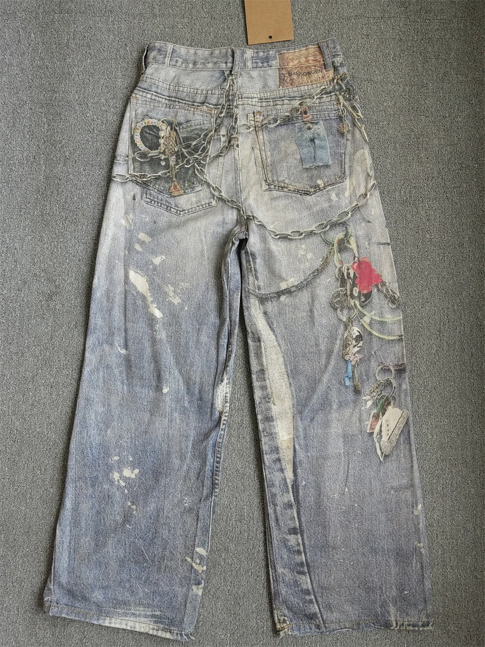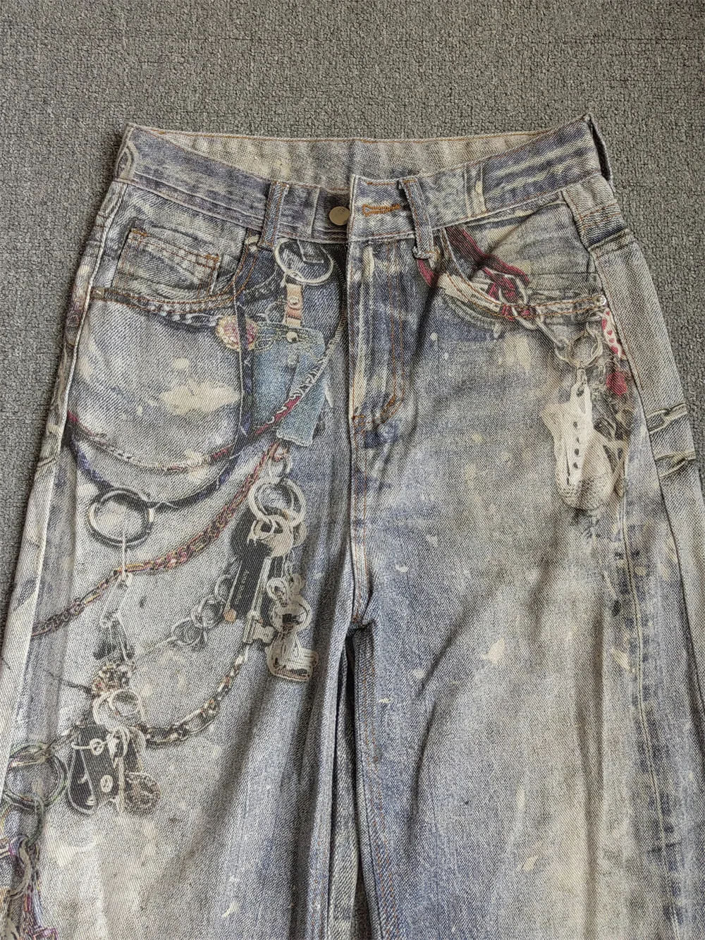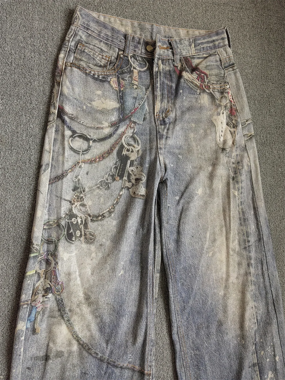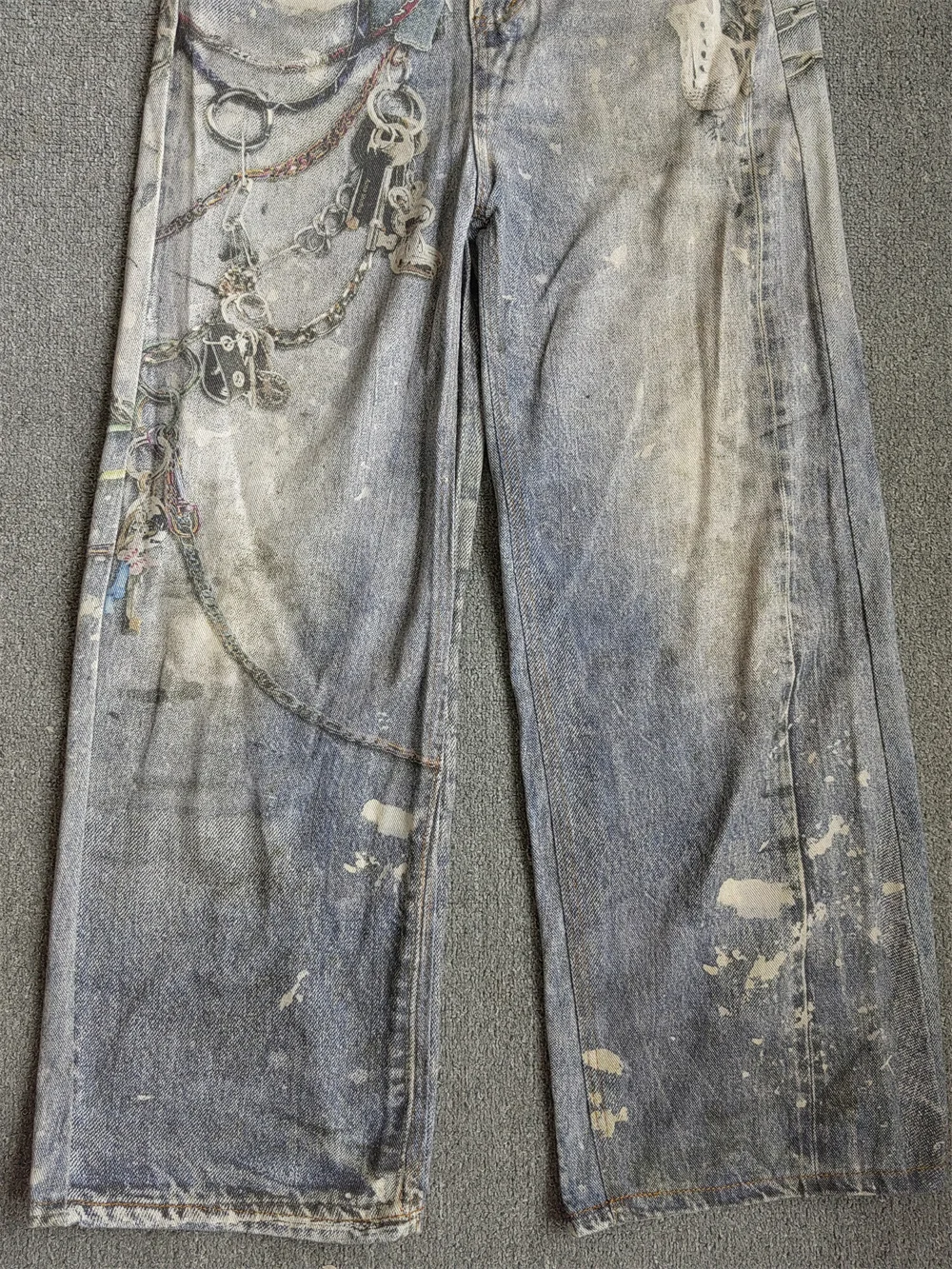 CHIC Streetwear Baggy Jeans for Men American Vintage 3D Painting Printed Washed Denim Pants Women Straight Wide Leg Trousers