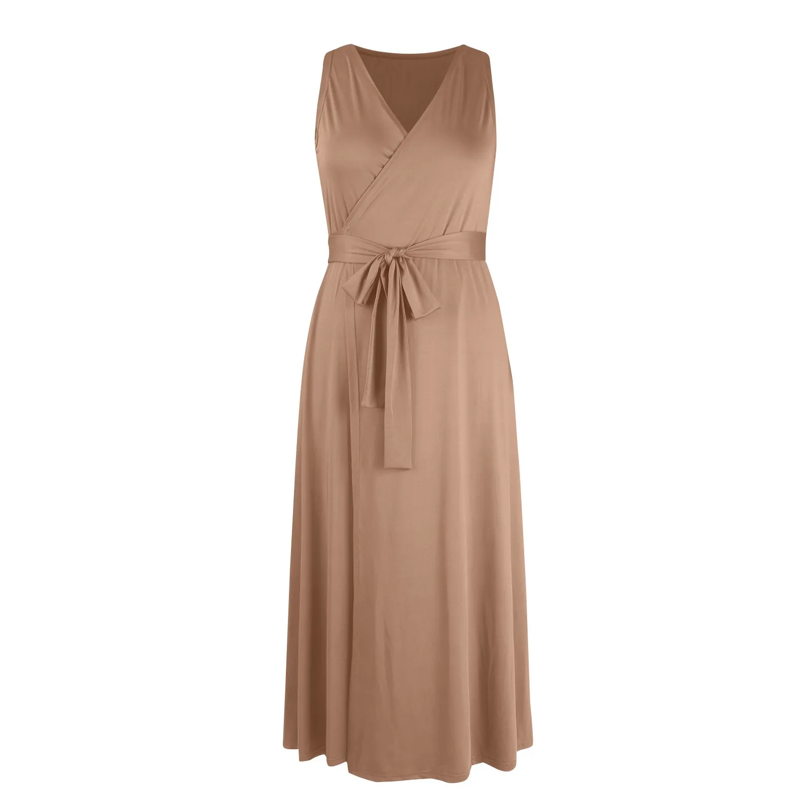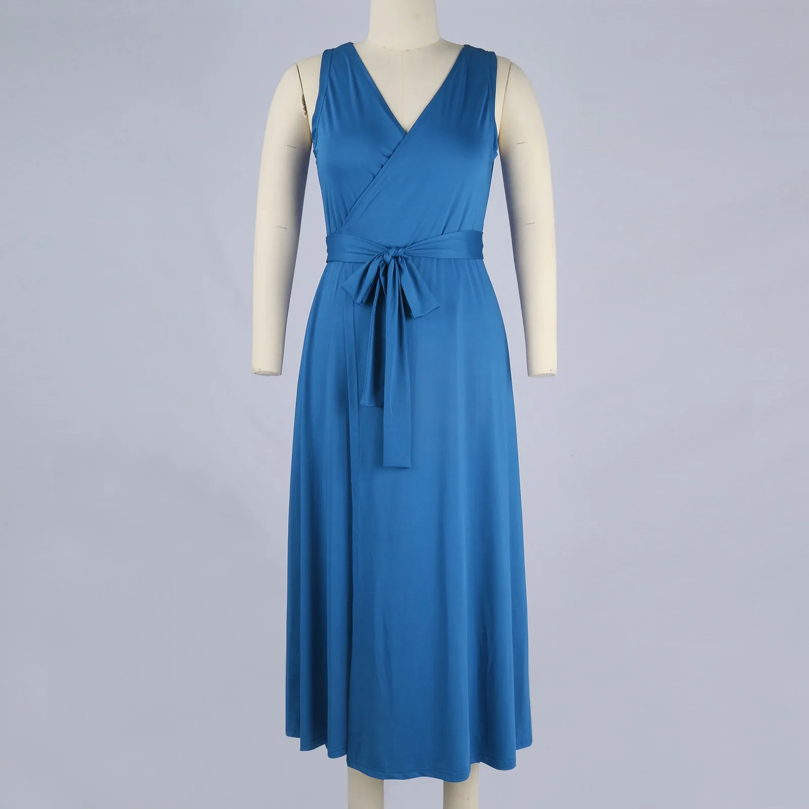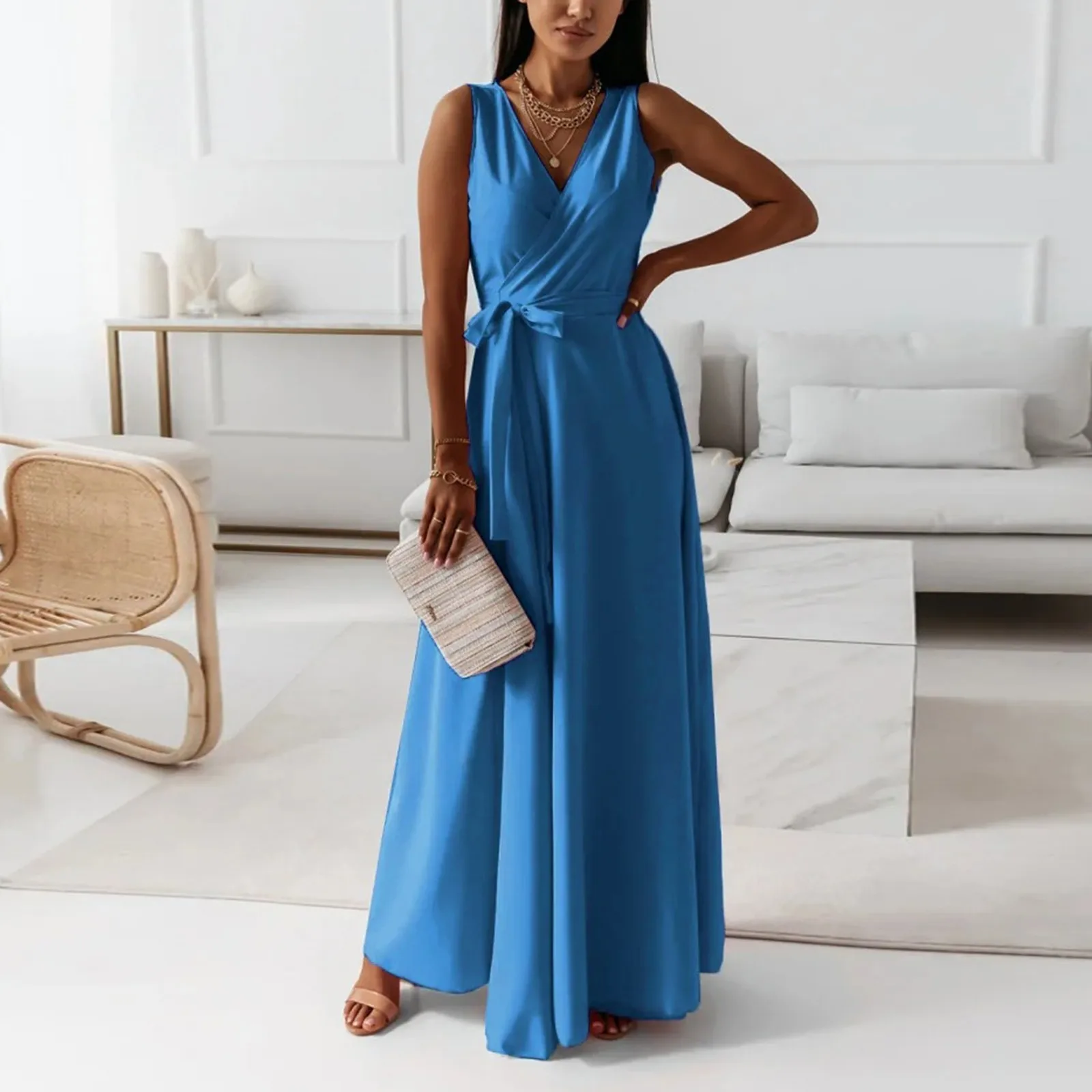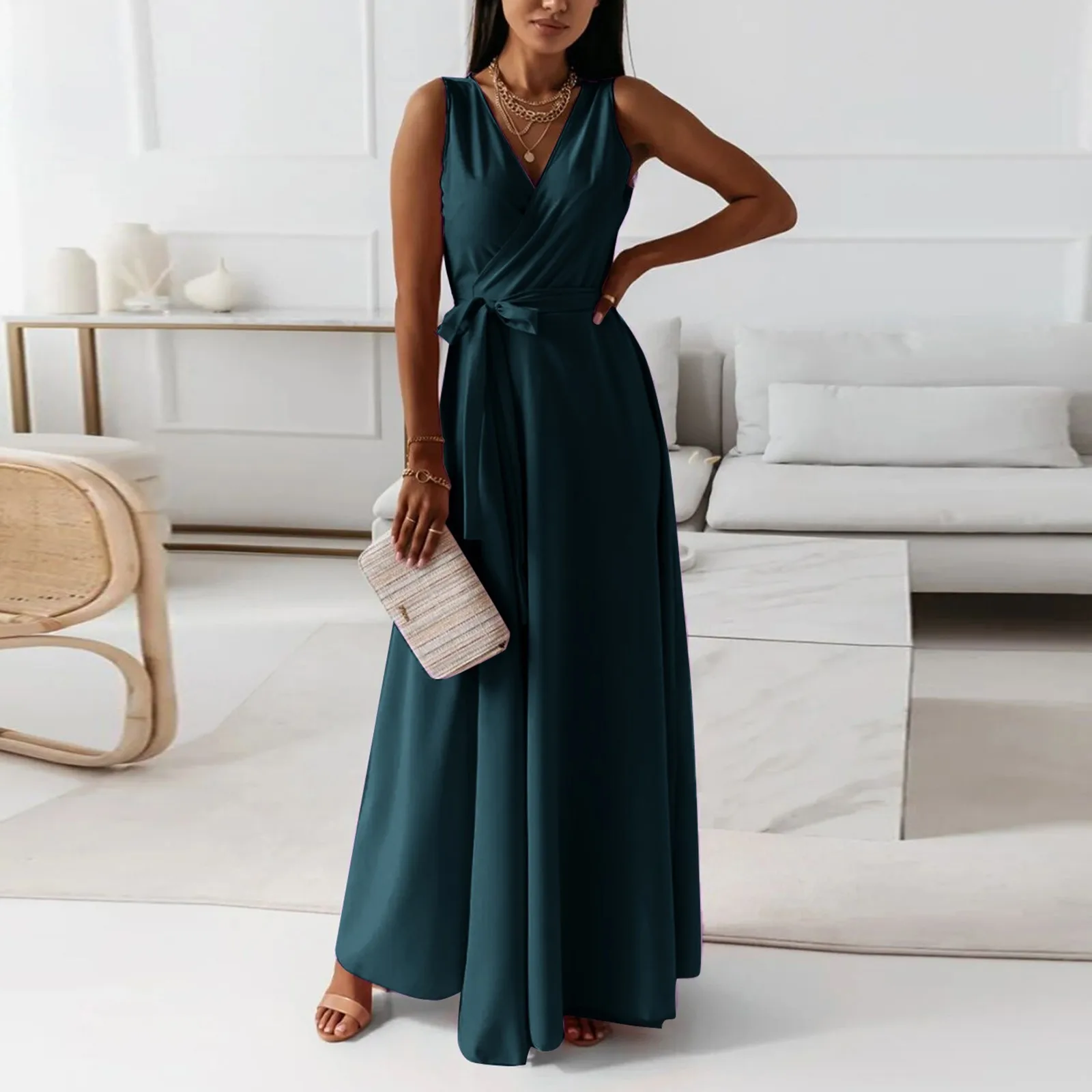Women's V-neck Sleeveless Belt Evening Long Dress For Women