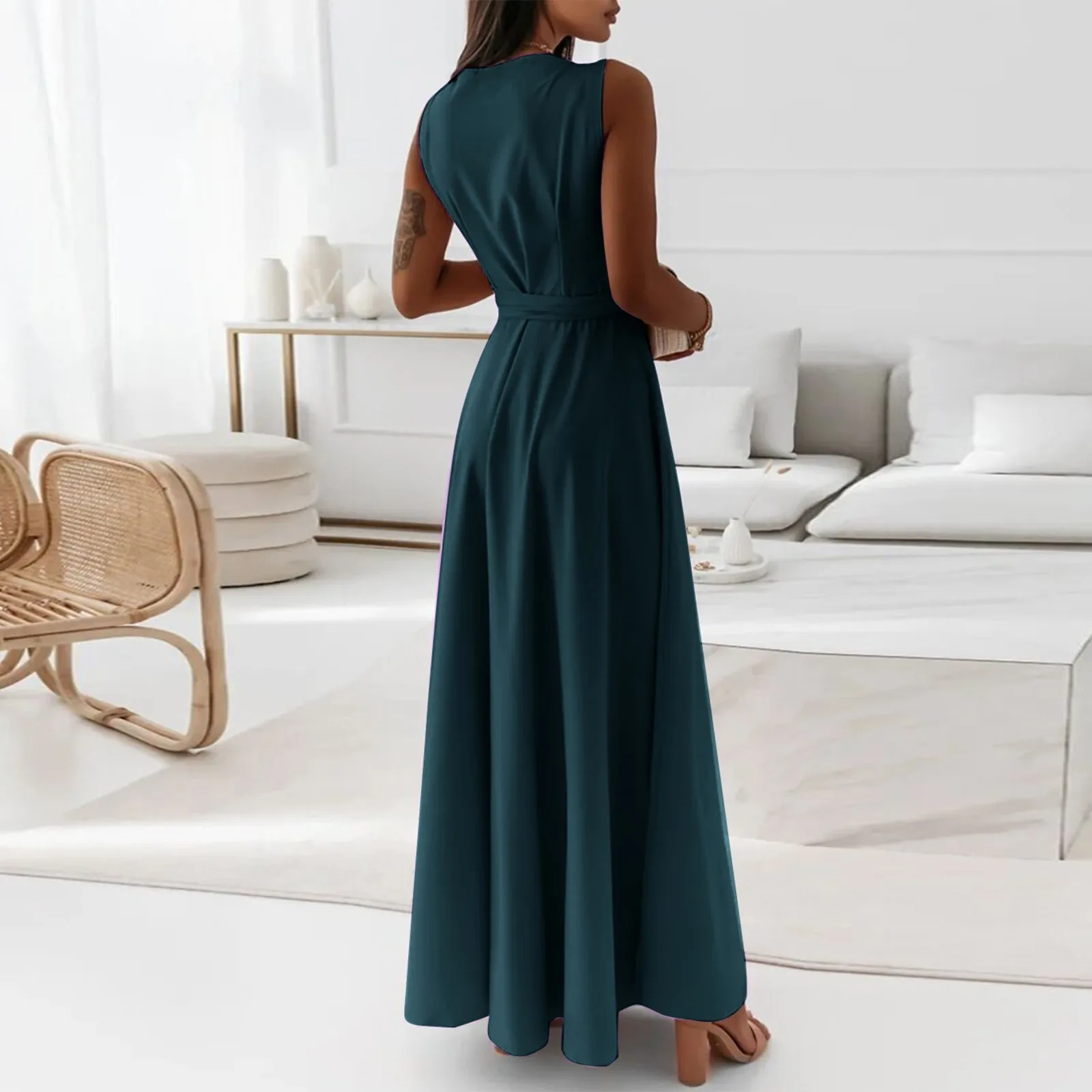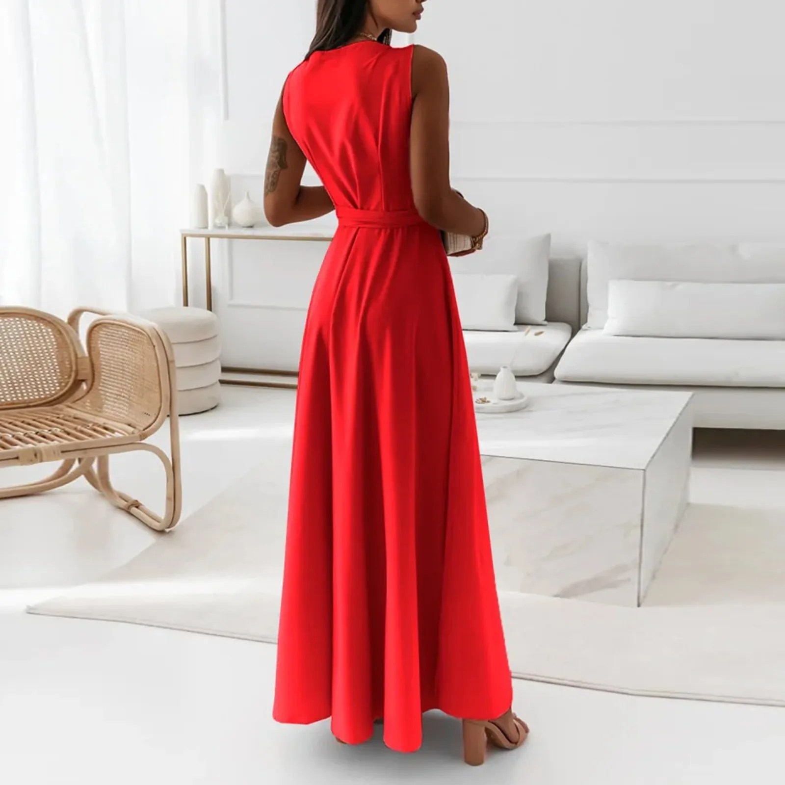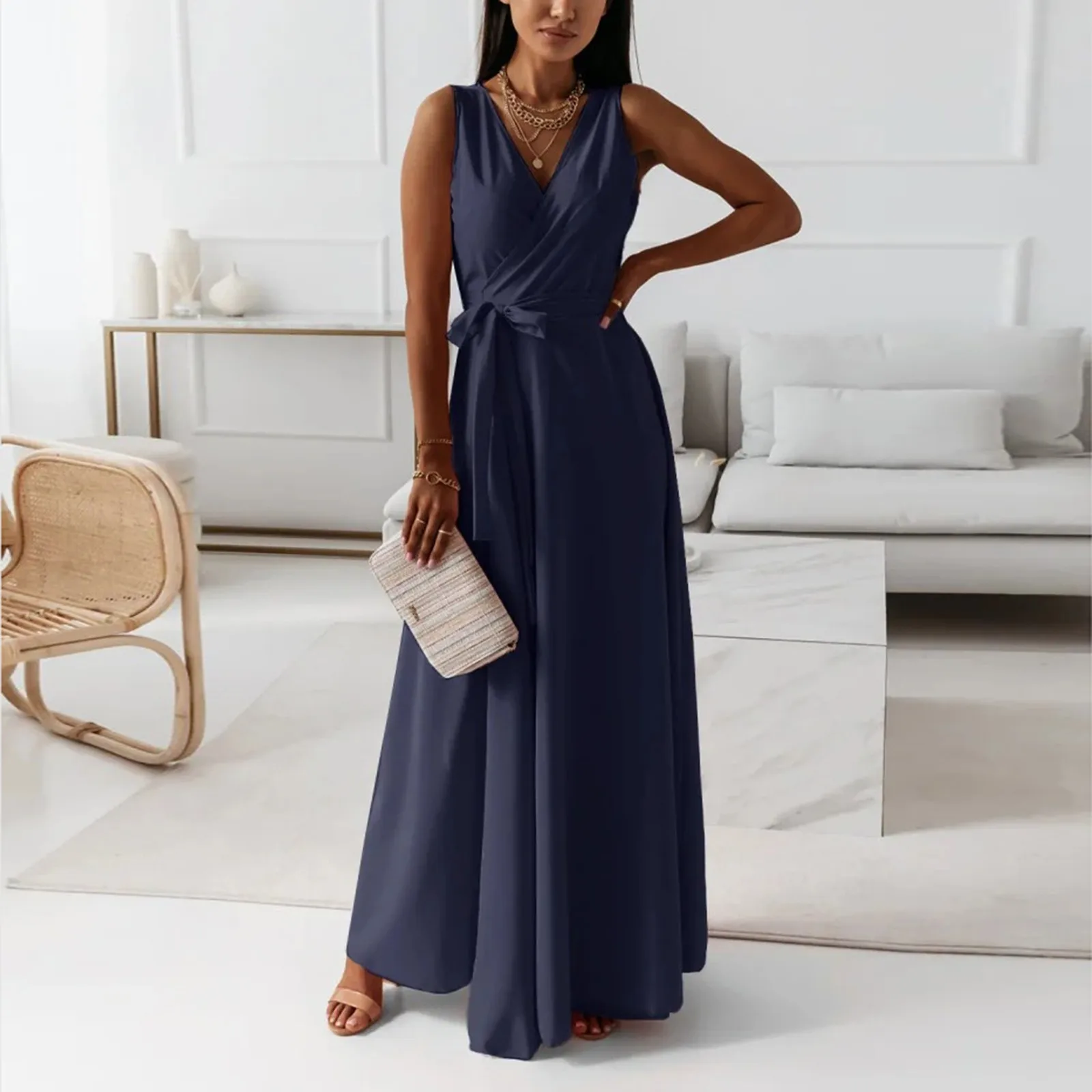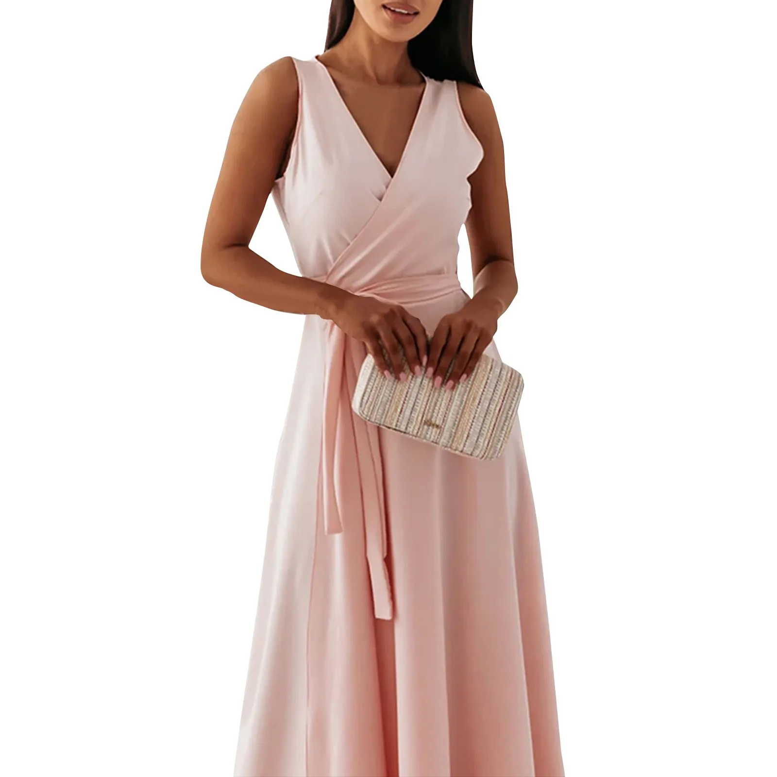 Women's V-neck Sleeveless Belt Evening Long Dress For Women