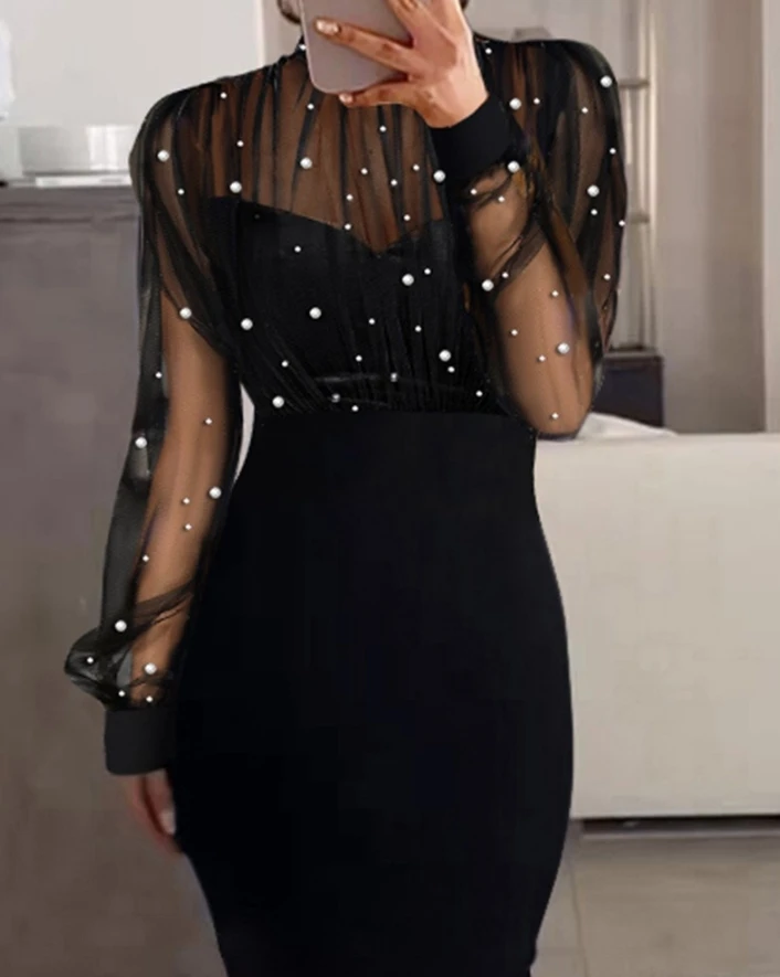 Elegant Party Dresses Woman Sexy Sheer Mesh Patch Beaded Bodycon Dresses Elegant Tight Urban Long Dress Fashion Women's Clothes