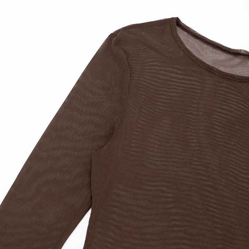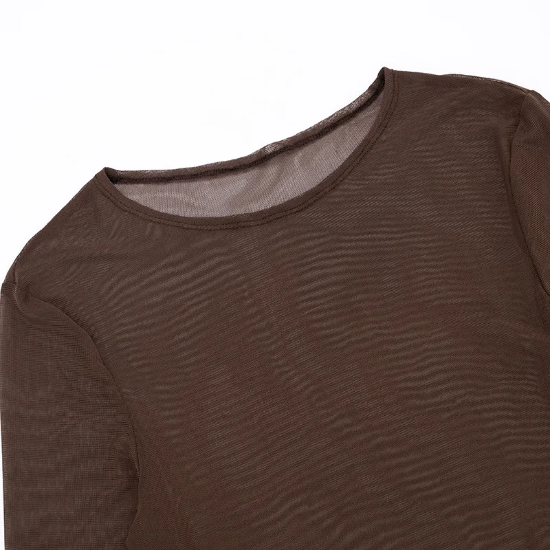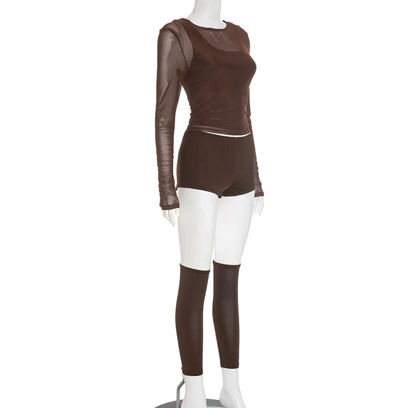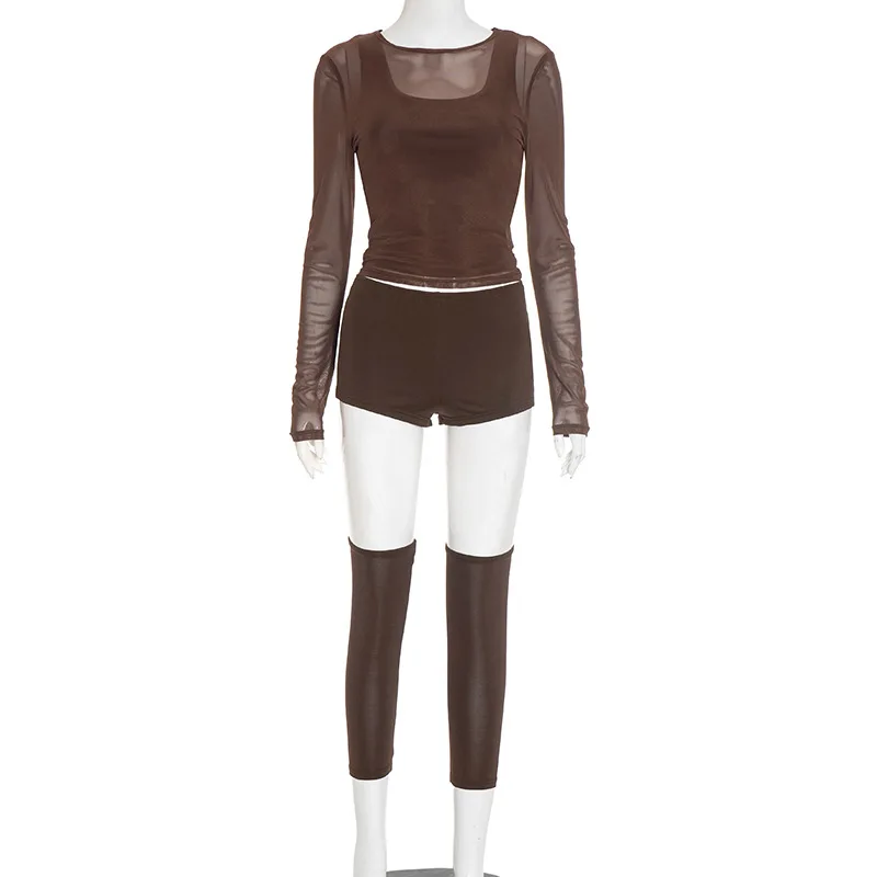 FAGADOER Sexy Mesh 4 Pieces Set for Woman Outfits Solid Color Long Sleeve Crop Top + Shorts Matching Female Streetwear Clothing