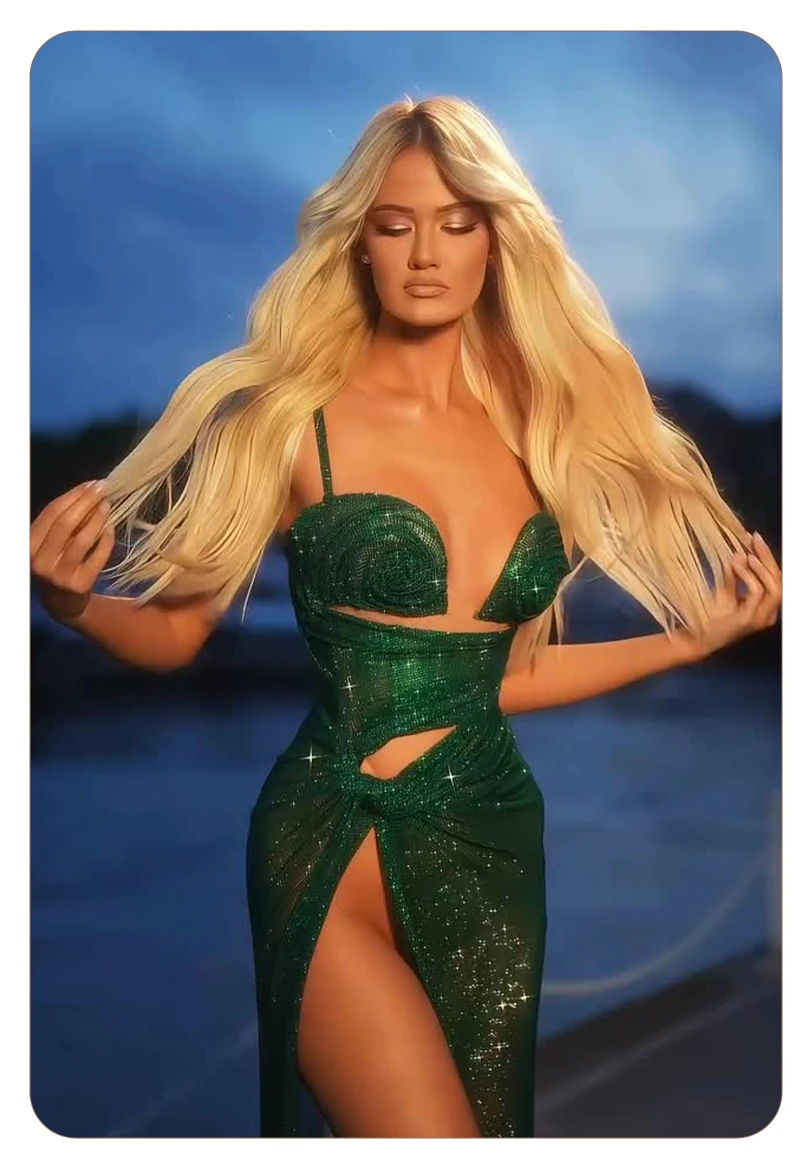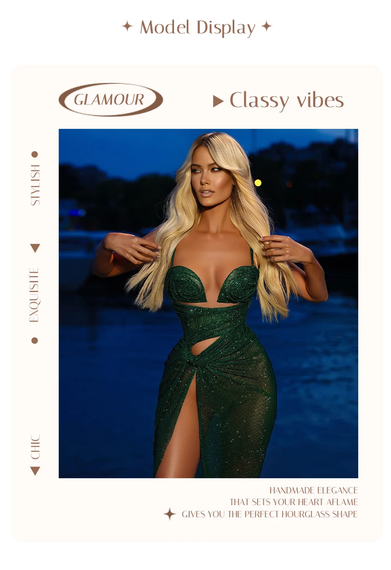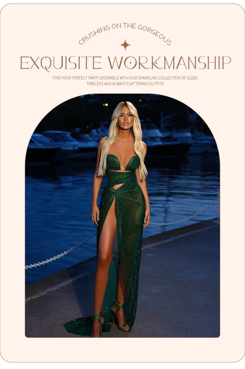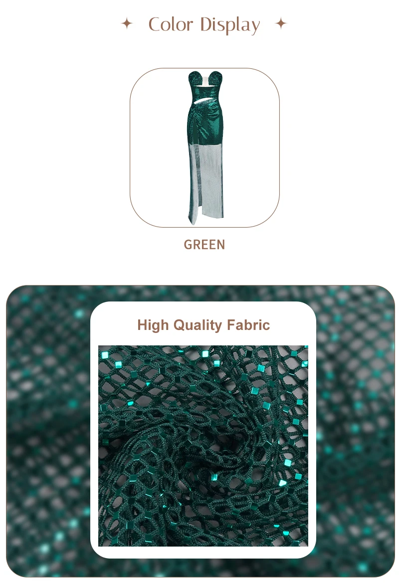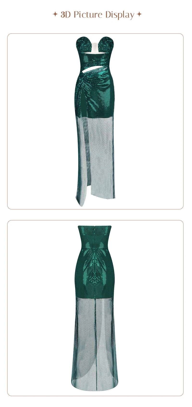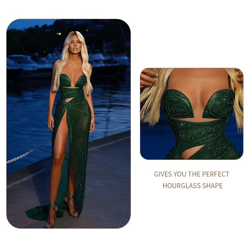 Glamorous Strapless Green Sequin Maxi Dress with Corset Style Bodice and Slit Party Evening Gown