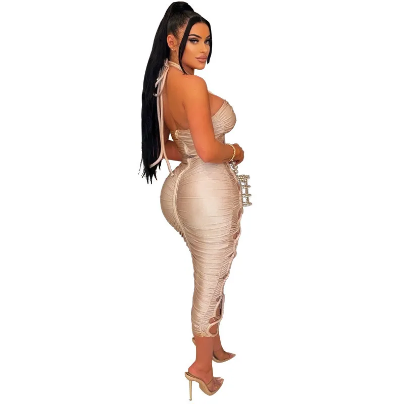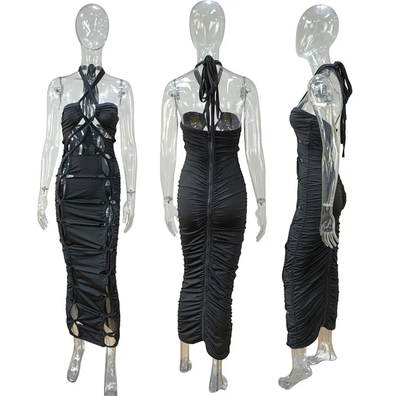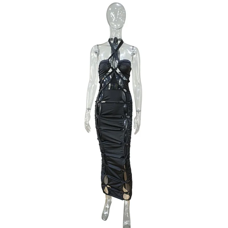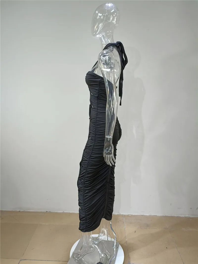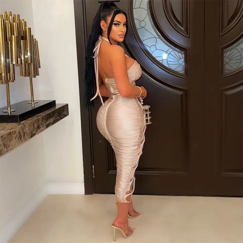 Green Hollow Out Halter Bodycon Dress Women Sleeveless Ruched Midi Sexy Outfits Party Club Bandage Y2K Dress Summer Fashion