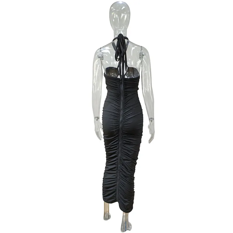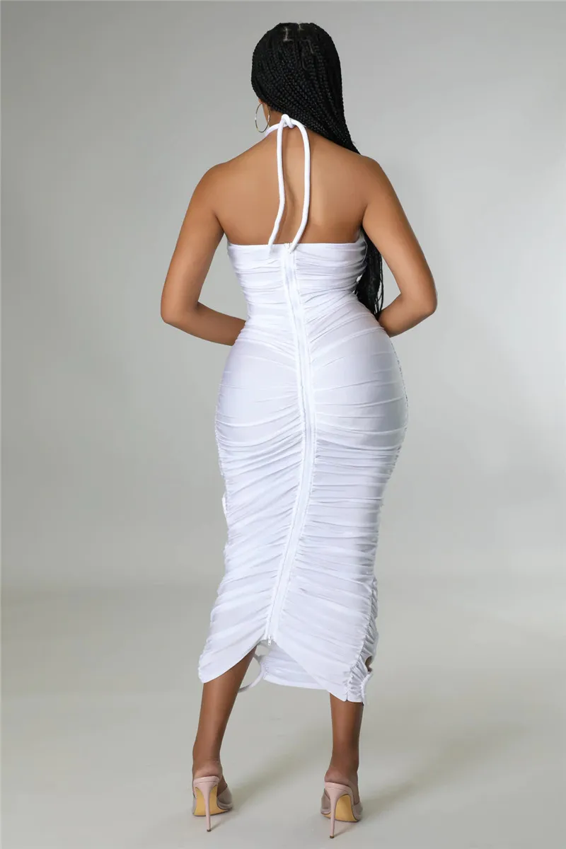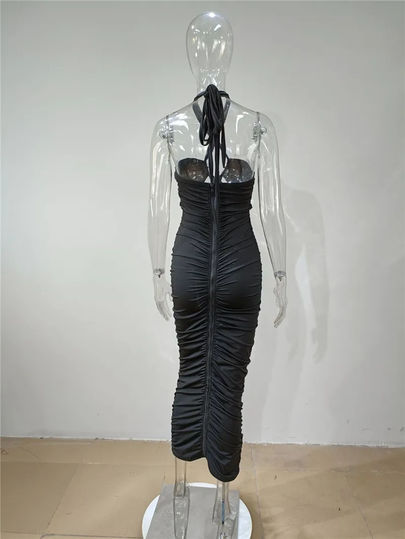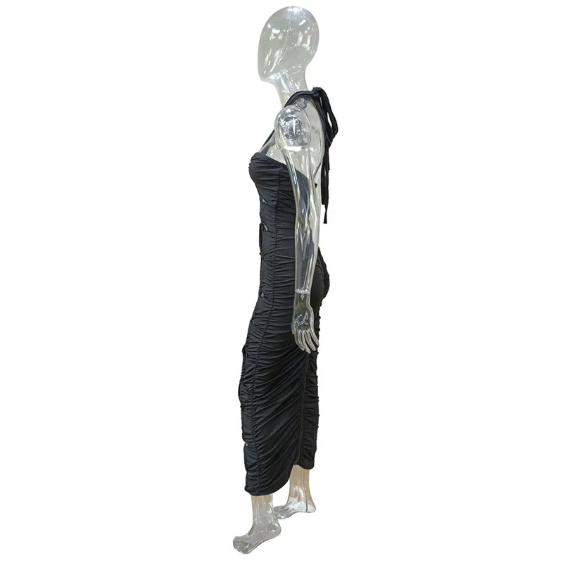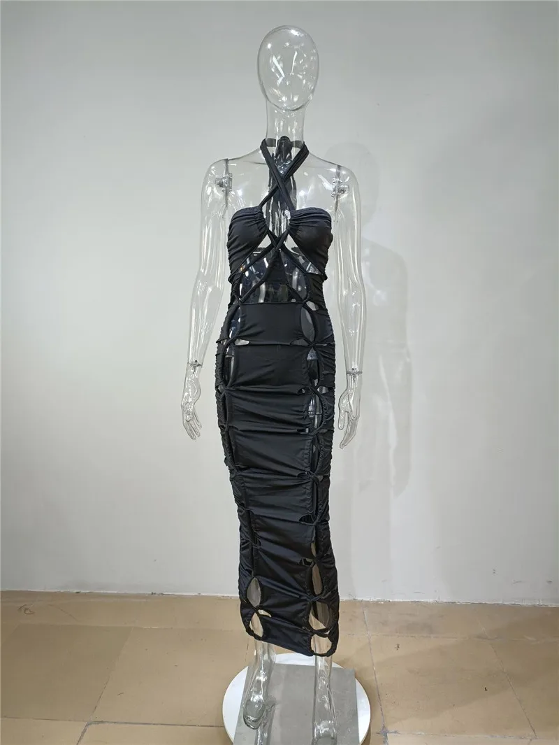 Green Hollow Out Halter Bodycon Dress Women Sleeveless Ruched Midi Sexy Outfits Party Club Bandage Y2K Dress Summer Fashion