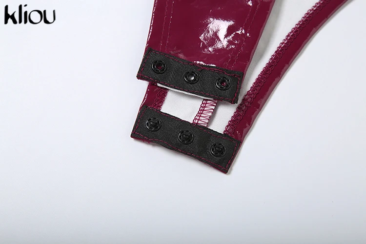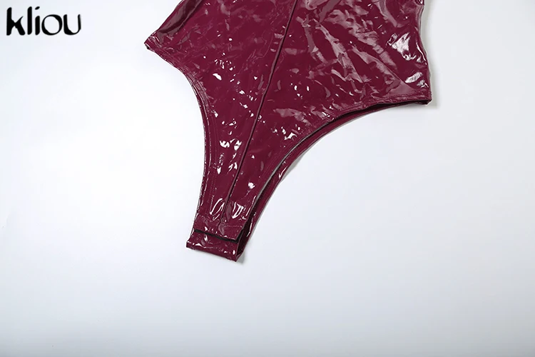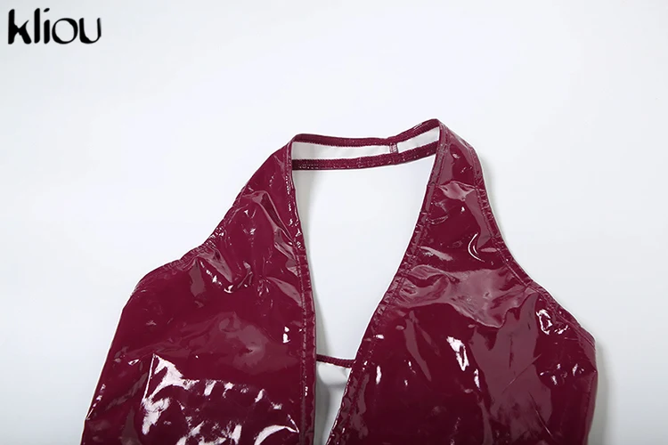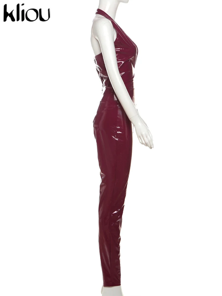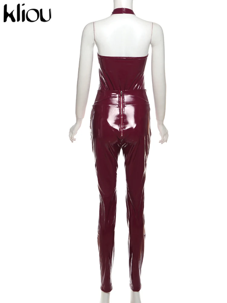 kliou Leather Solid Women 2 Piece Set Concise Halter V-neck Backless Bodysuits+Zip-up Matching Pants Female Coordinate Outfits