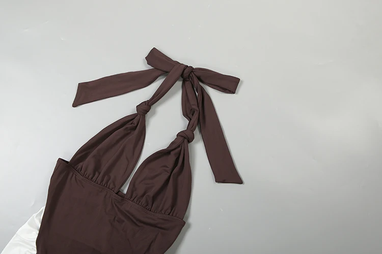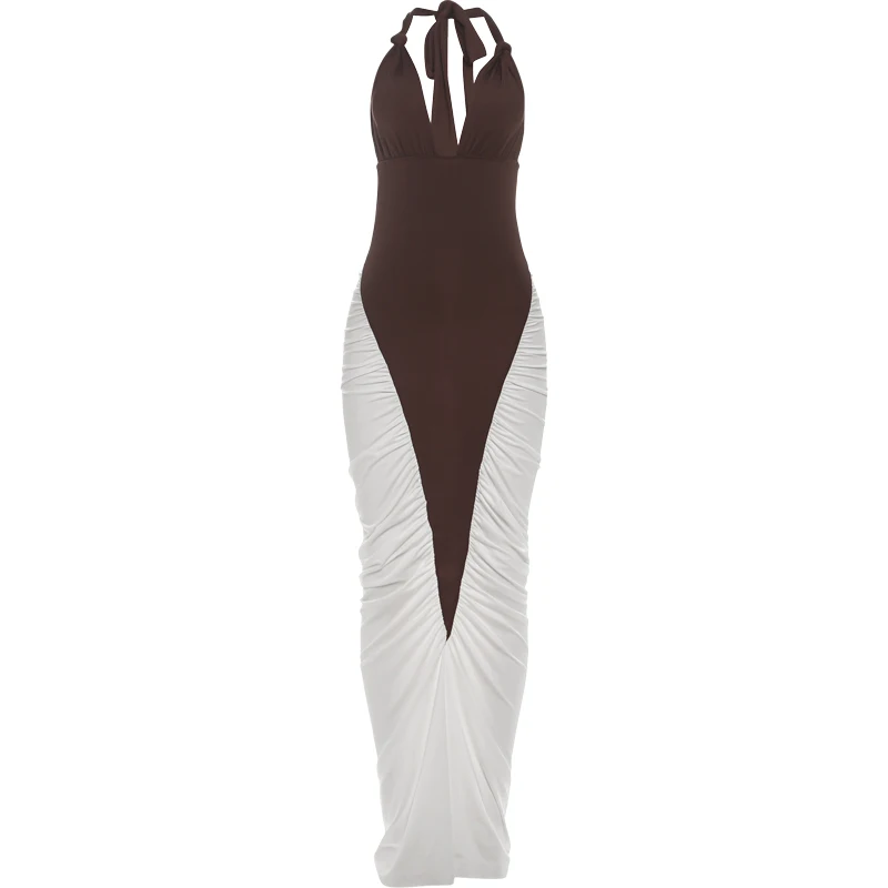 Kliou Ruched Elegant Long Dress Woman Halter Low-Neck Backless Contrast Patchwork Robe Midnight Banquet Party Classic Vestidos