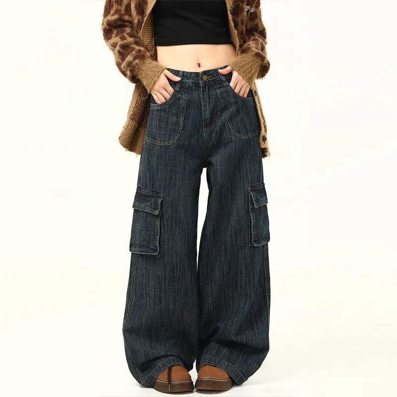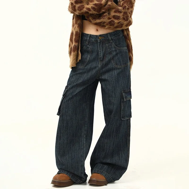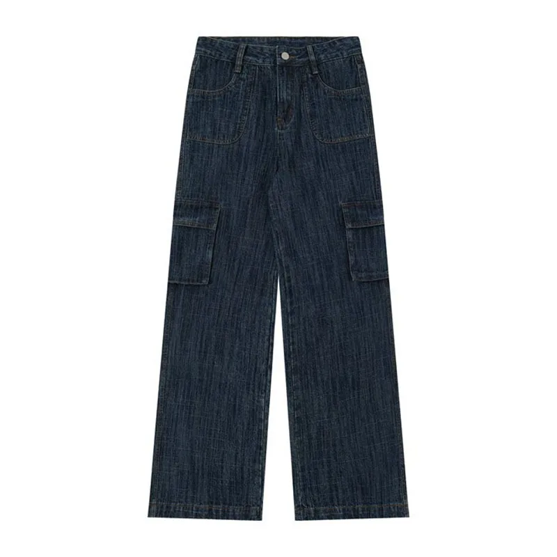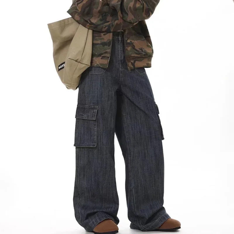 Korean Retro Men'S Loose Wide Leg Jeans High Street Straight Leg Pants Casual Jeans Multi Pocket Work Pants