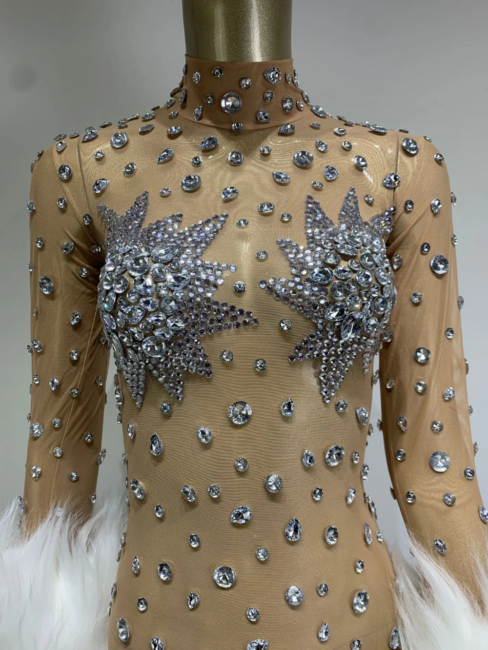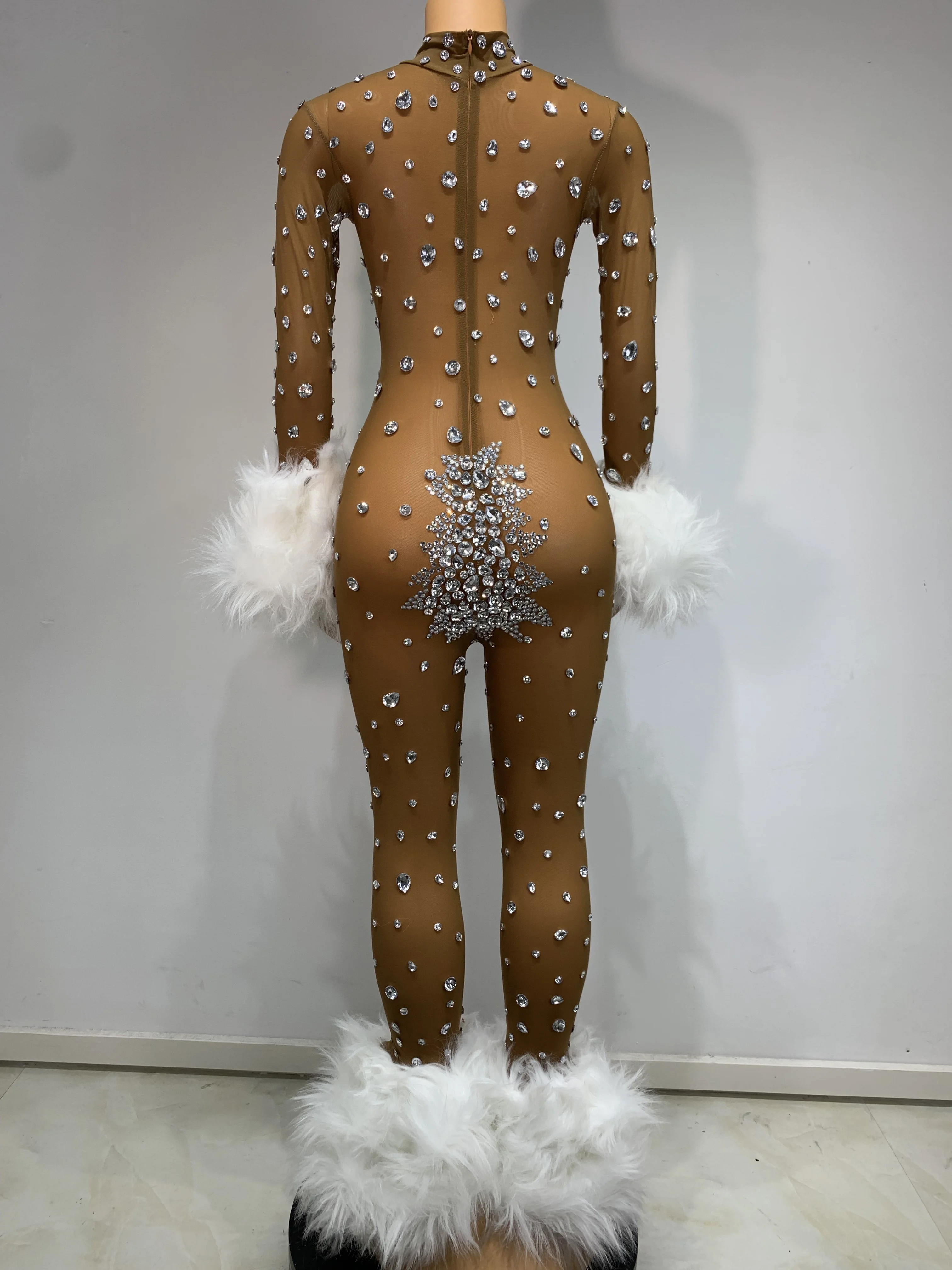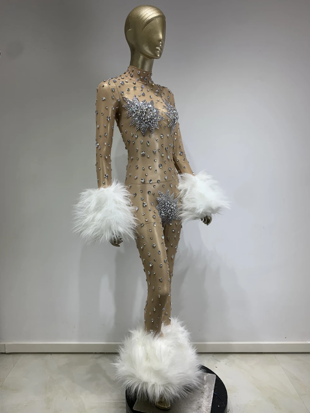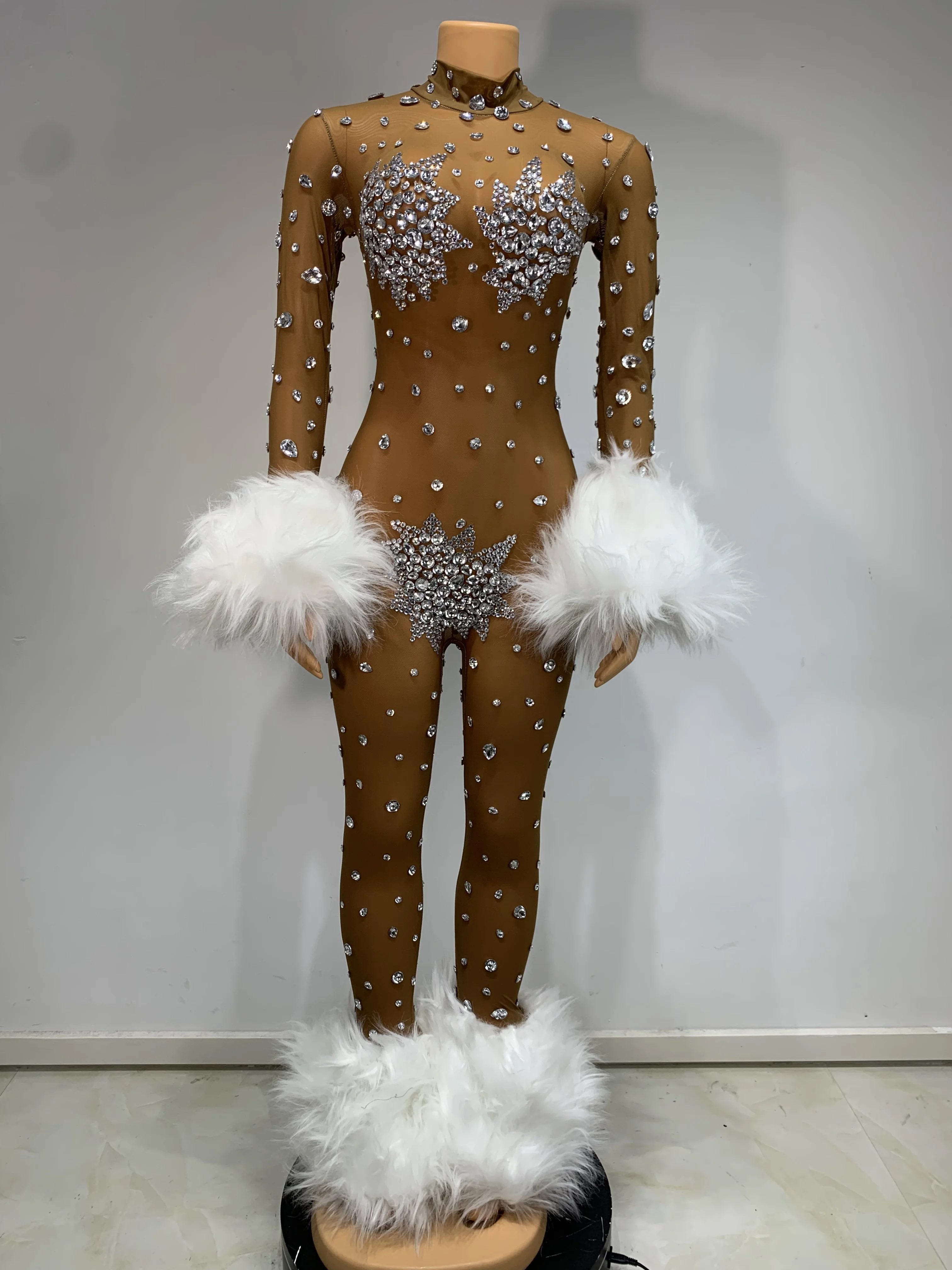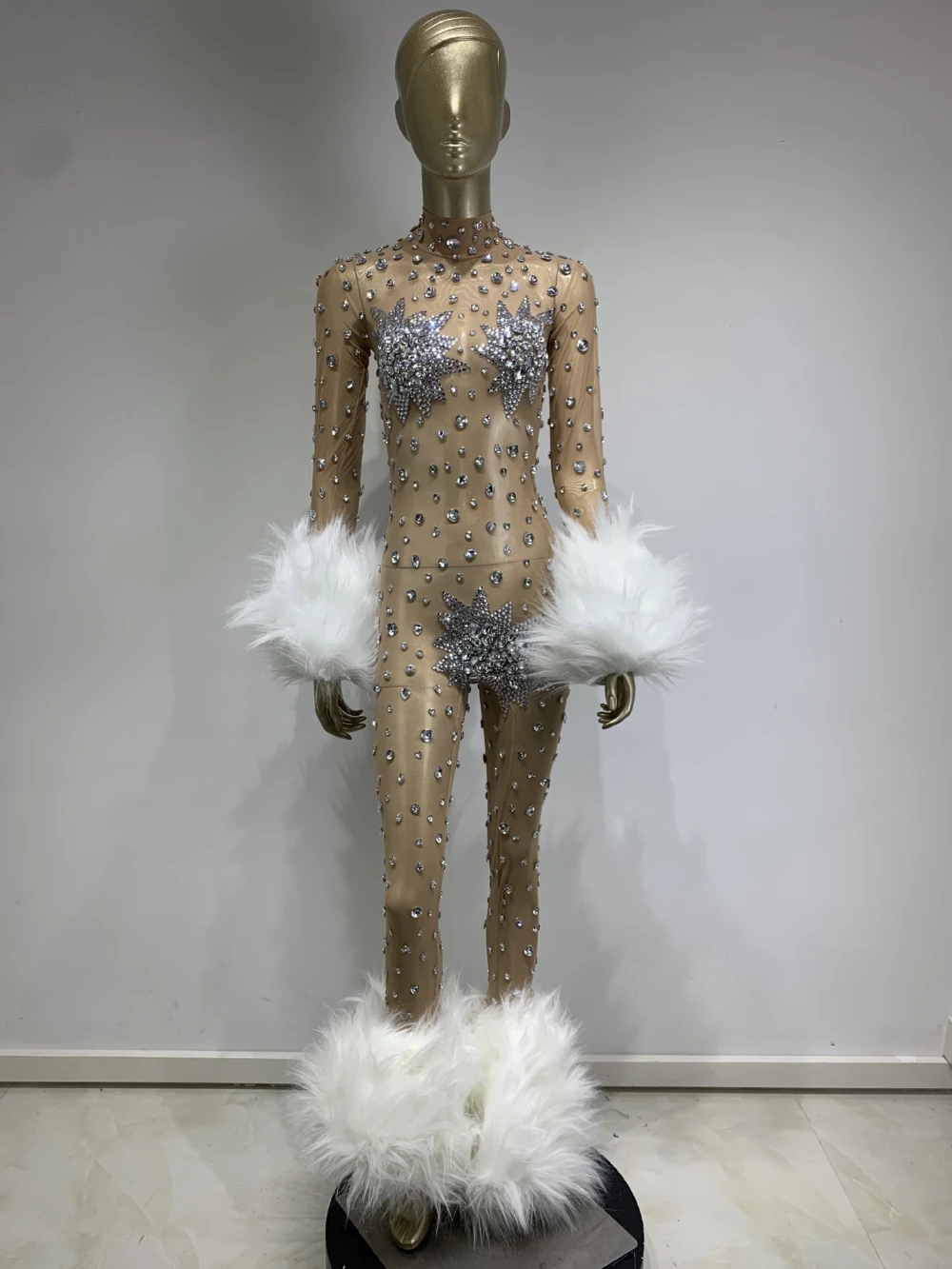 Luxury Rhinestone Feather Stretch Jumpsuit Nightclub Performance Dancer Stage Costume Sexy Mesh Long Sleeve Women's Outfit