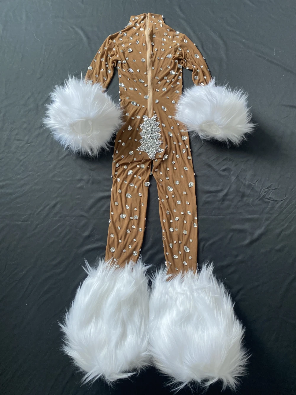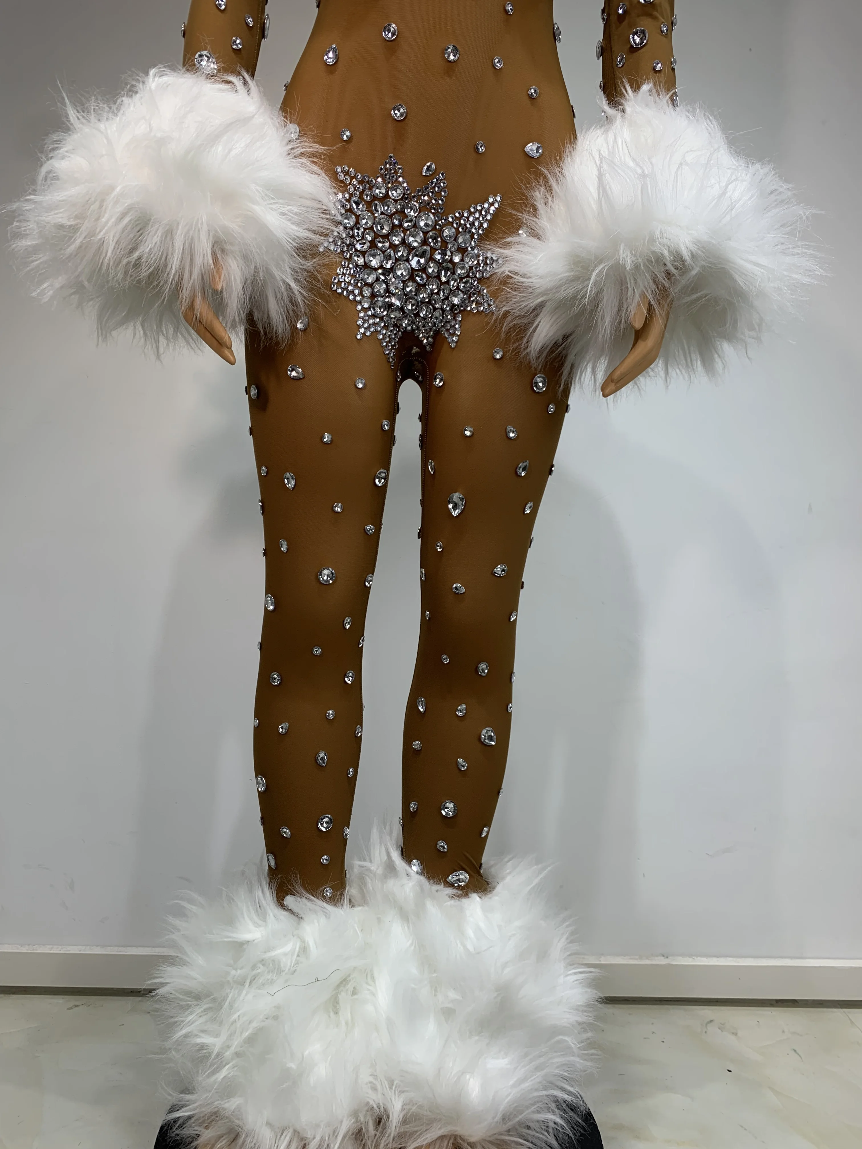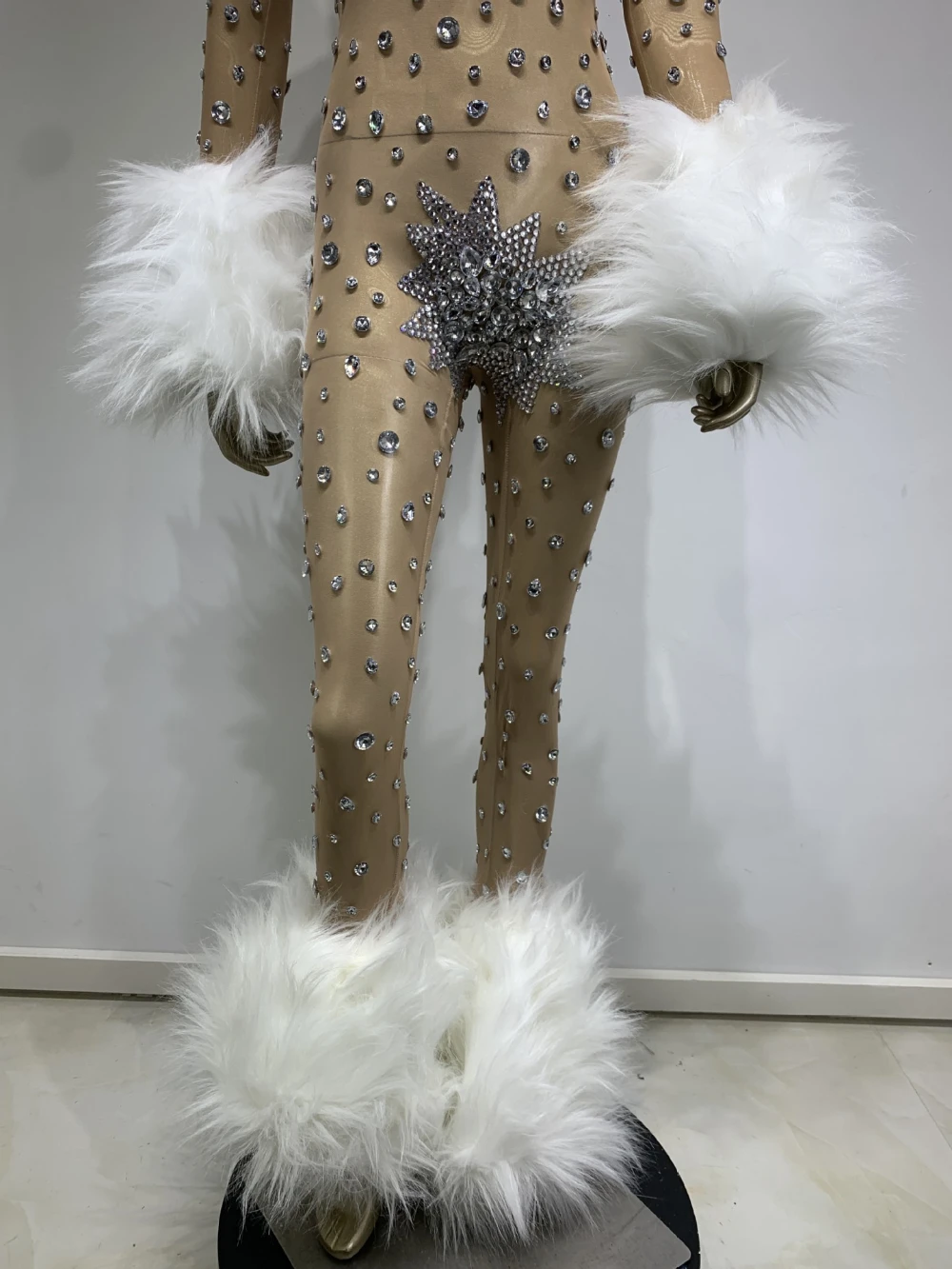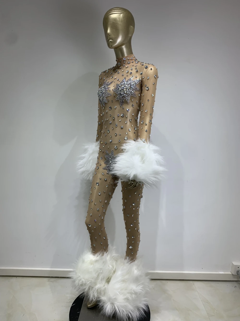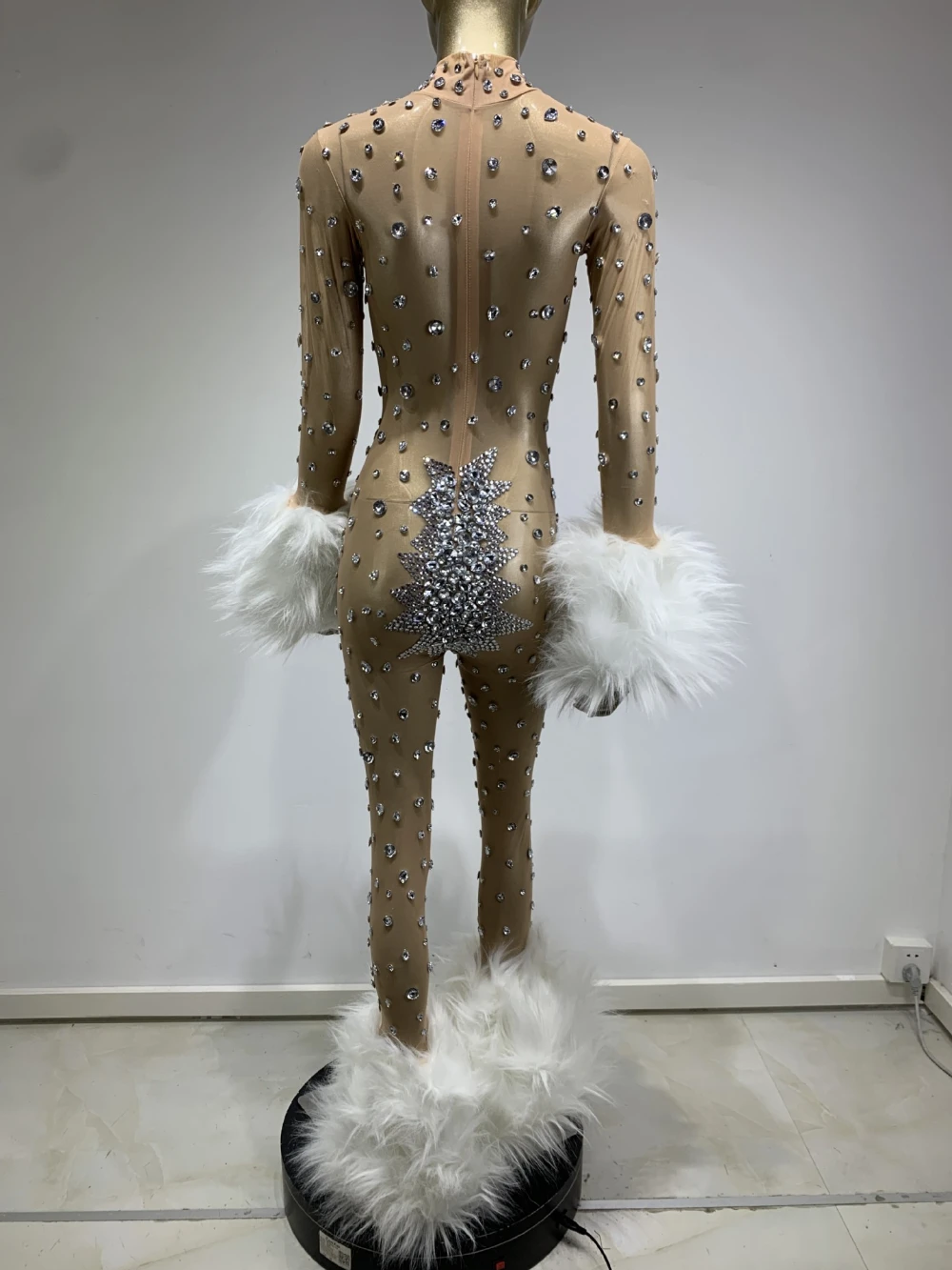 Luxury Rhinestone Feather Stretch Jumpsuit Nightclub Performance Dancer Stage Costume Sexy Mesh Long Sleeve Women's Outfit