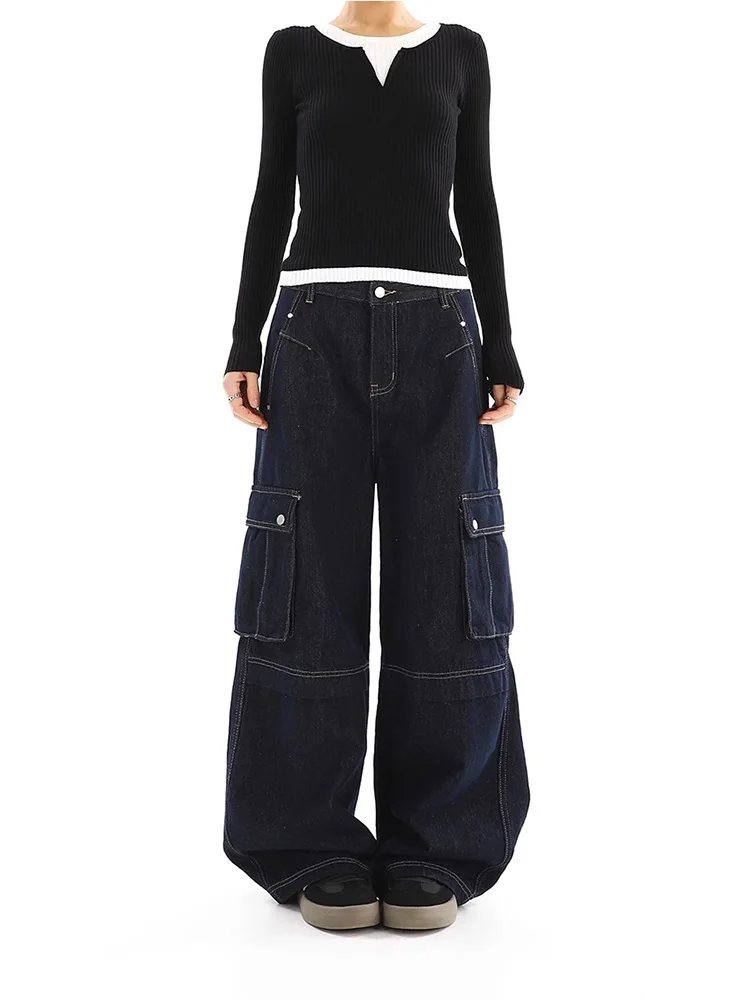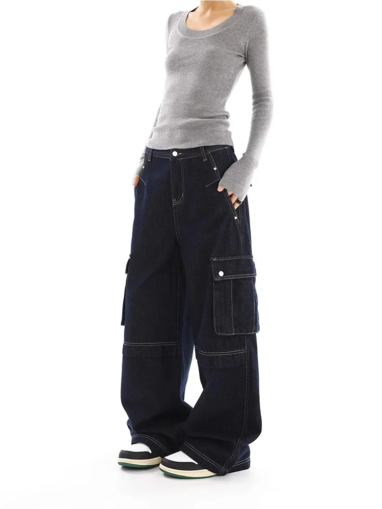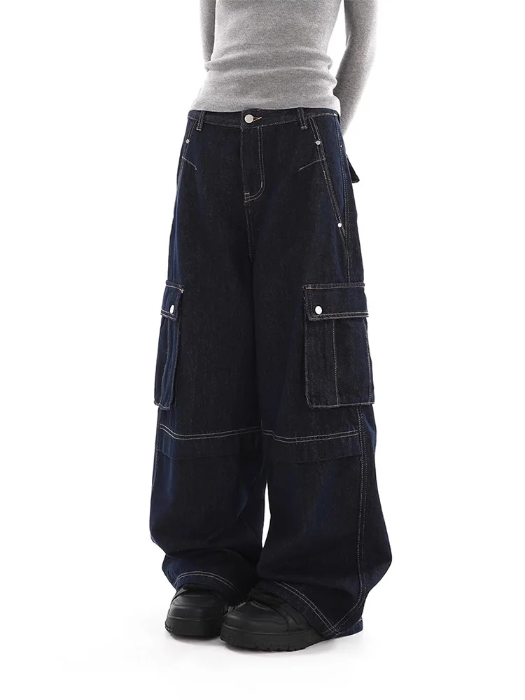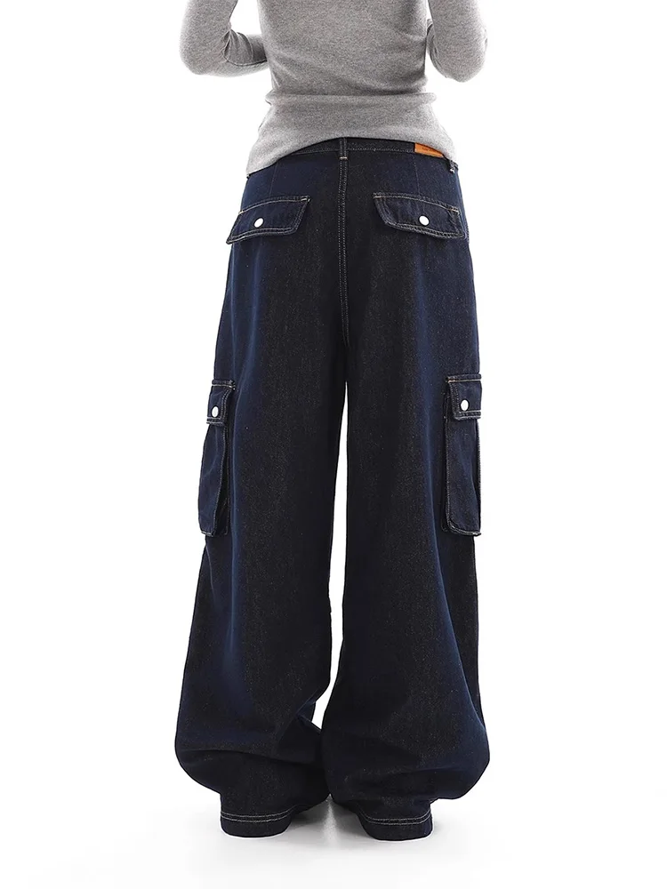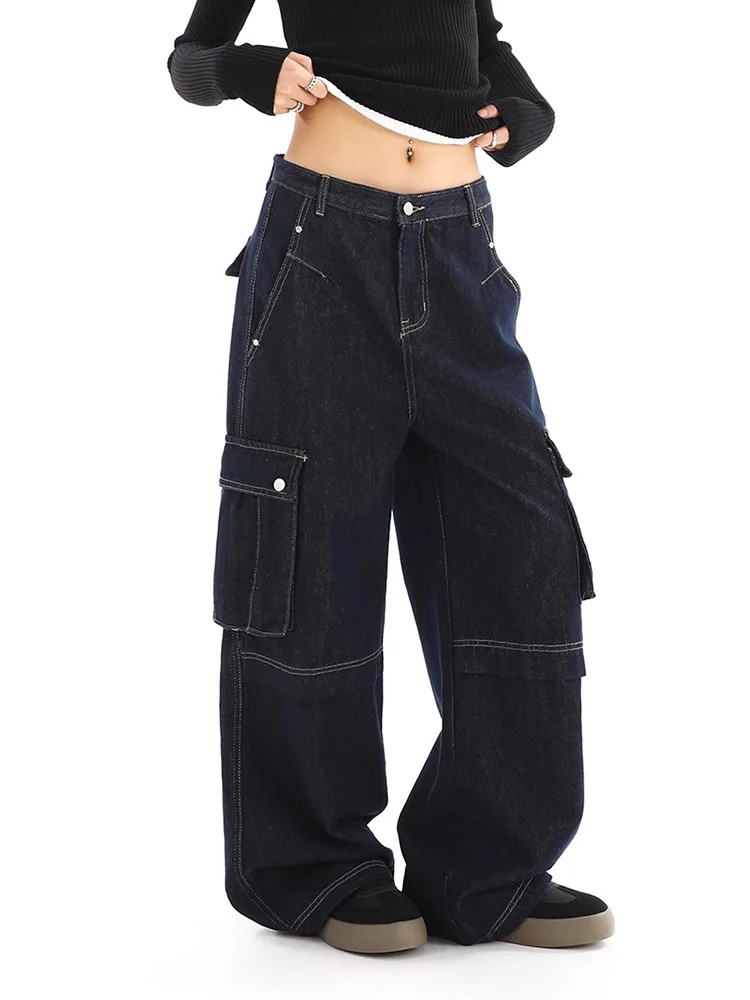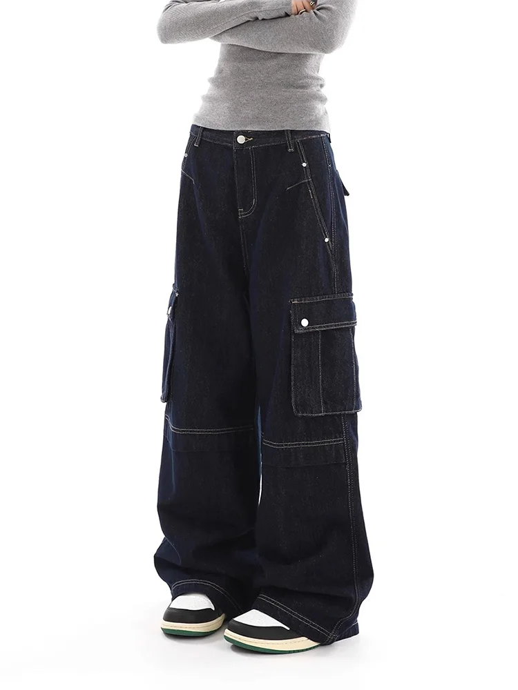 Retro Multi-pocket Jeans Women High Street Trend Denim Cargo Pants Baggy High-waisted Straight Wide-leg Denim Trousers