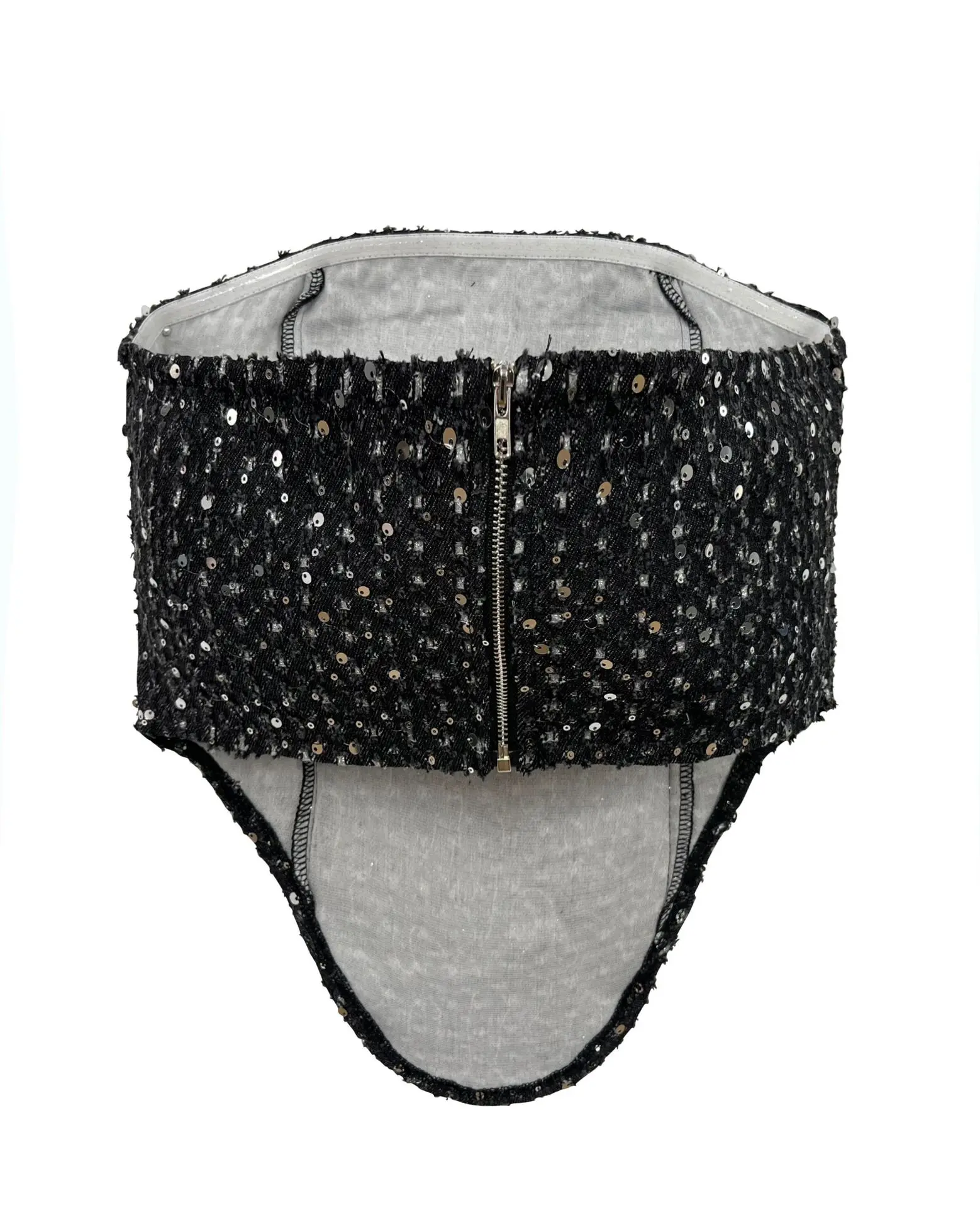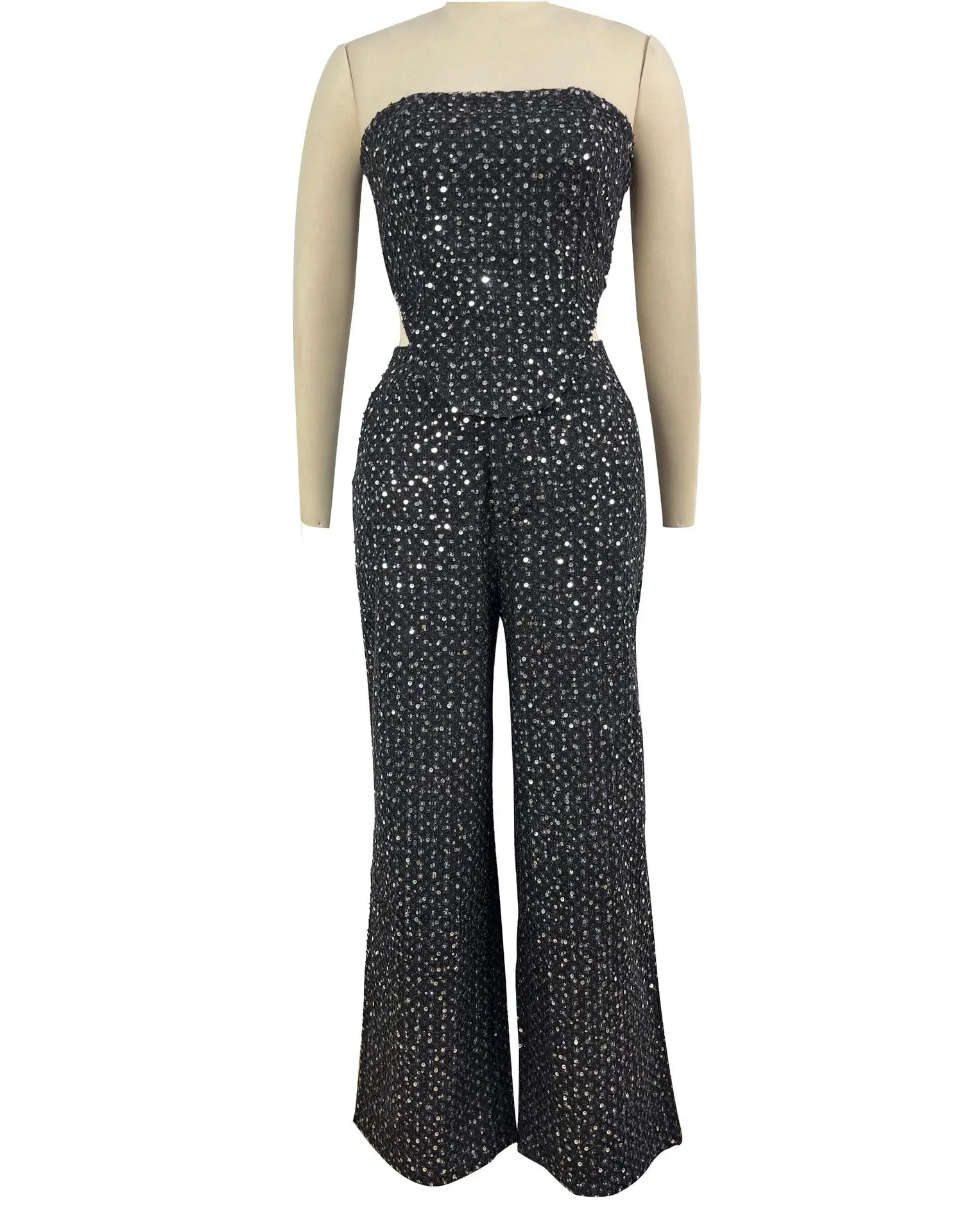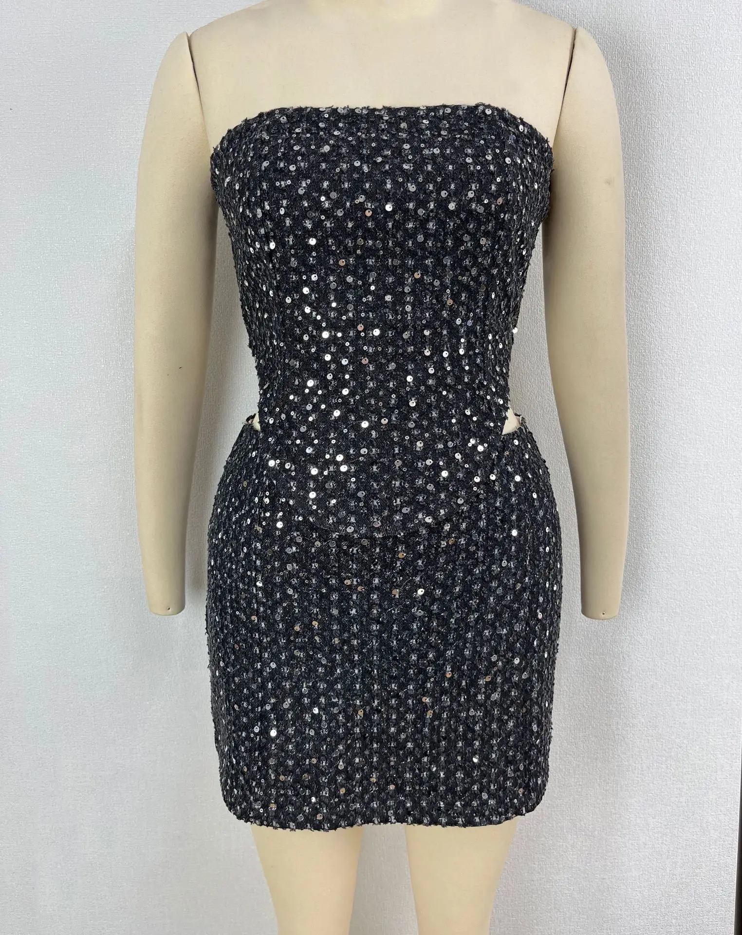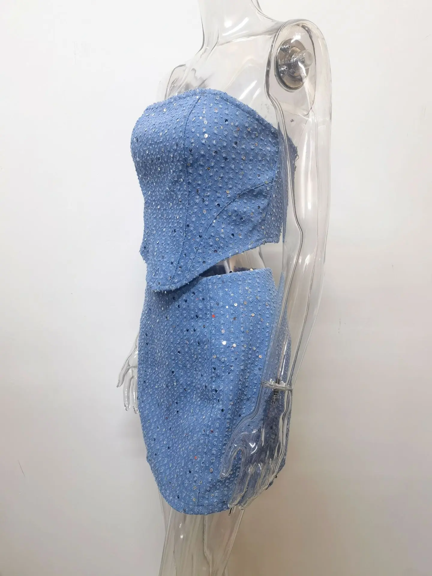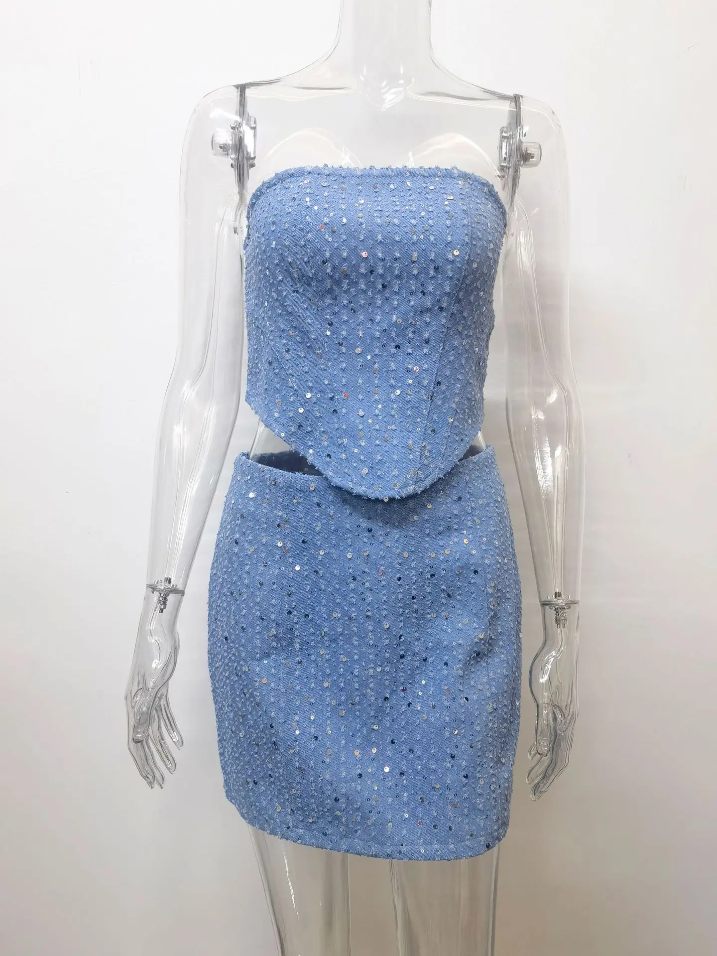Sequins Denim Skirts Sets for Women Summer Strapless Corset Crop Tops&Hole High Waist Skirts Sequins Two Piece Sets Party Club