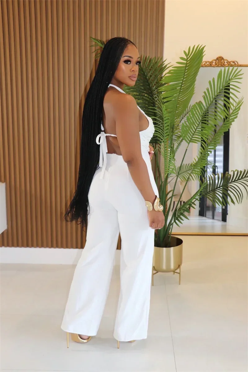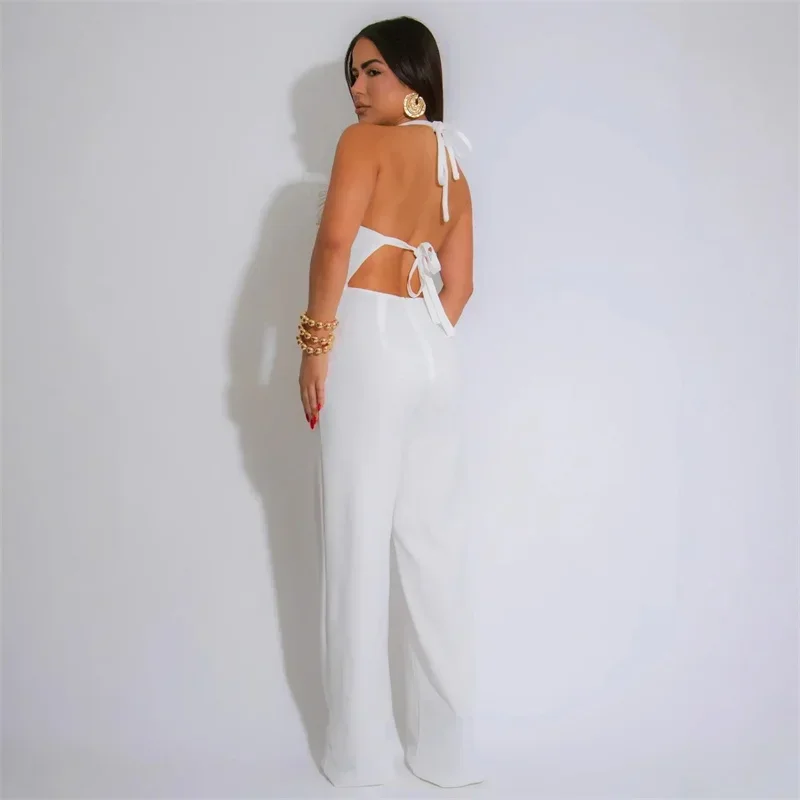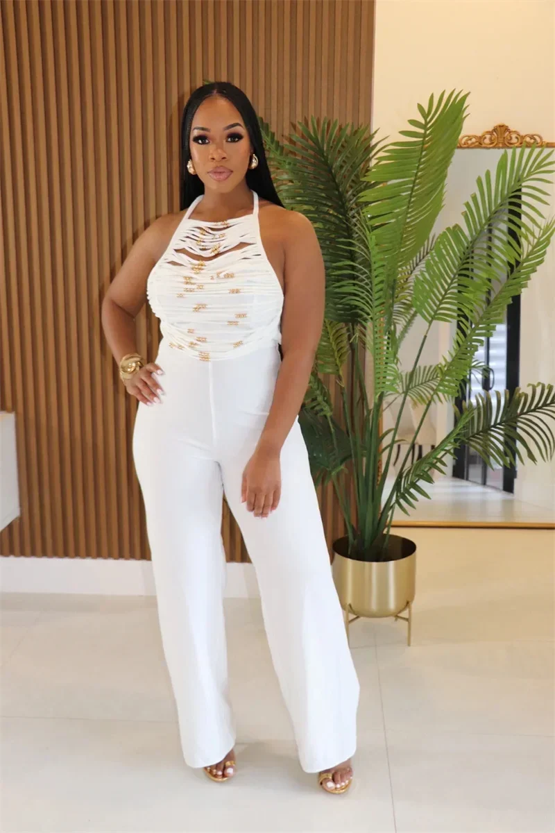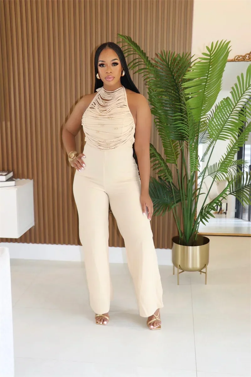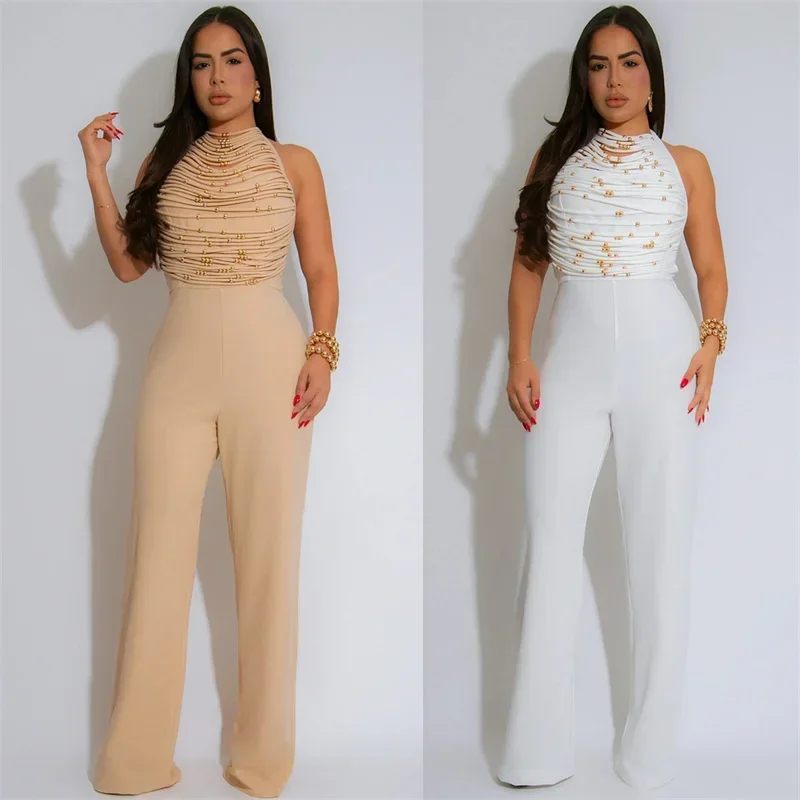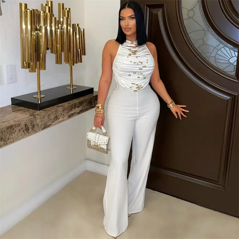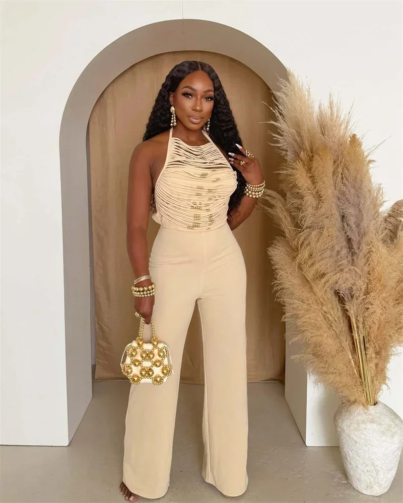 Sexy Halter Backless Jumpsuit Women Elegance High Waist Flare Pants Sleeveless Beading Ruched Party Romper Club Birthday Outfits