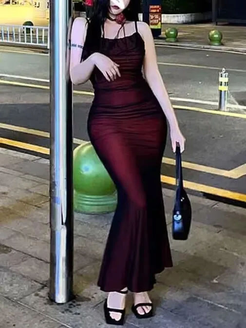 Sexy Luxury Woman Evening Dress Red Mesh Gothic Elegant Party Bodycon Dresses Maxi Dress Chic Female Night Club Outfits