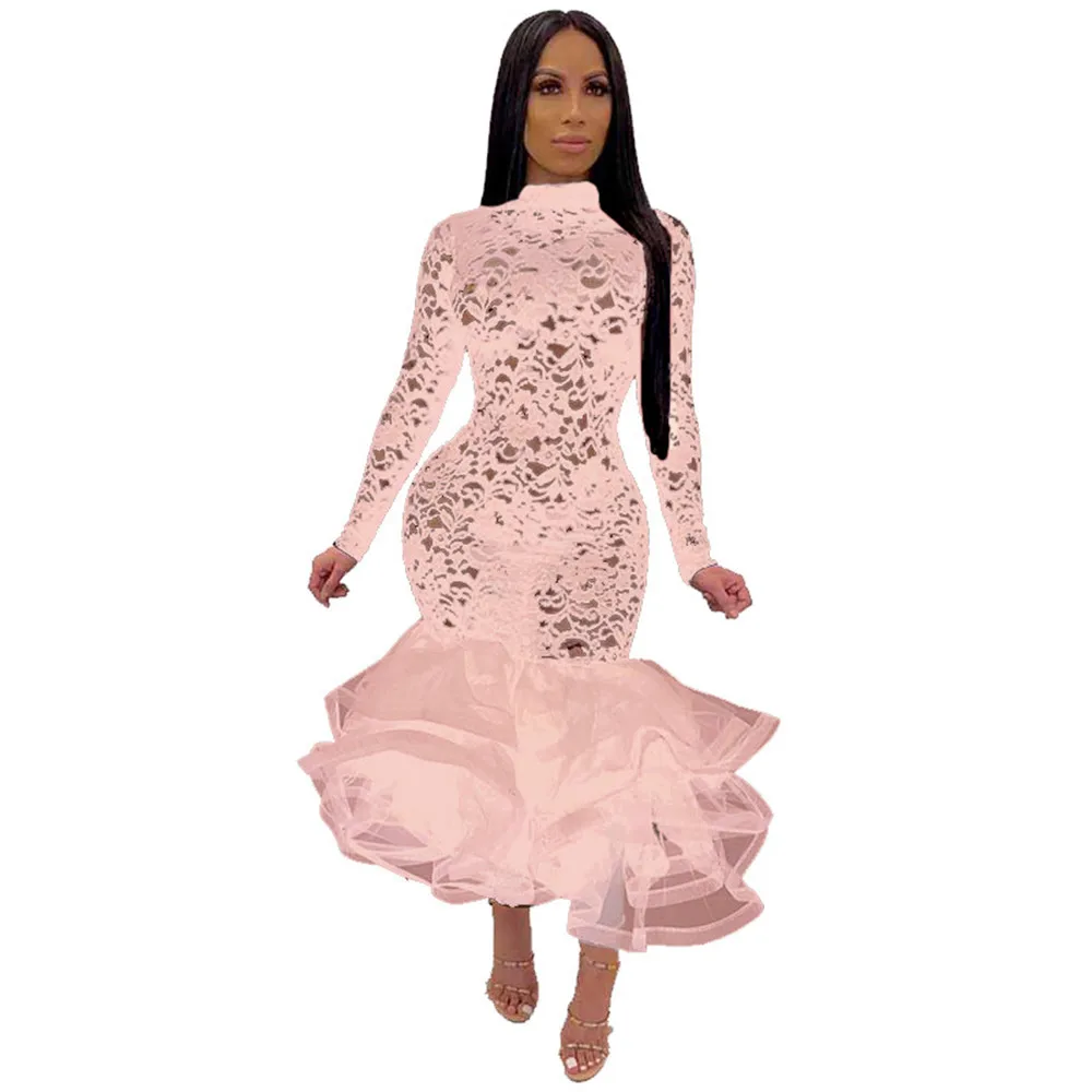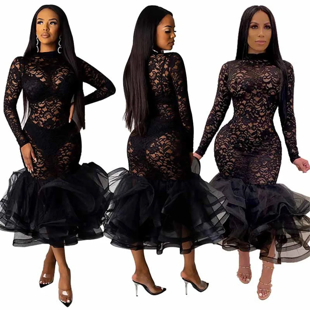 Sexy Night Party Wedding Evening Lace Dress Women See-through Hollow Out Cascading Ruffle Mermaid Bodycon Midi Dress Vestidos