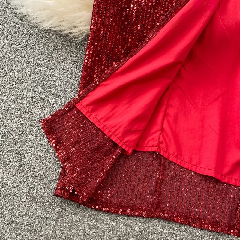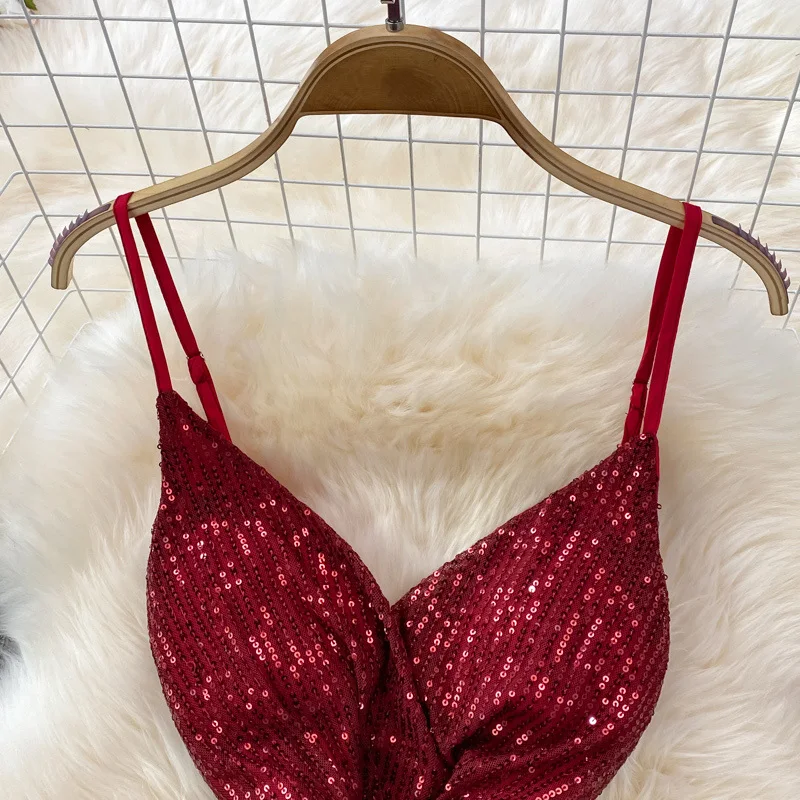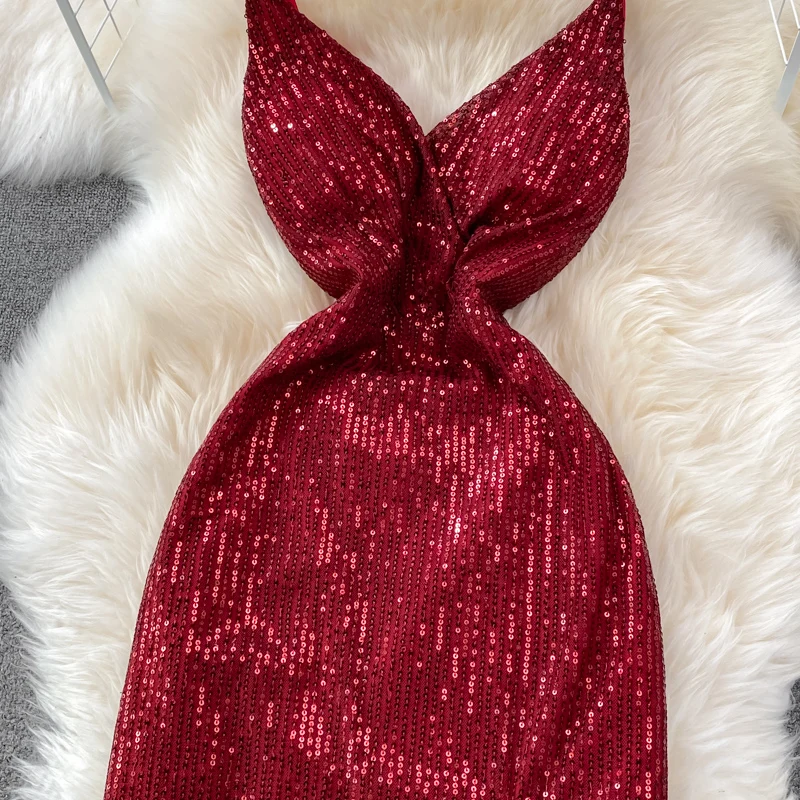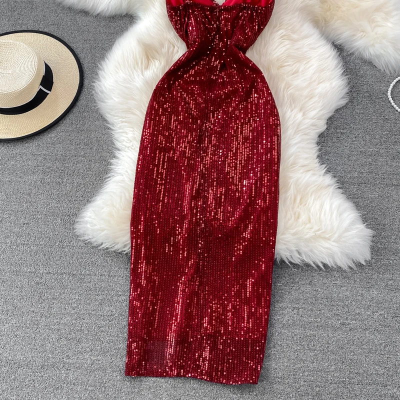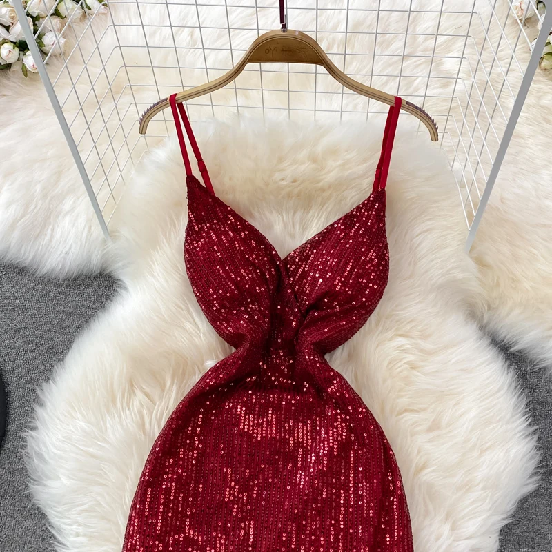Sexy Party Dress Women Elegant Sequins Glitter Evening Club Dresses Deep V-neck Spaghetti Strap Sleeveless Split Long Maxi Dress