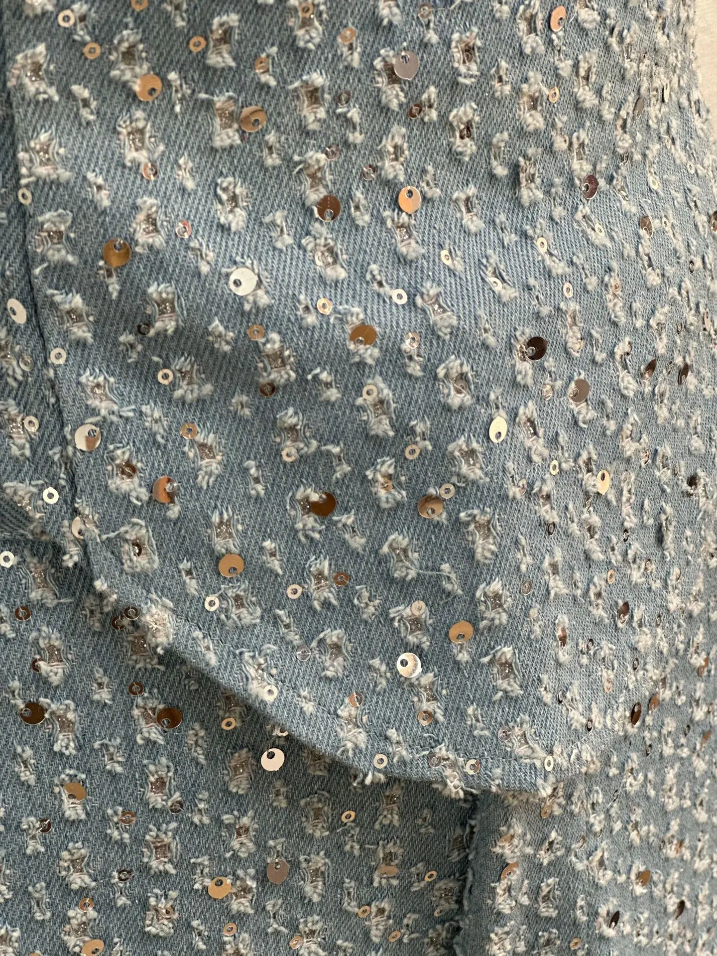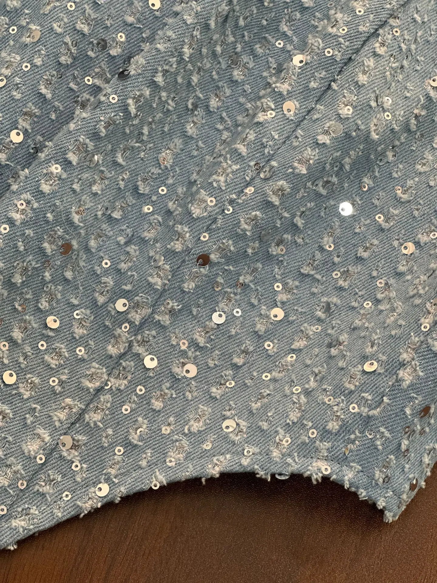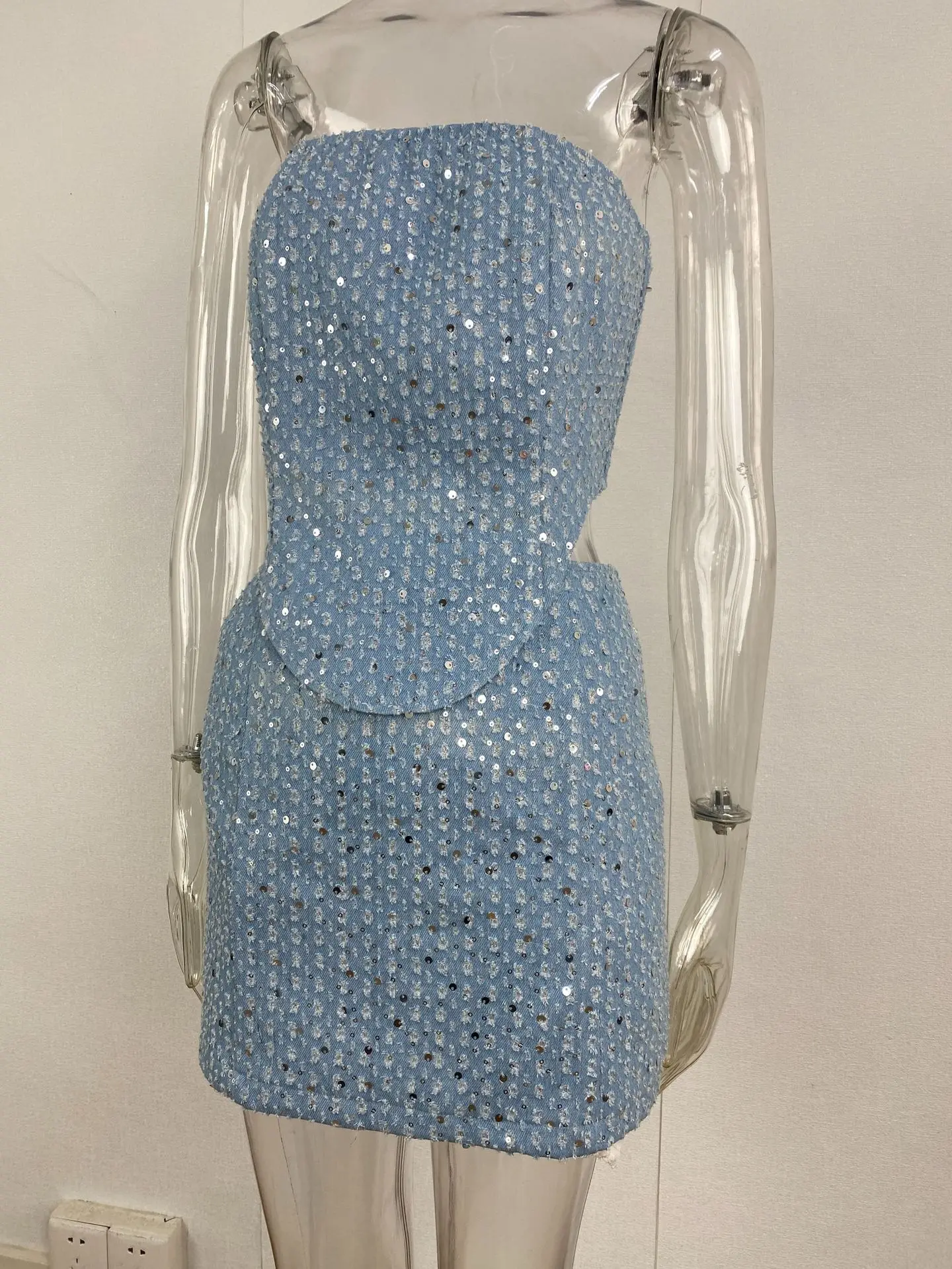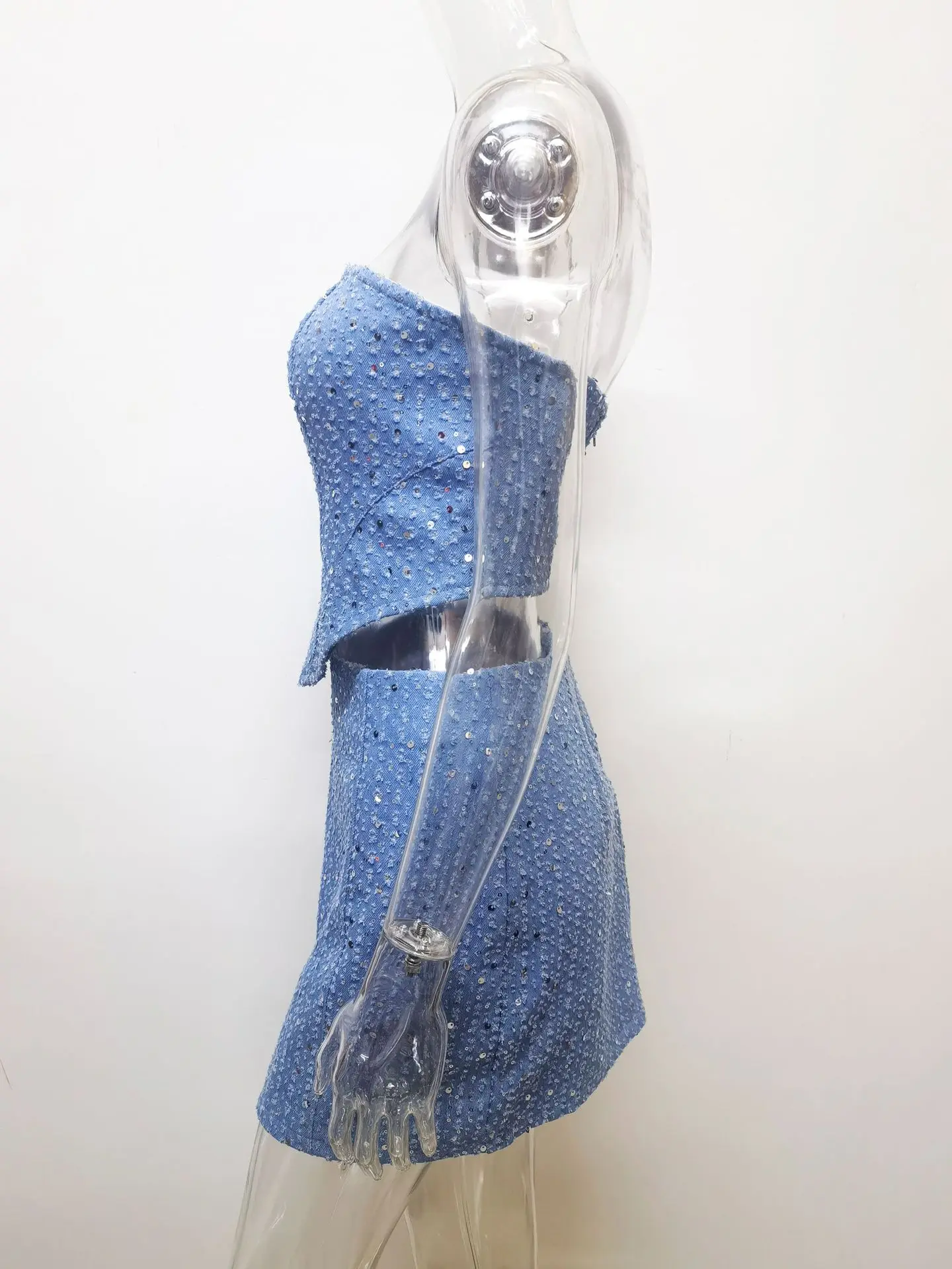 Sexy Sequins Women Denim Tweed Two Piece Dress Sets 2025 Summer Fashion Strapless Top and Bodycon Mini Skirt Female Club Outfits