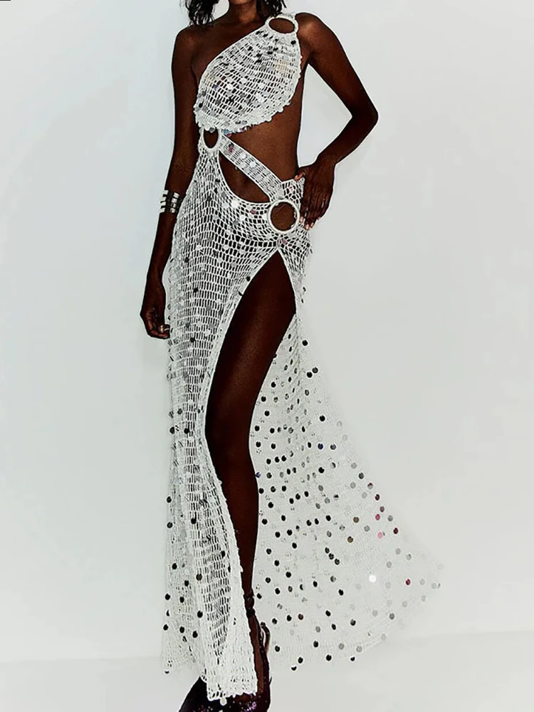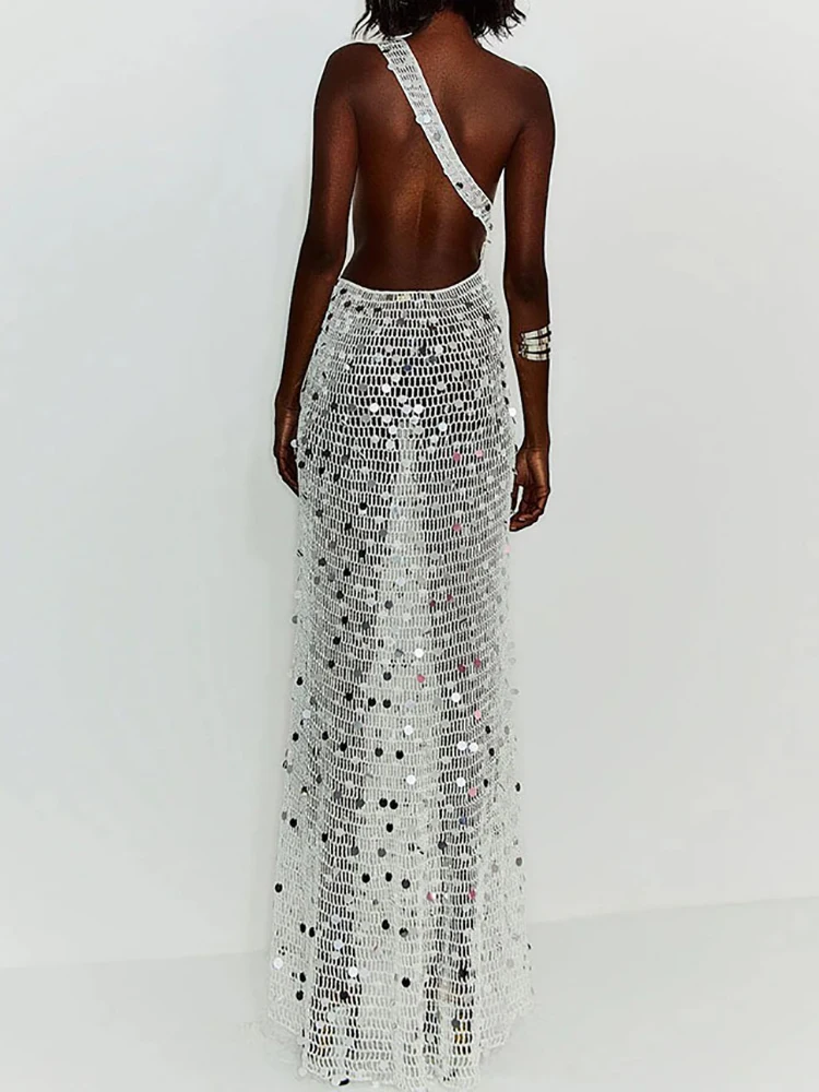 Skew Collar See Through Sexy Maxi Dress, Women Summer Hollow Fashion Party Dress, 2026 Solid Sleeveless Patchwork Ladies Dress