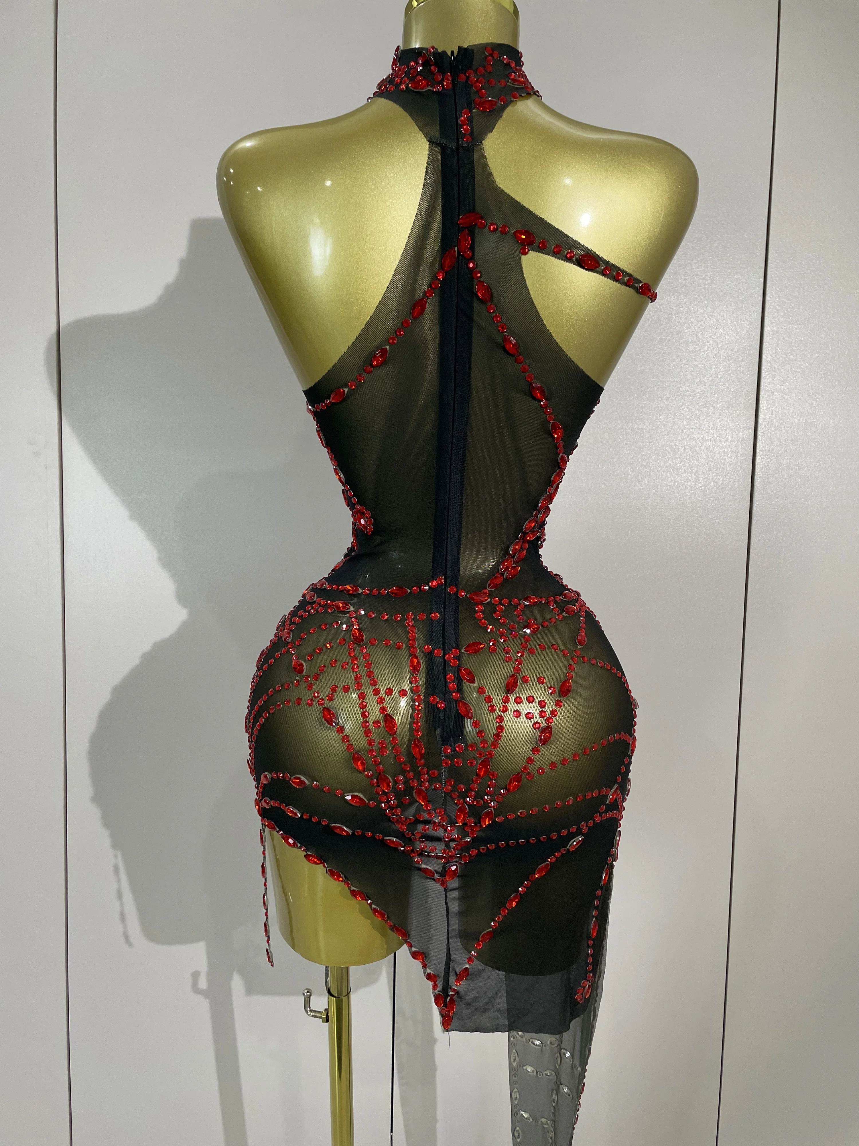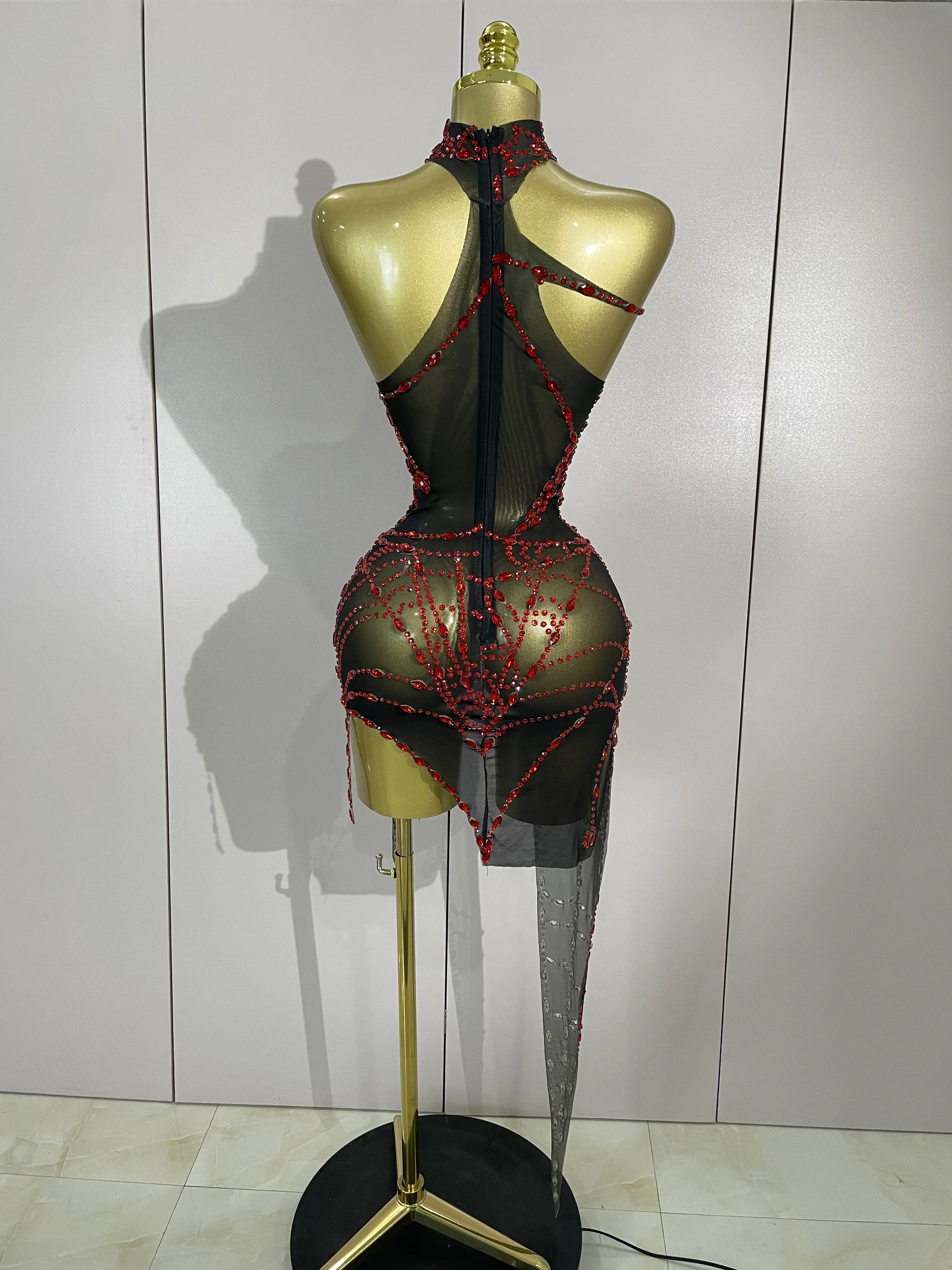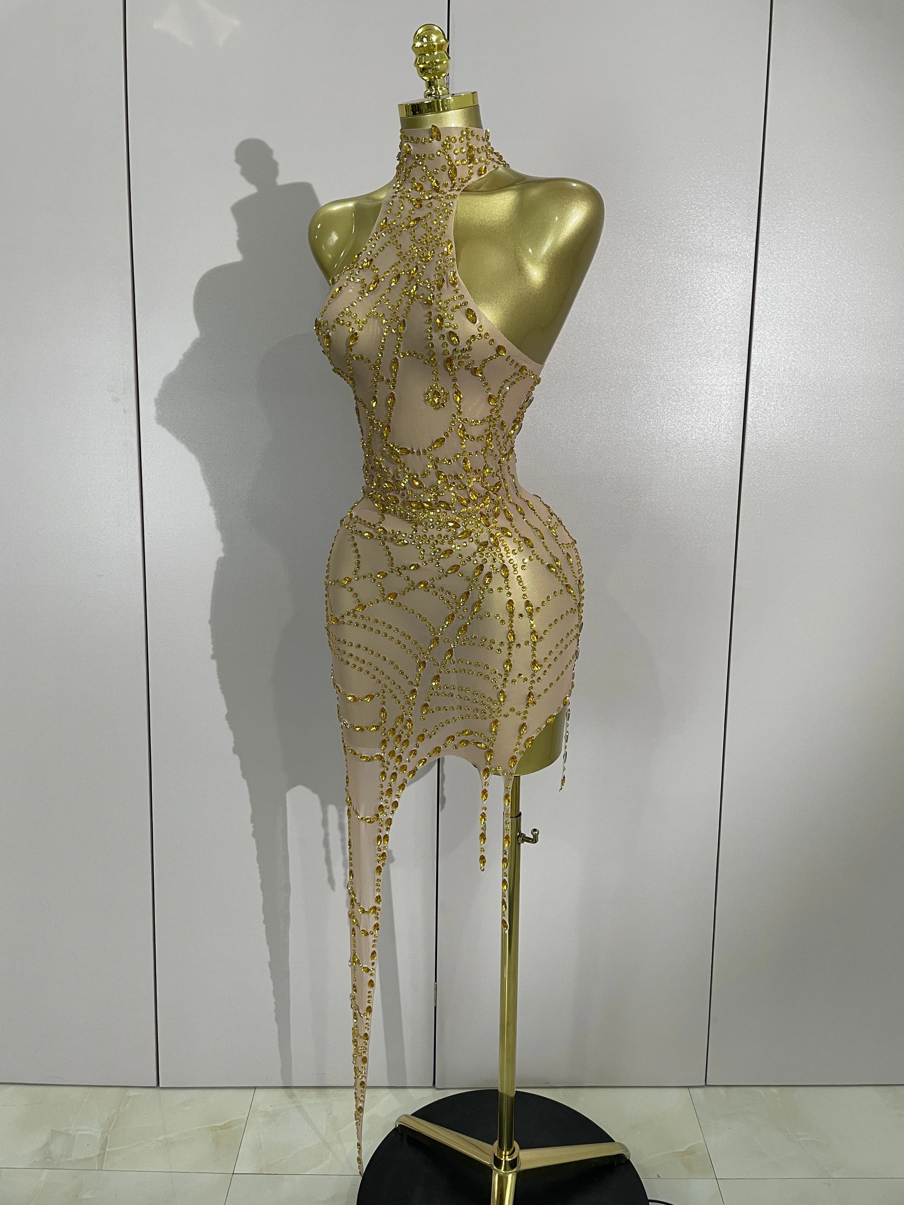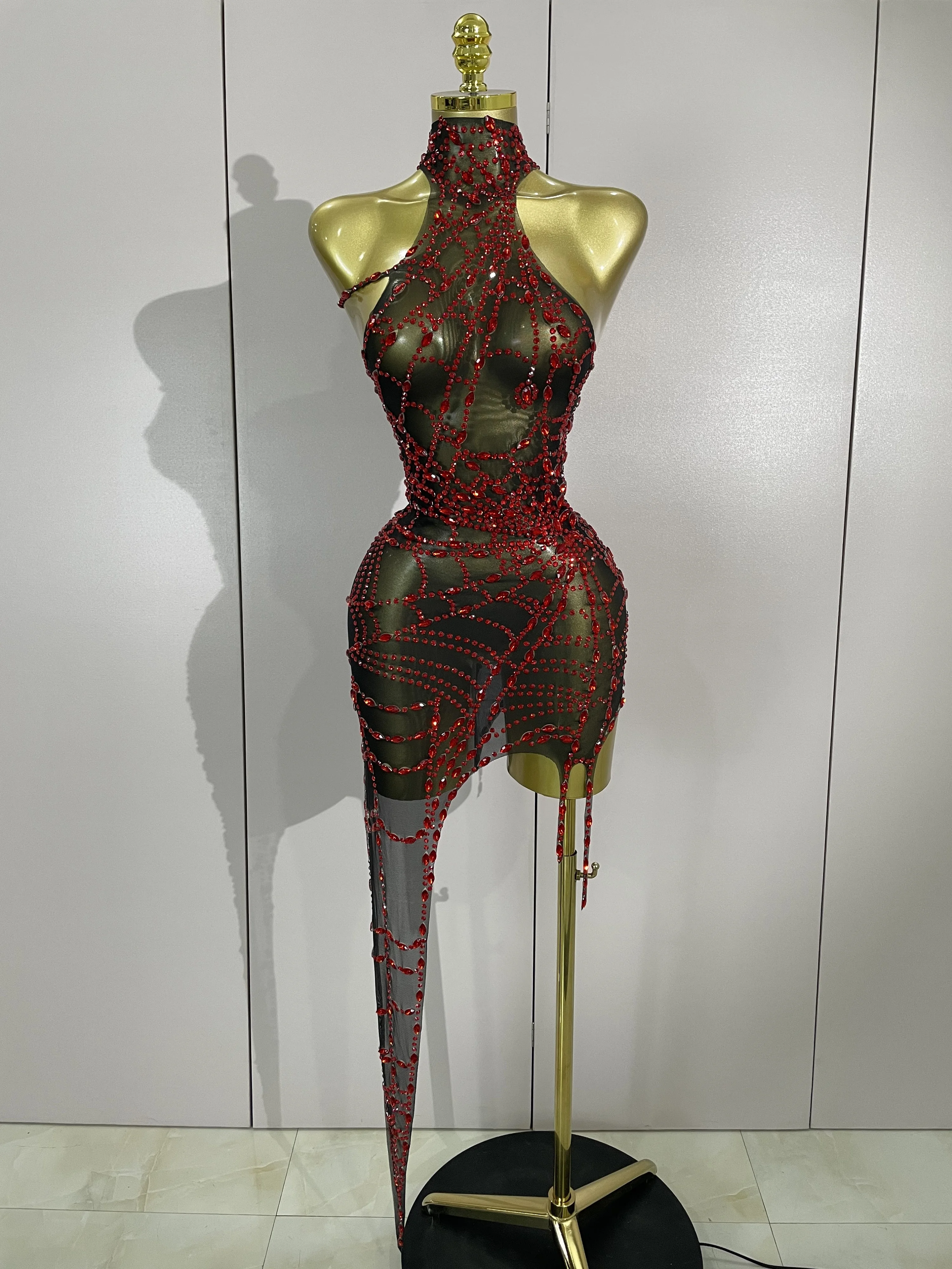 STOCK Sparkly Diamond Sexy Mesh Asymmetric Bodycon Mini Dress Women Nightclub Bar Party Show Gogo Dancer Clothing Stage Costume