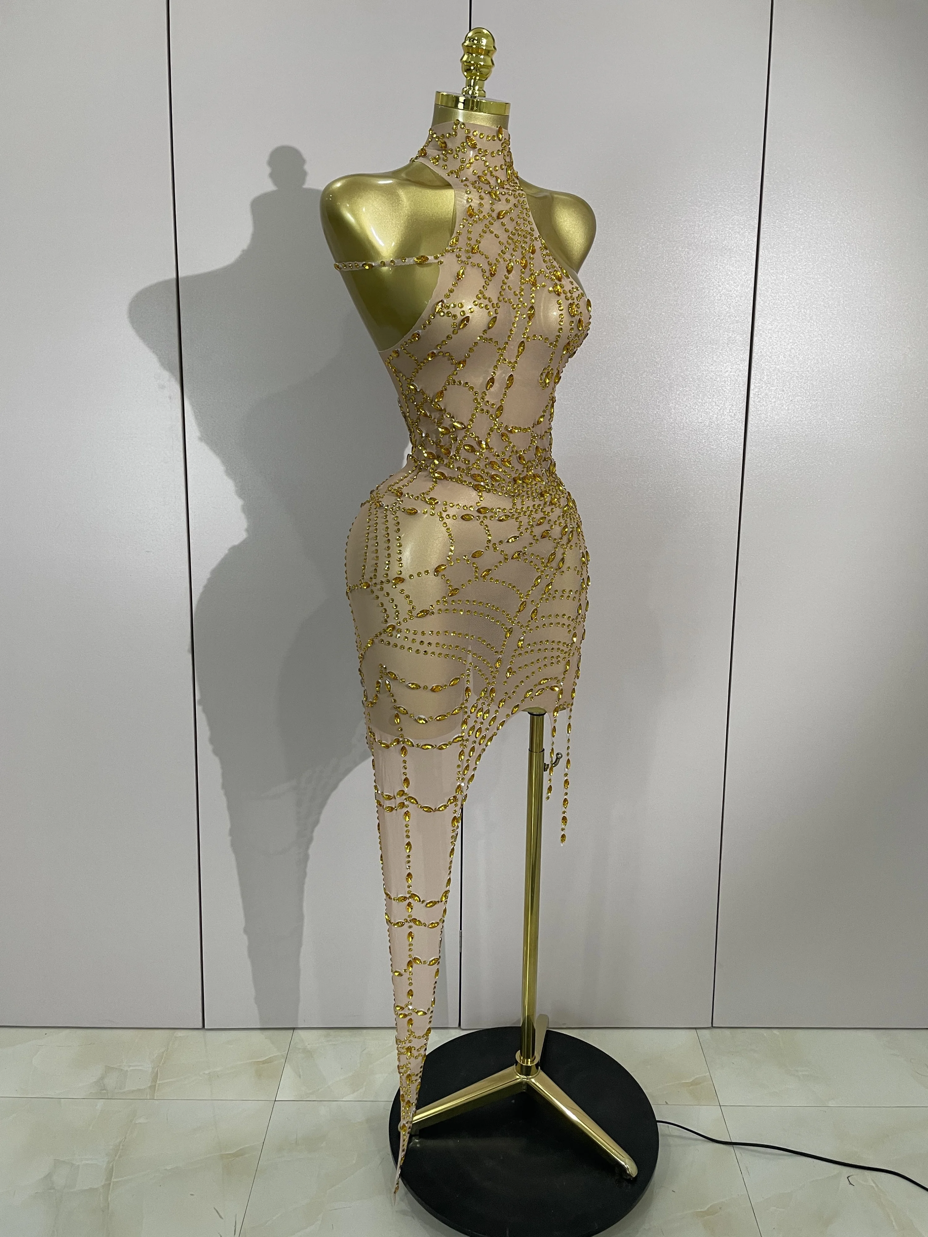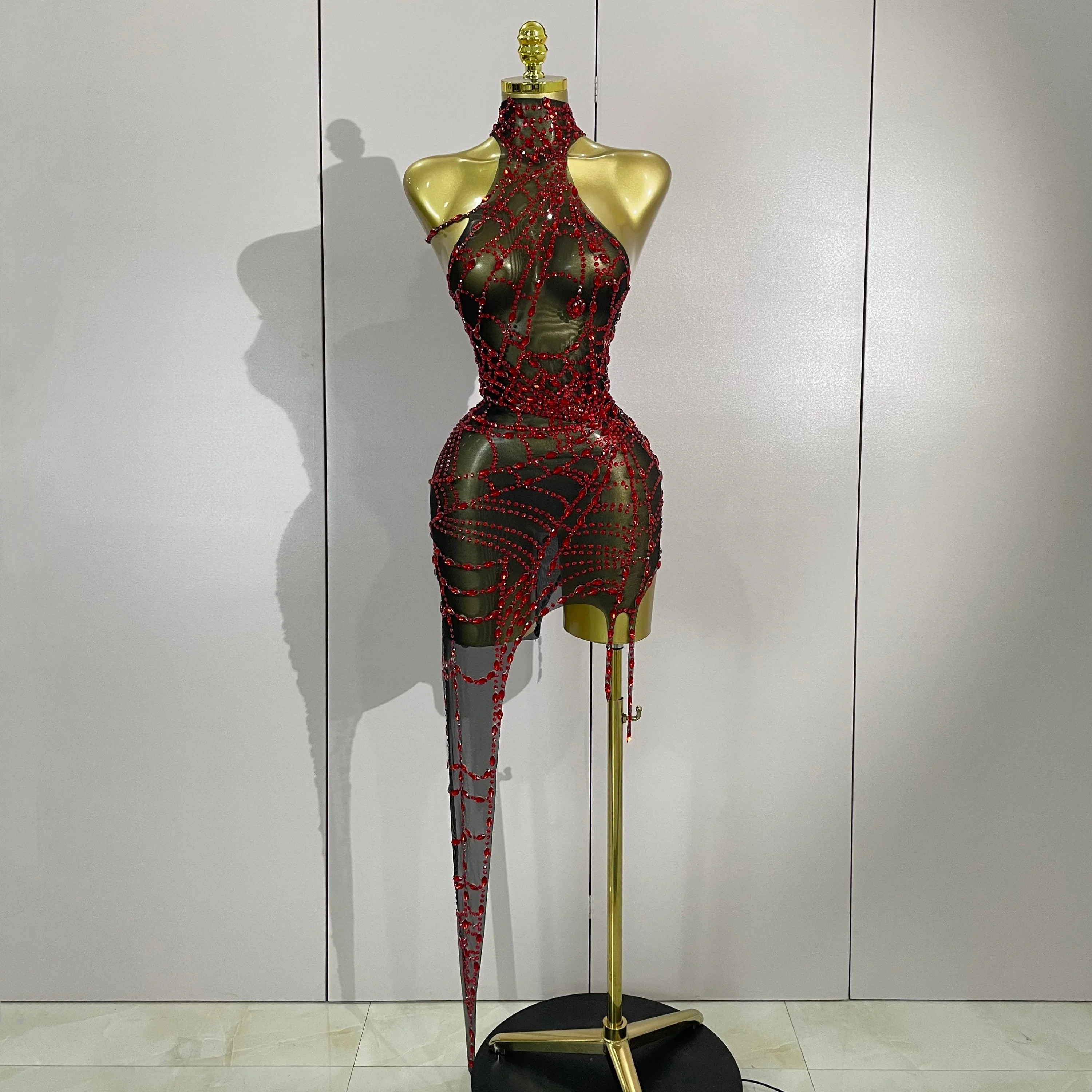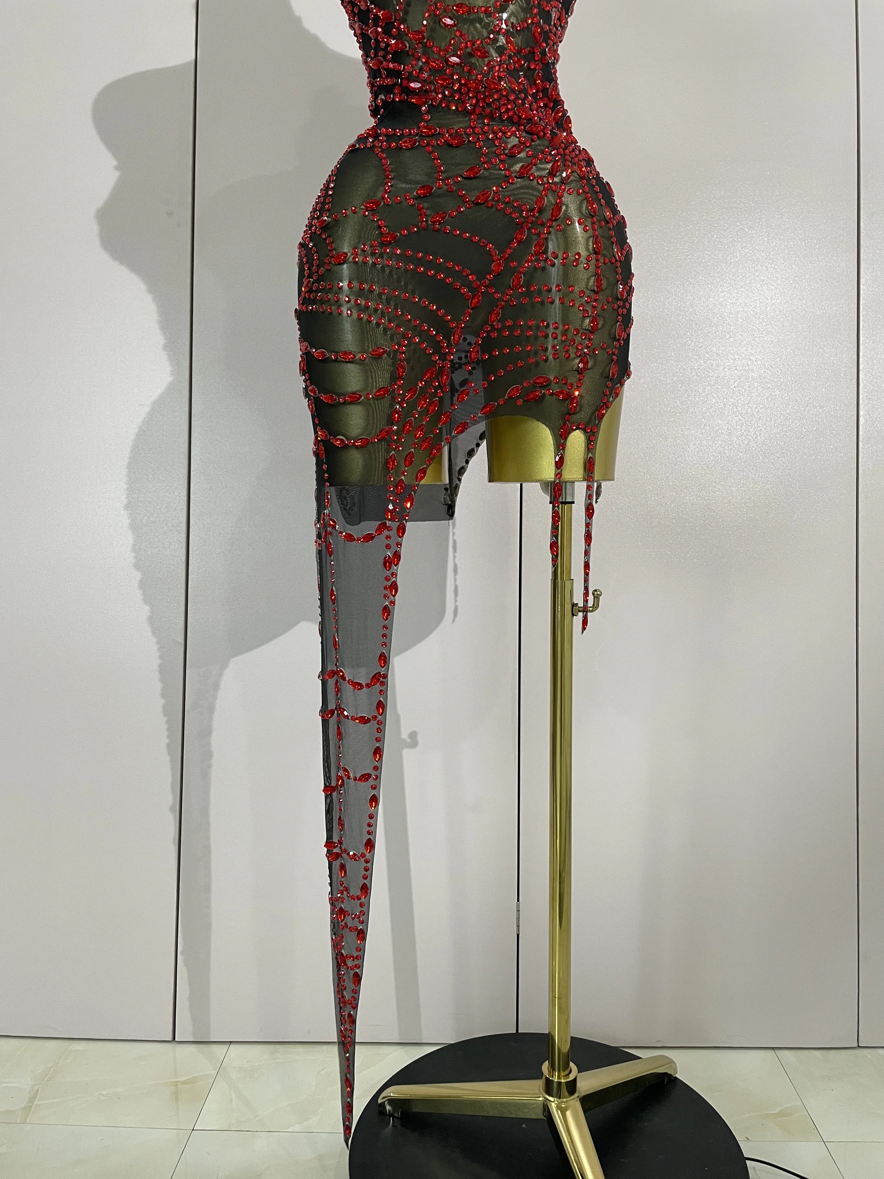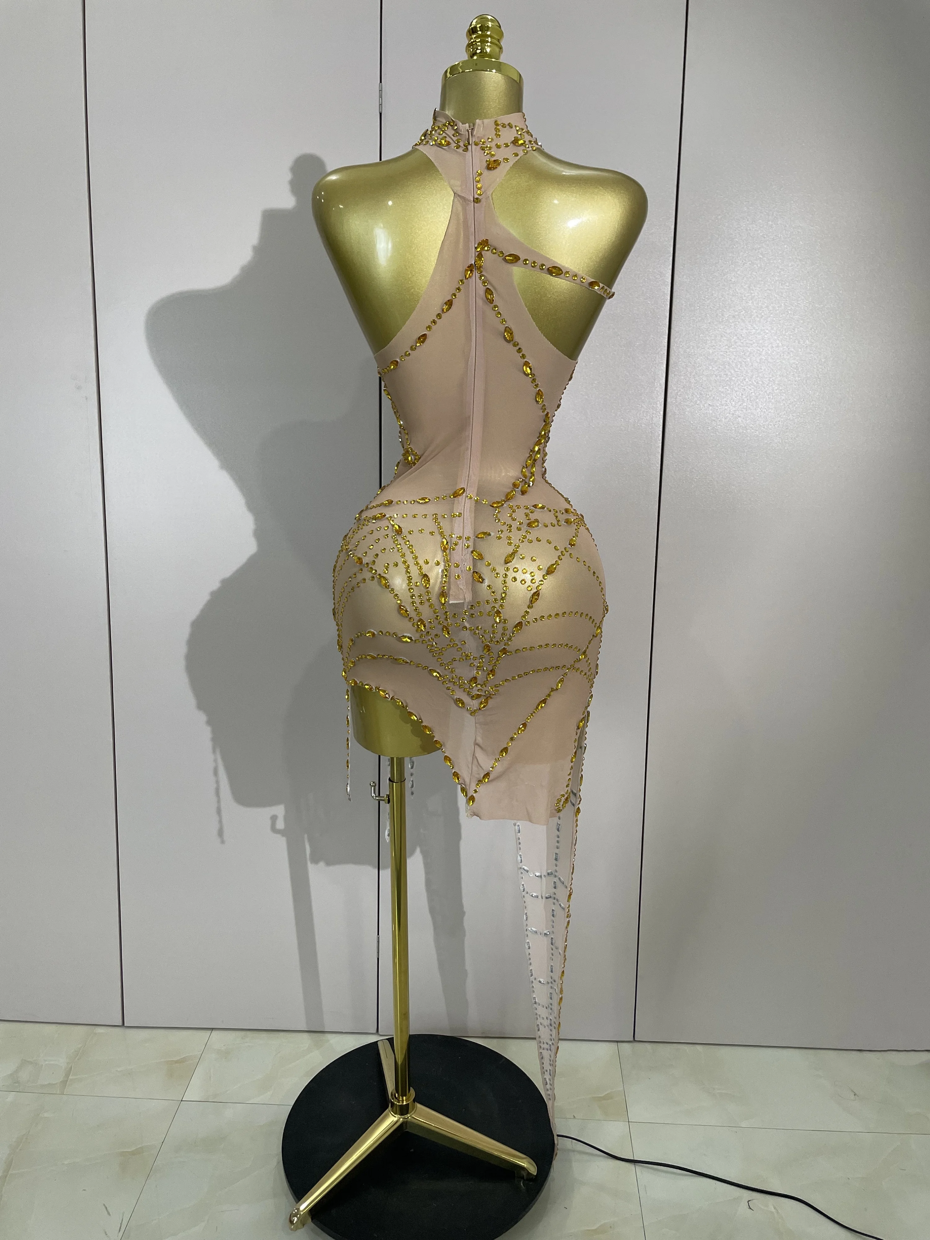 STOCK Sparkly Diamond Sexy Mesh Asymmetric Bodycon Mini Dress Women Nightclub Bar Party Show Gogo Dancer Clothing Stage Costume