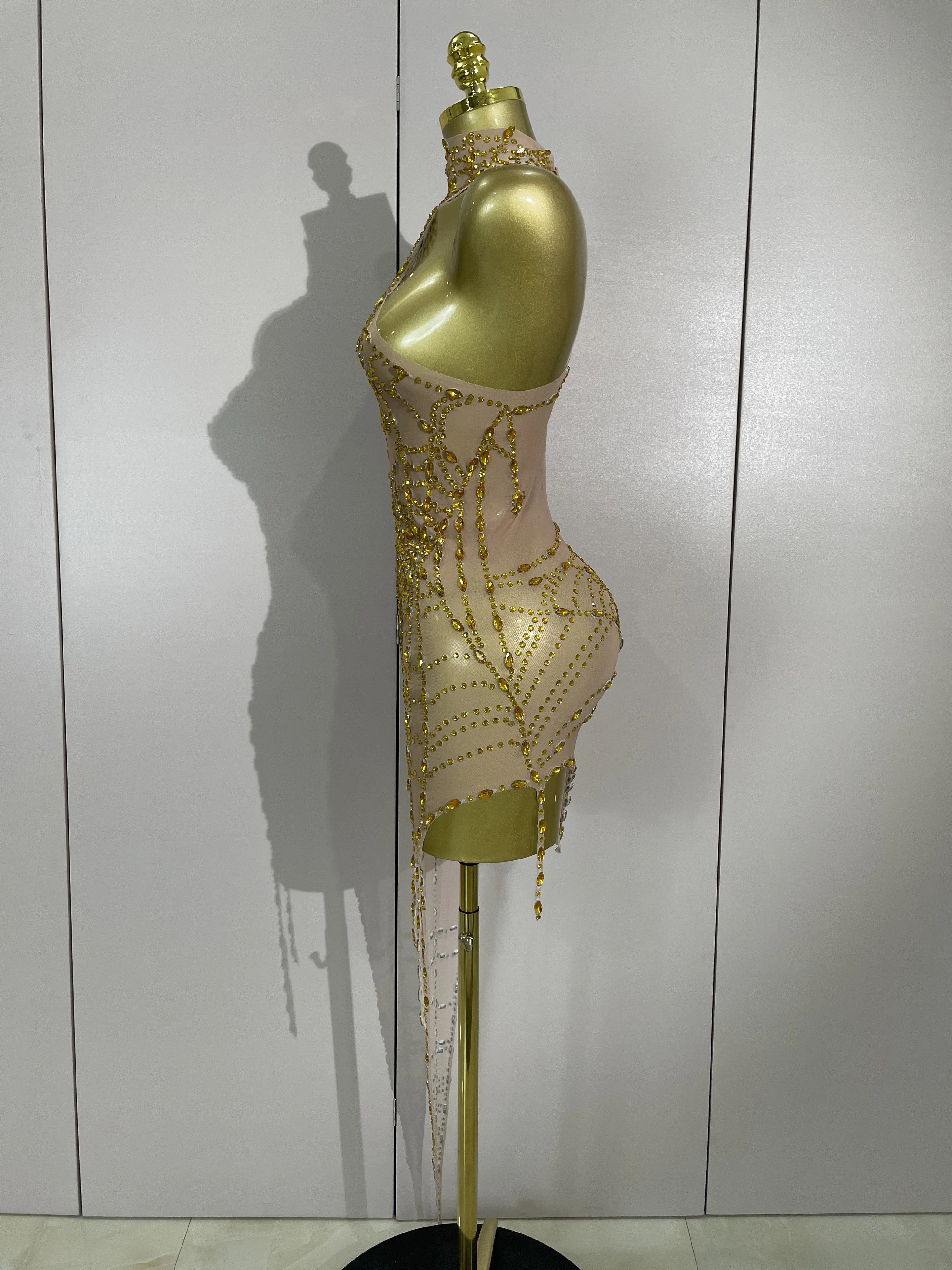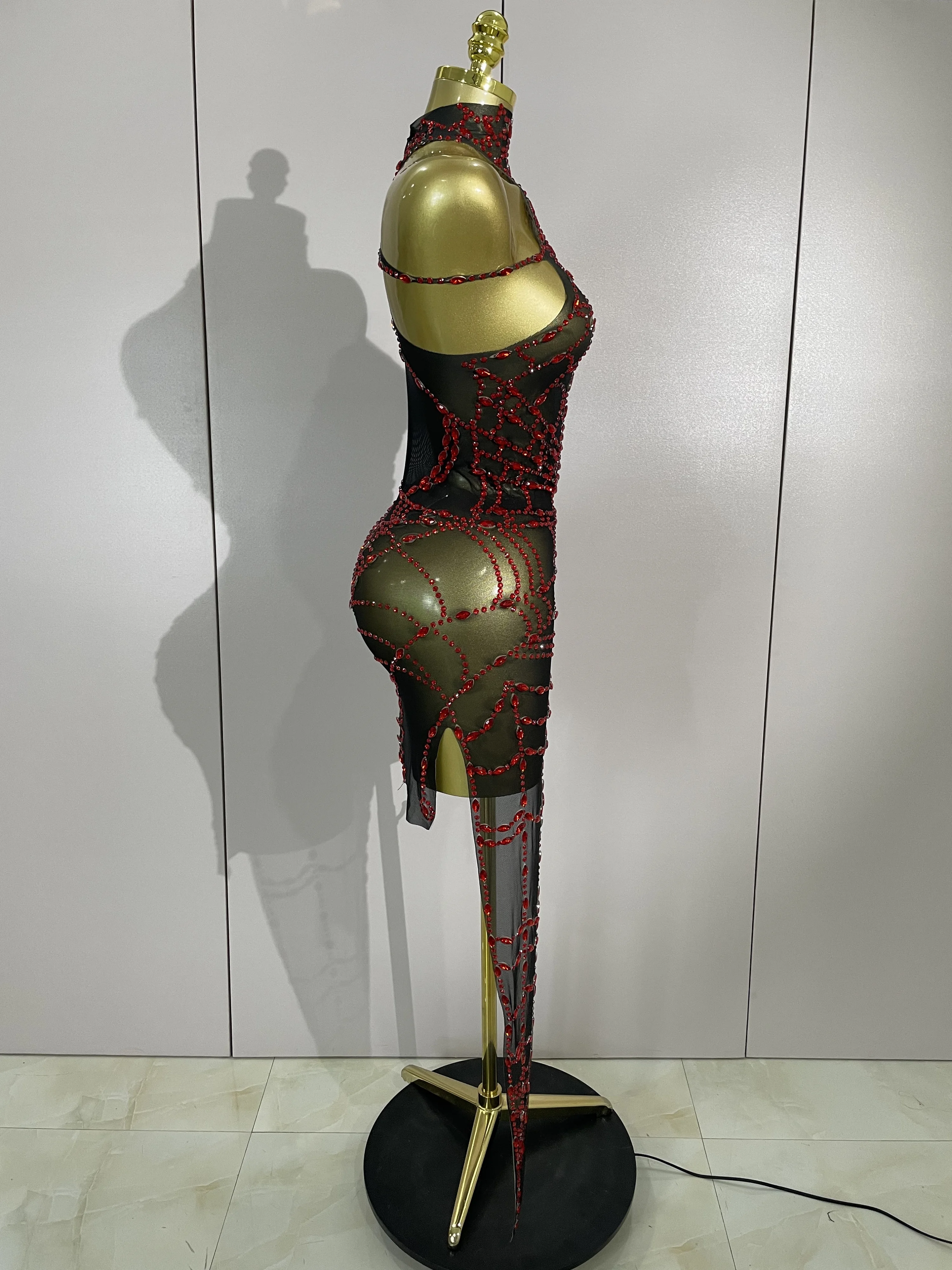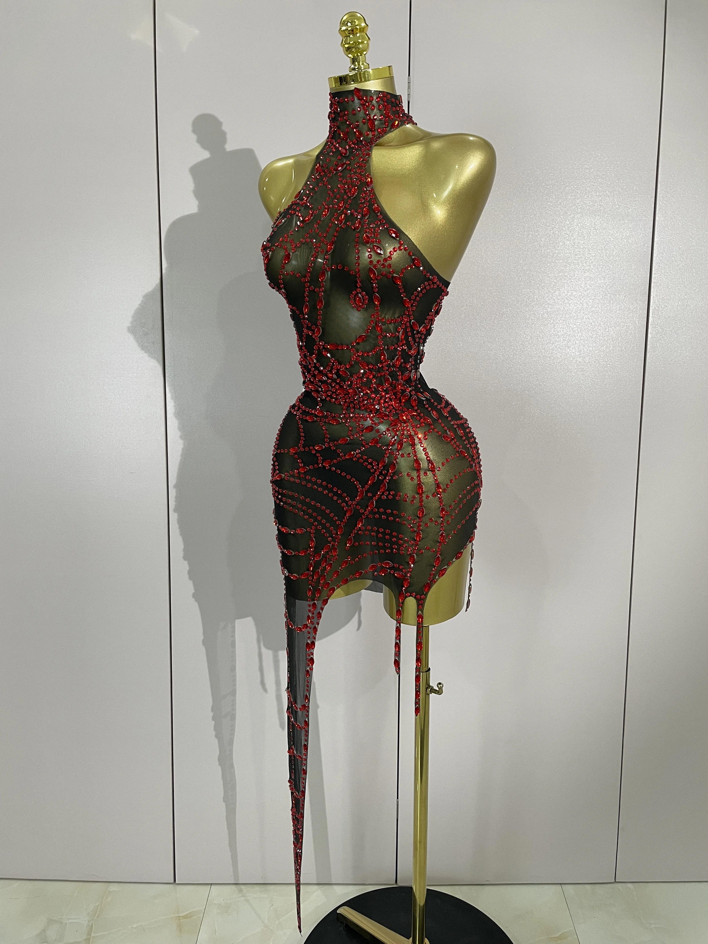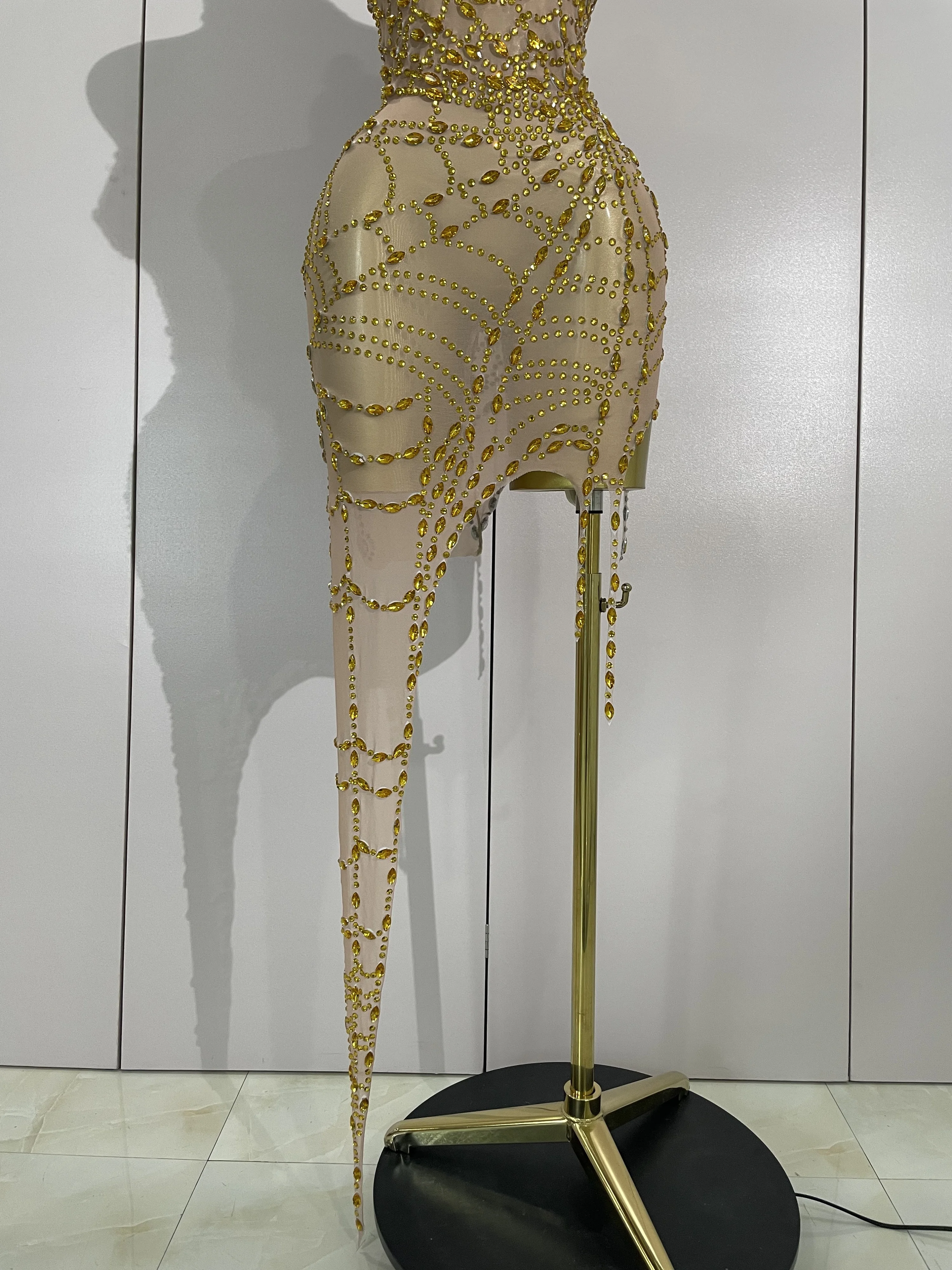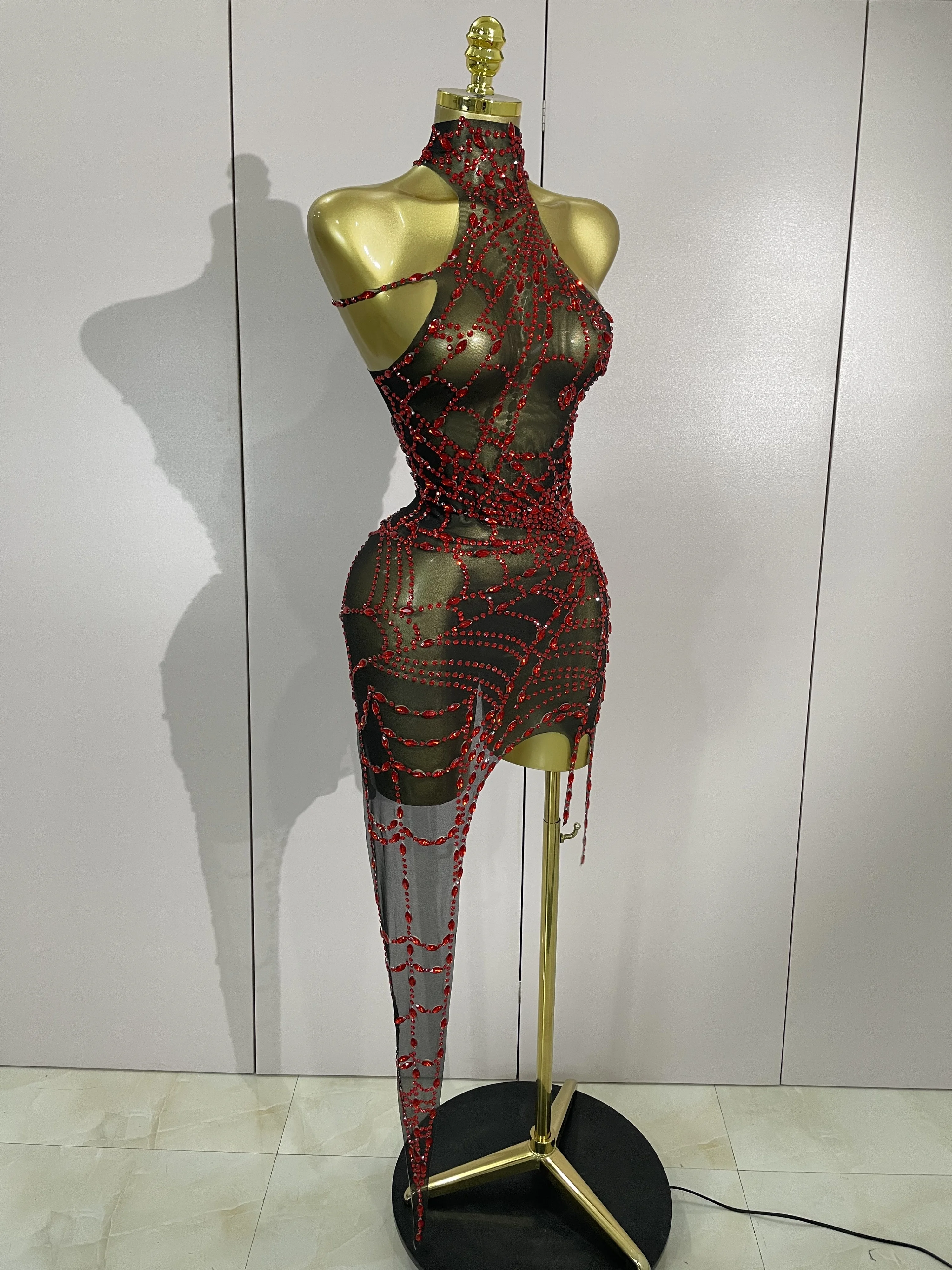 STOCK Sparkly Diamond Sexy Mesh Asymmetric Bodycon Mini Dress Women Nightclub Bar Party Show Gogo Dancer Clothing Stage Costume