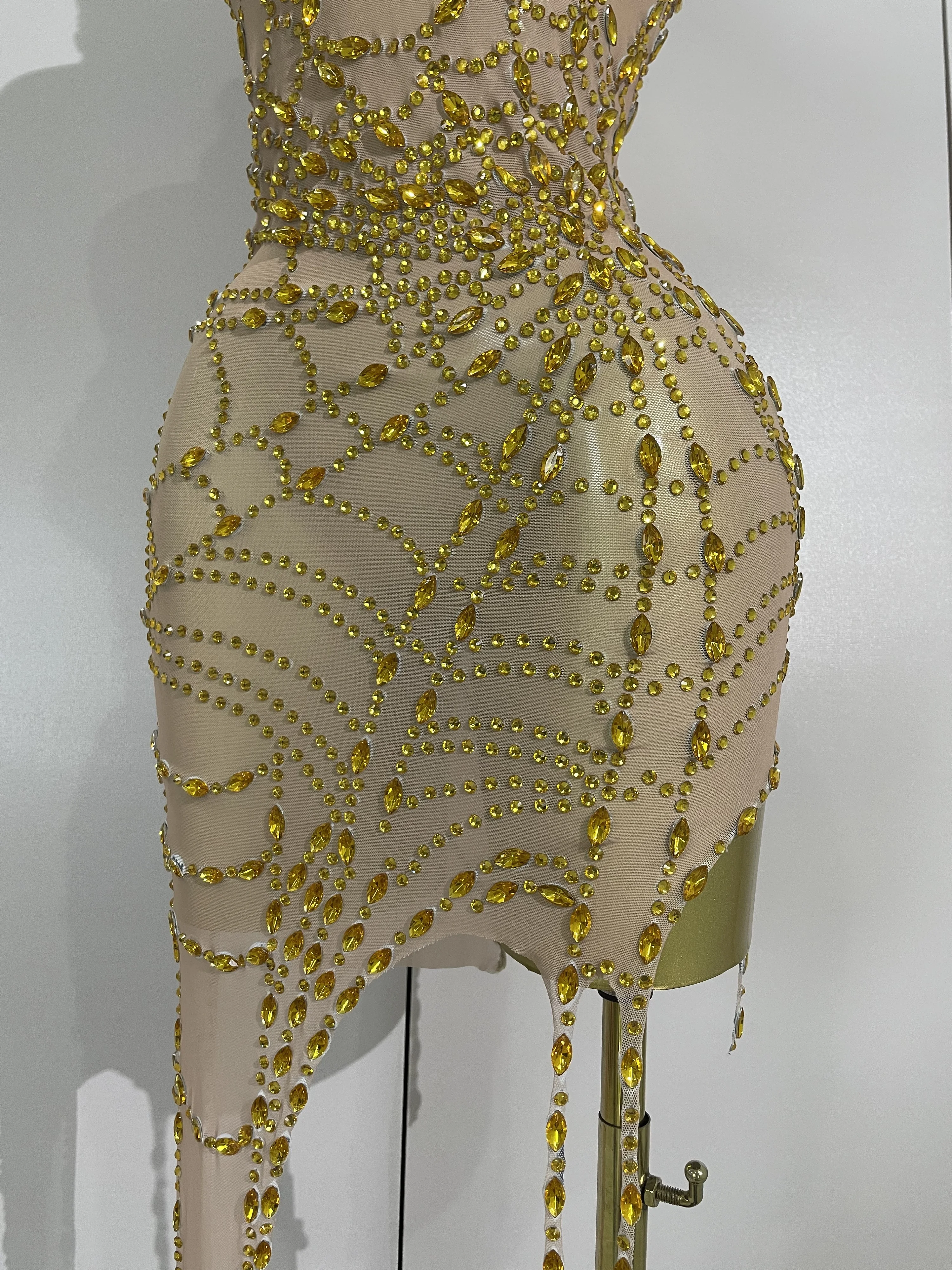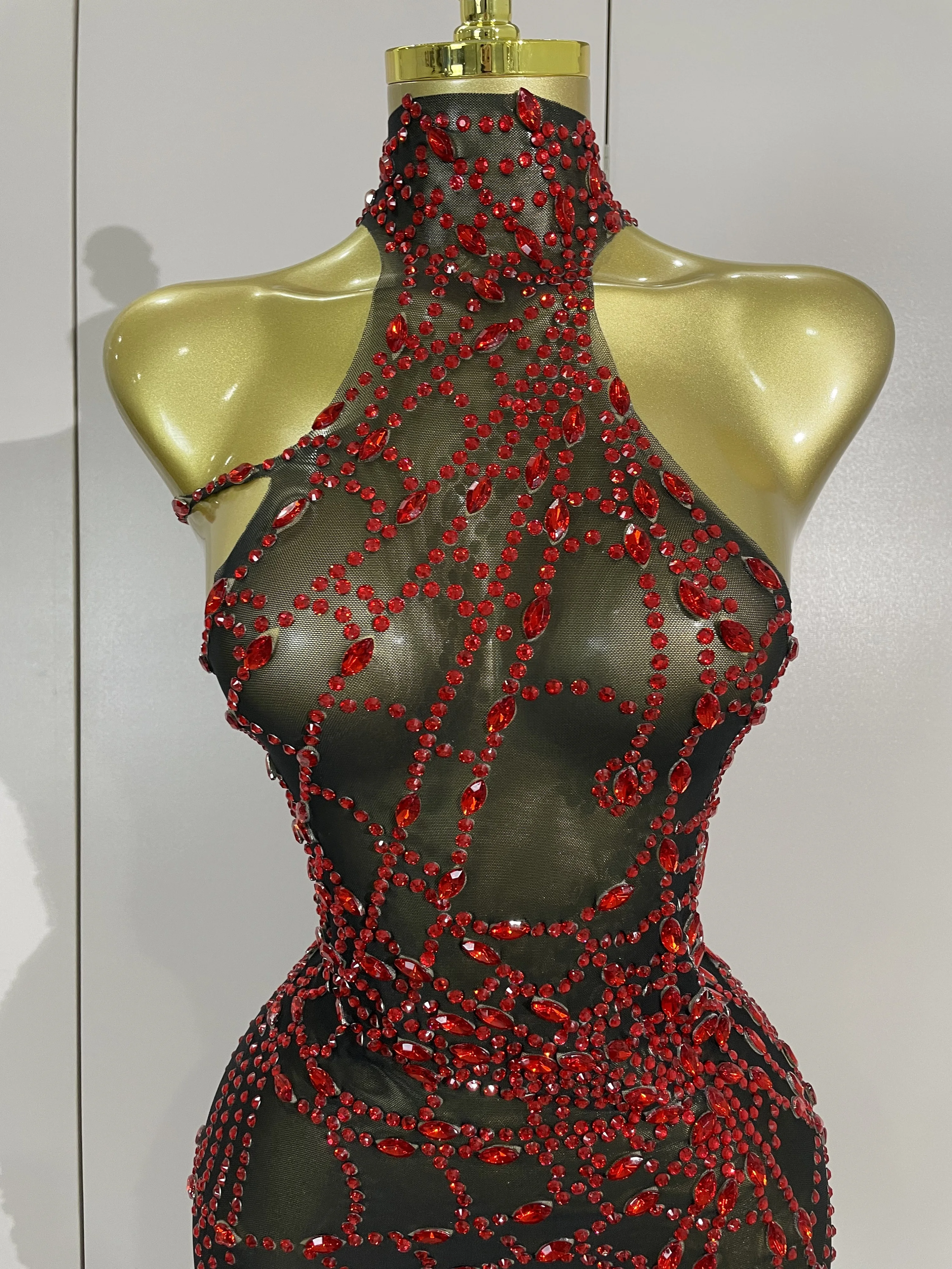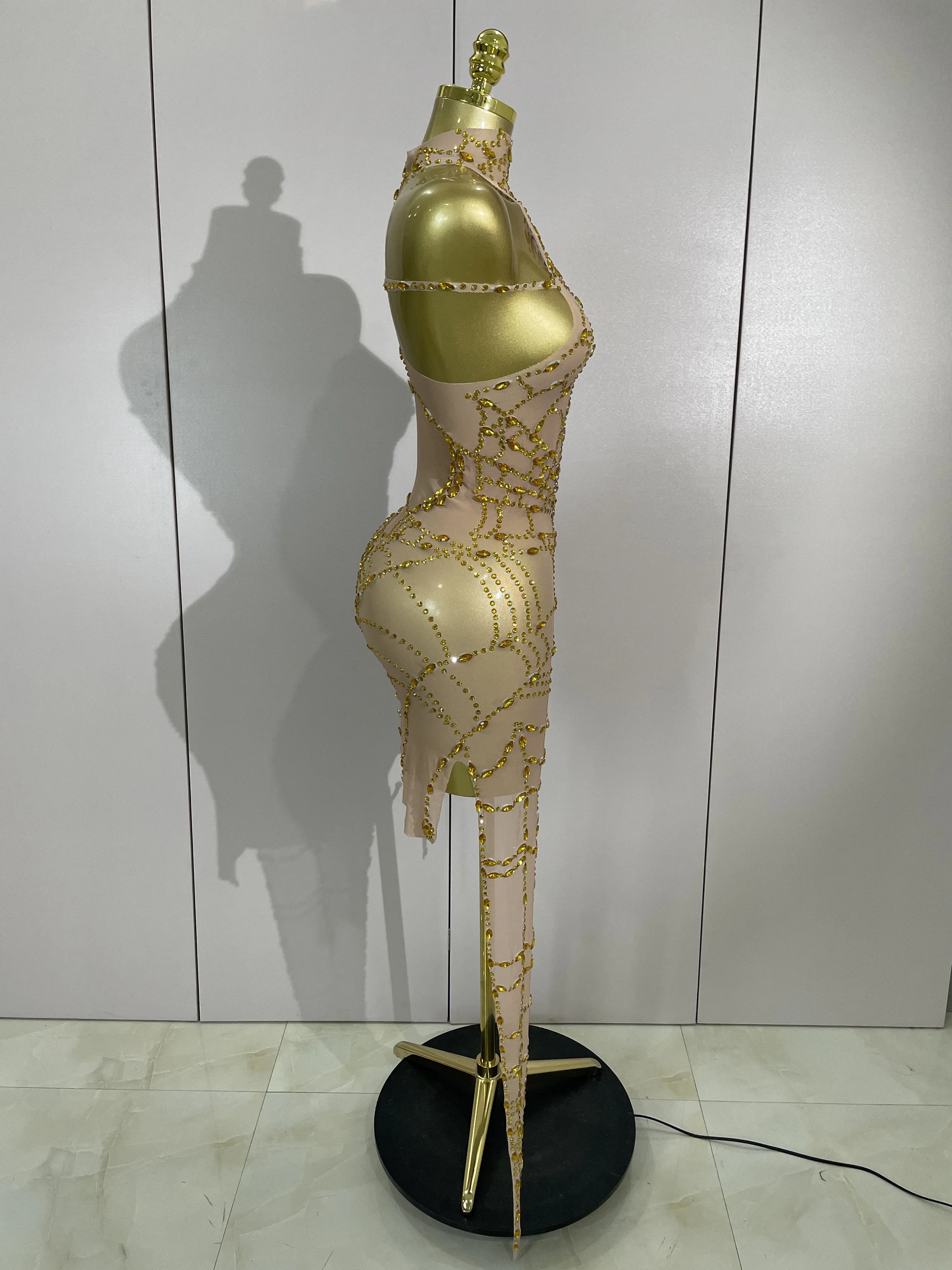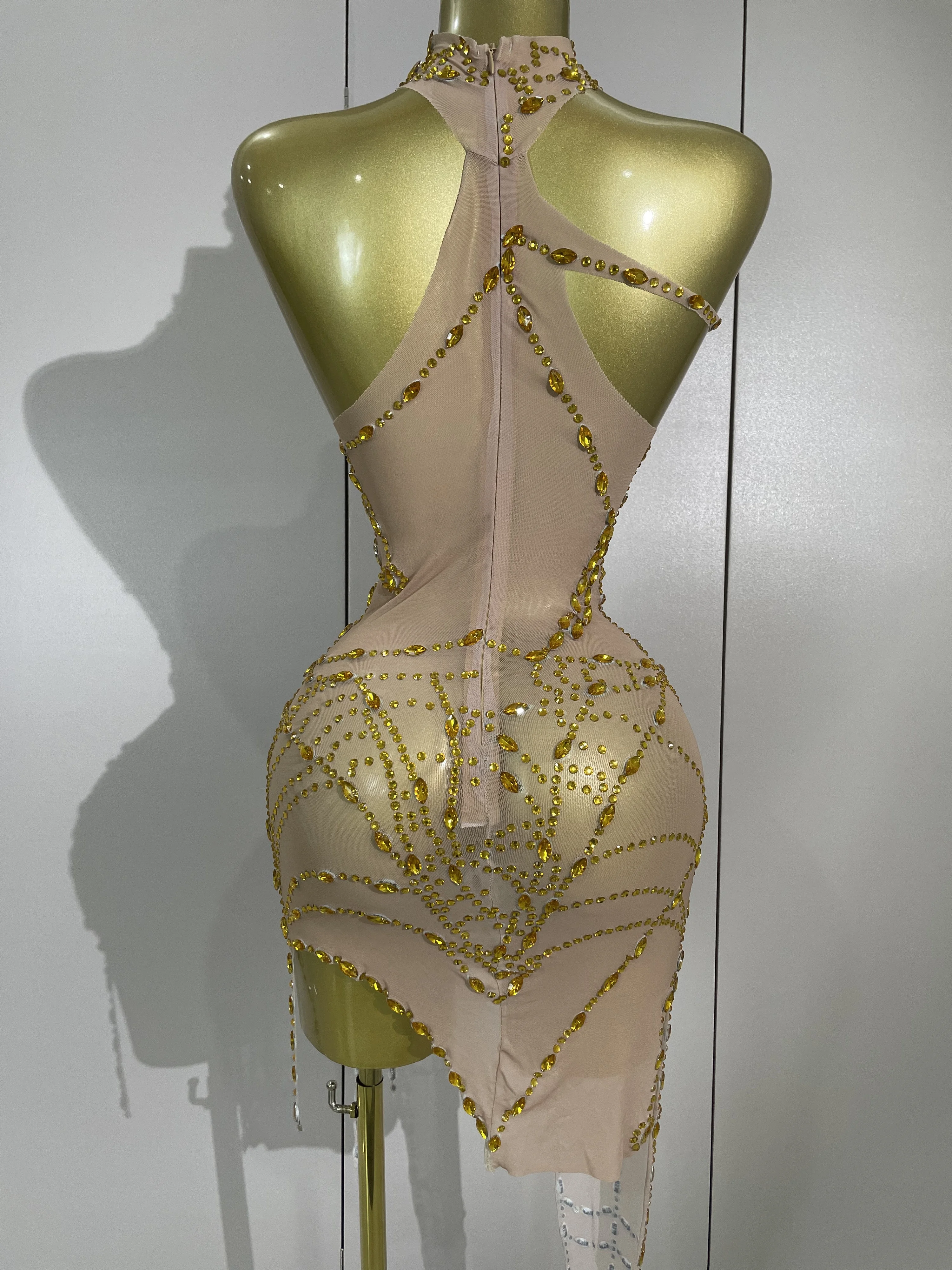STOCK Sparkly Diamond Sexy Mesh Asymmetric Bodycon Mini Dress Women Nightclub Bar Party Show Gogo Dancer Clothing Stage Costume
