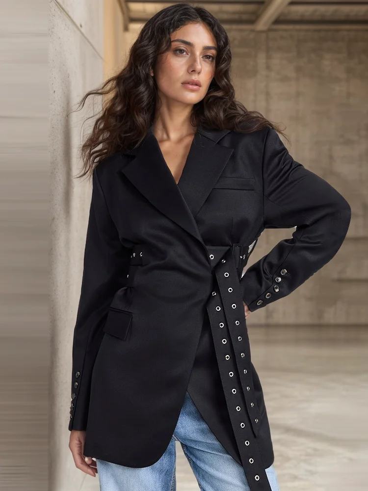 VGH Fashion Patchwork Belts Blazers For Women Notched Collar Long Sleeve Hit Color Casual Temperament Blazer Female Fashion New