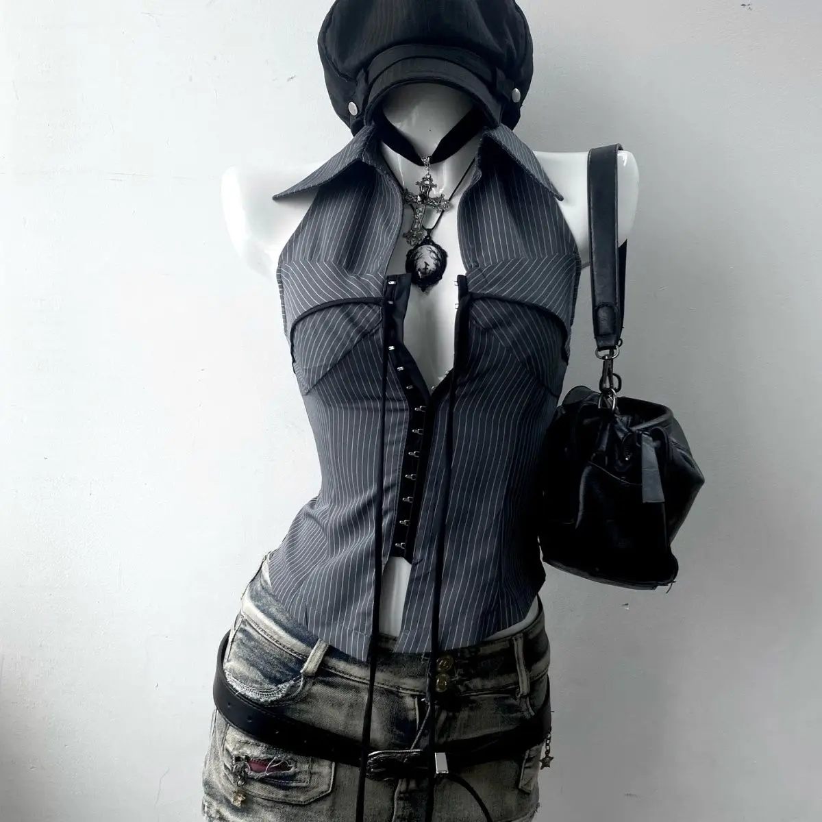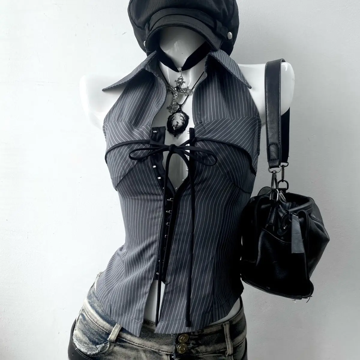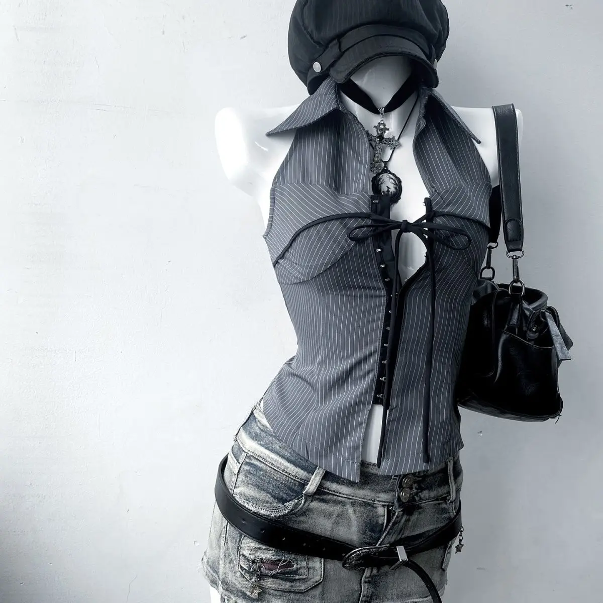 Vintage T-shirt Streetwear 90s Slim Sexy Goth Y2k Clothes Aesthetic Harajuku High Street Stripe Laceup Summer Fashion Grunge Tee