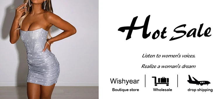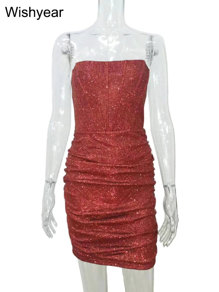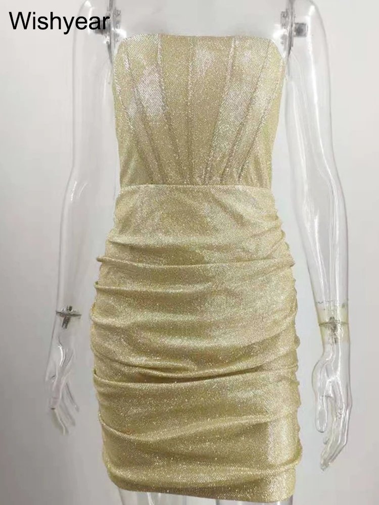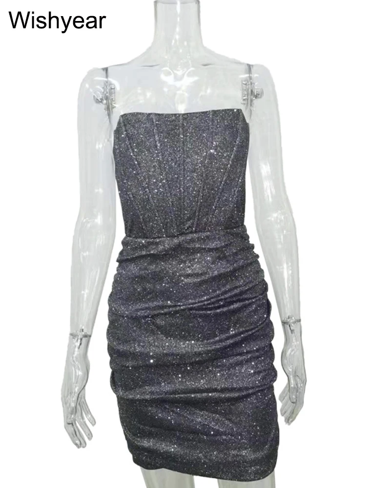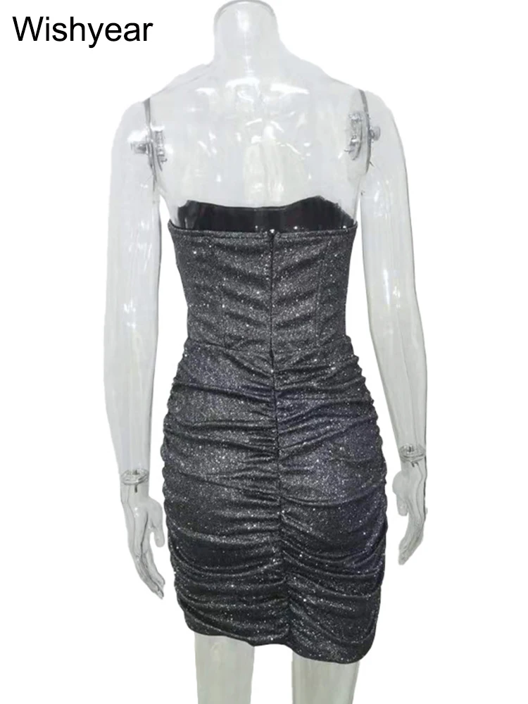 Wishyear Sexy Silvery Glitter Strapless Bodycon Mini Short Dress Woman Summer Elegant Ruched Night Club Birthday Prom Robe 2025