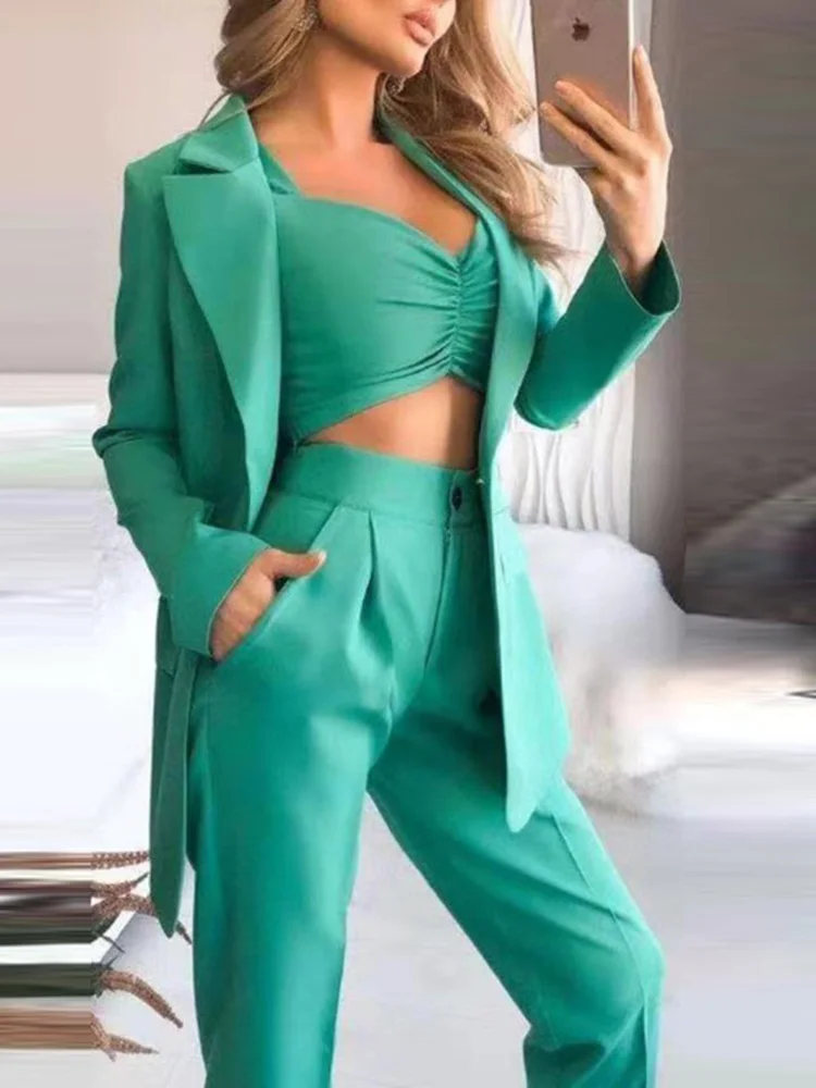 Woman Vintage Black Slim Fit Blazer 3 Pcs Suit Autumn Elegant Female Solid Matching Sets V-Neck Casual Office Three Piece Set