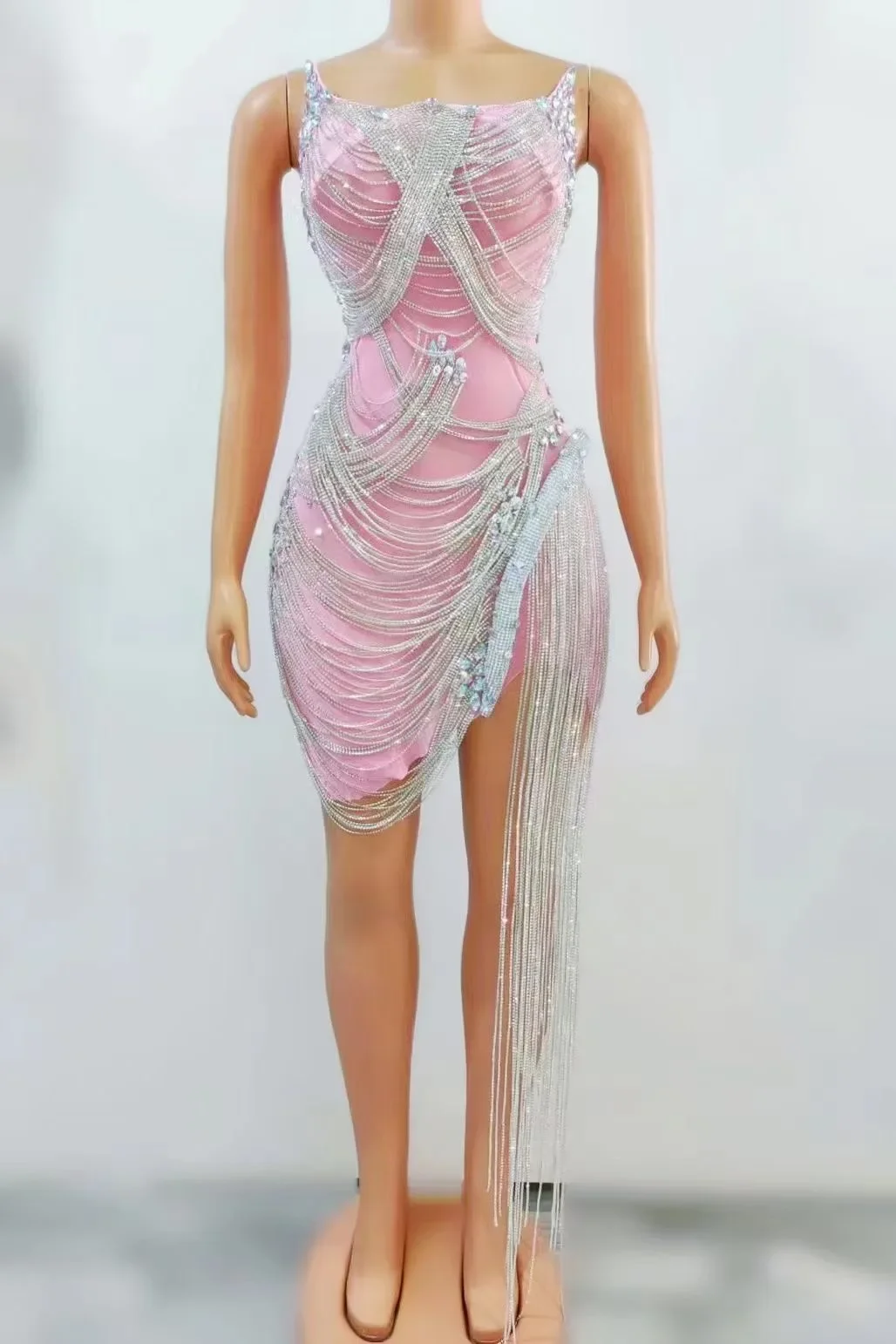 Women Celebrate Birthday Evening Dress Prom Outfit Sexy See Through Show Stage Wear STOCK Rhinestones Chains Crystals Dress