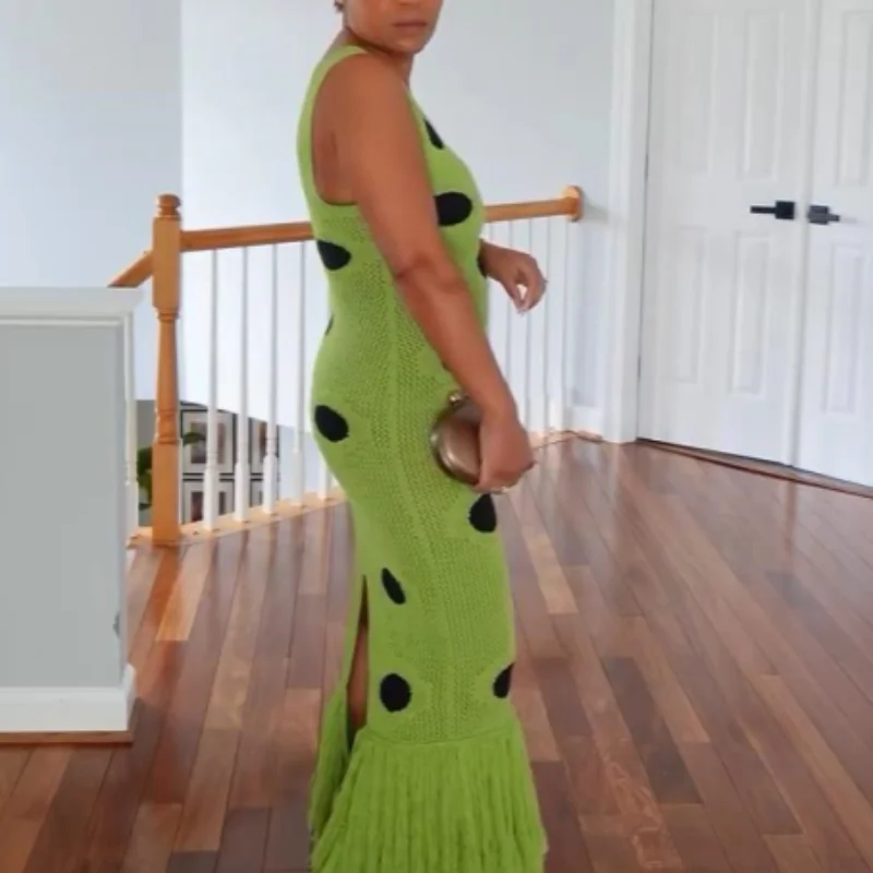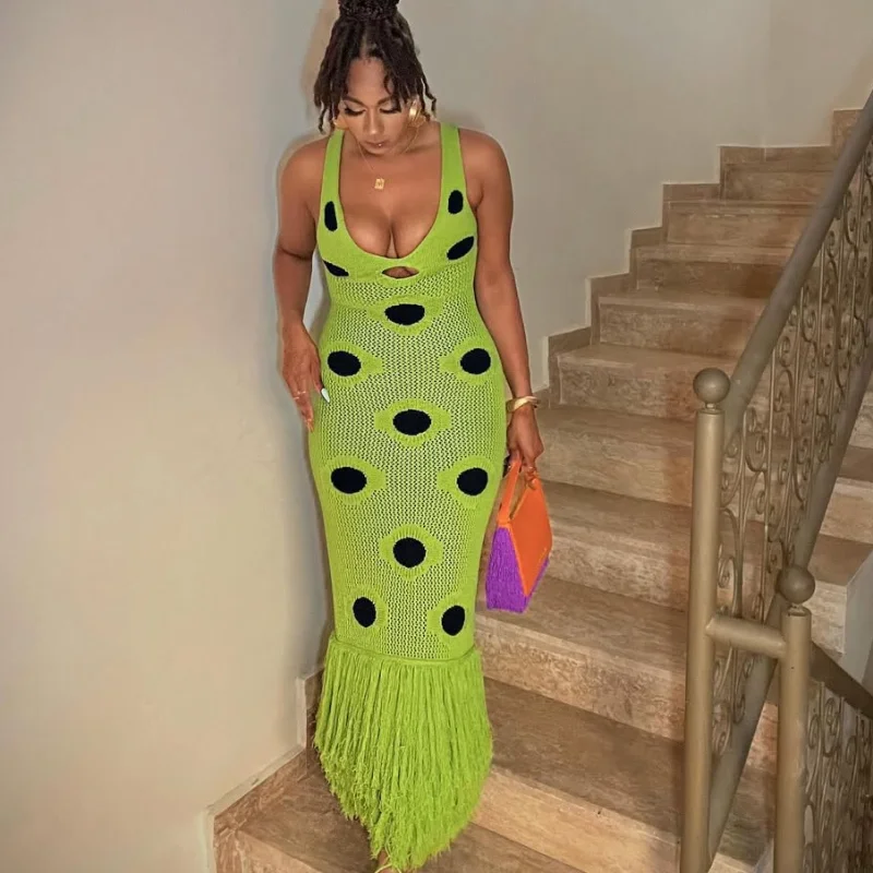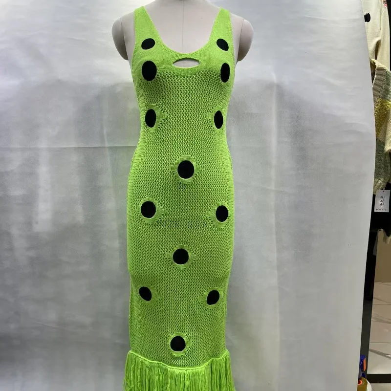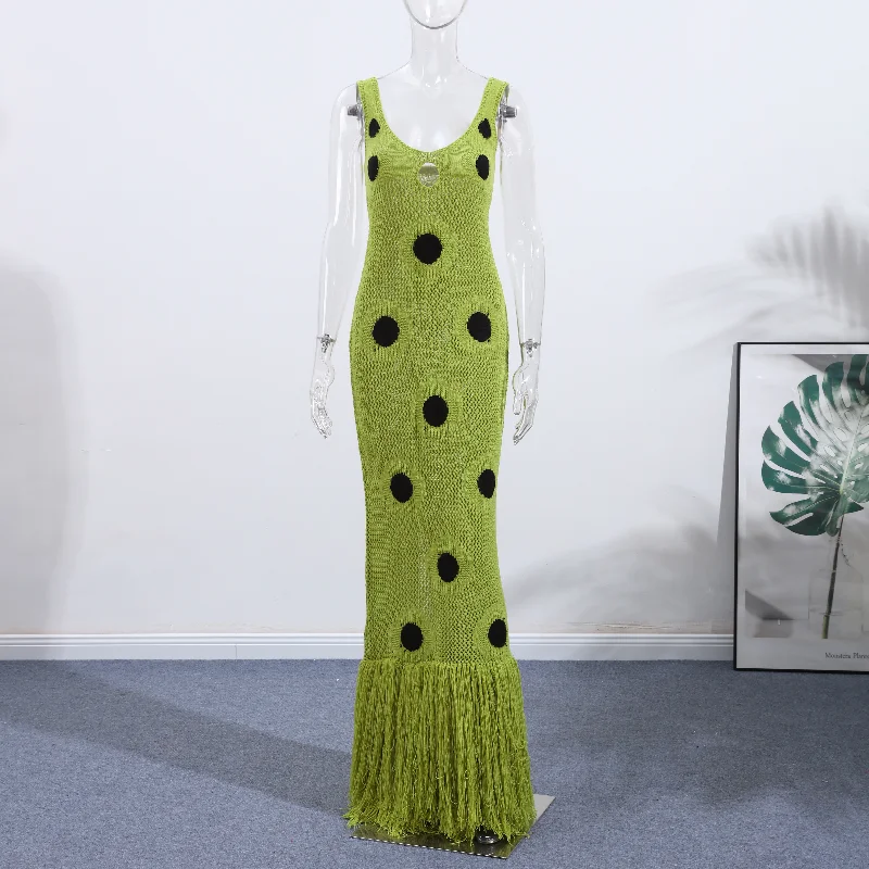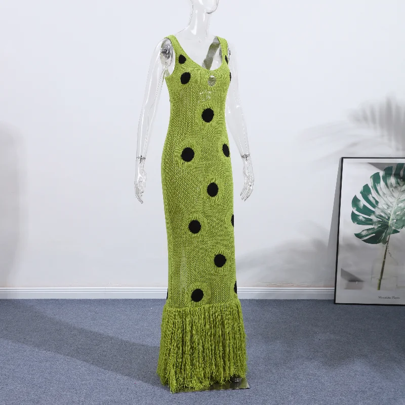 Designed Polka Dot Knitted Long Dress V Neck Hollow Out Fringe Hem Dresses 2025 Summer New Women's Elegant Party Evening Gown