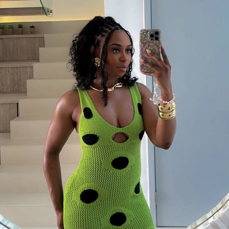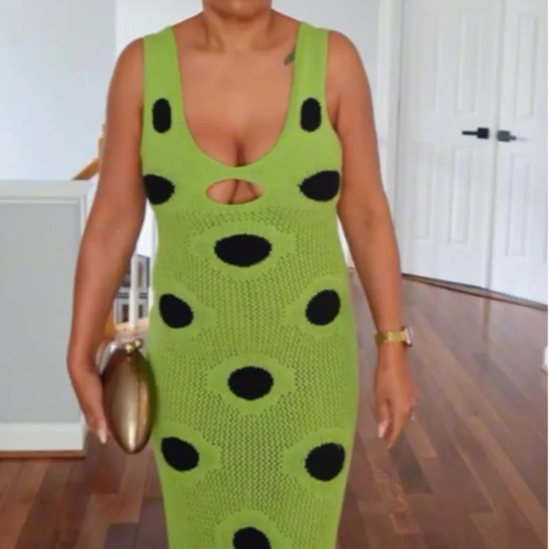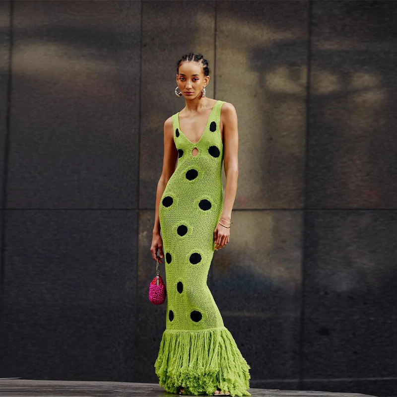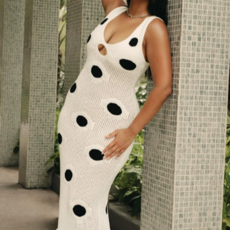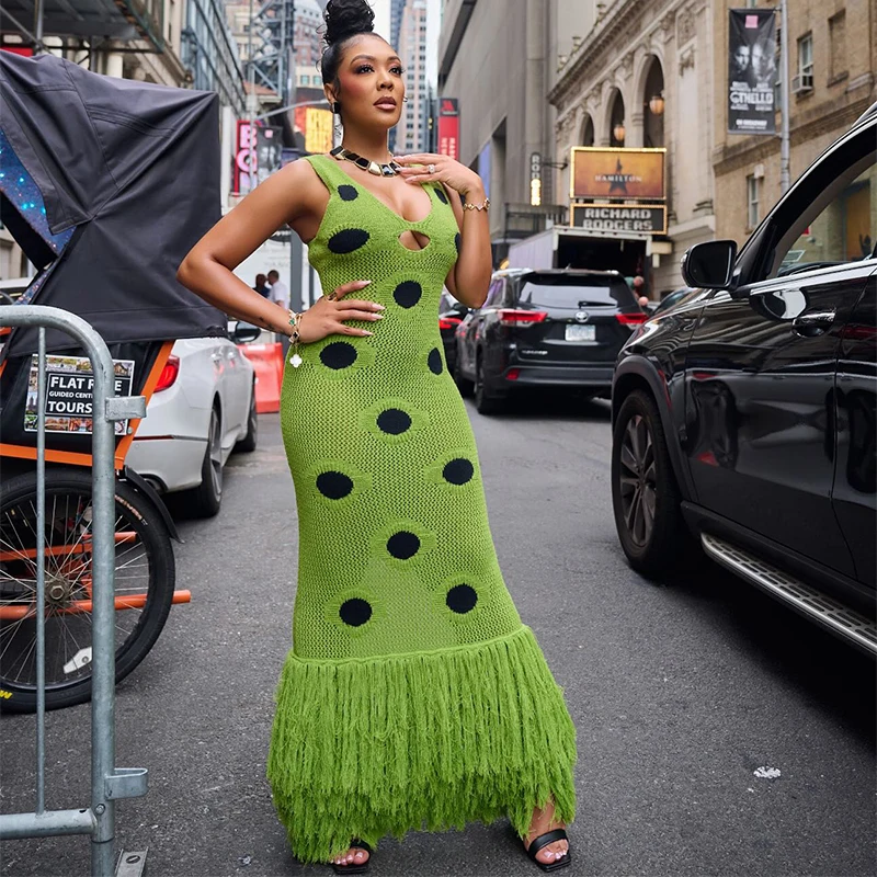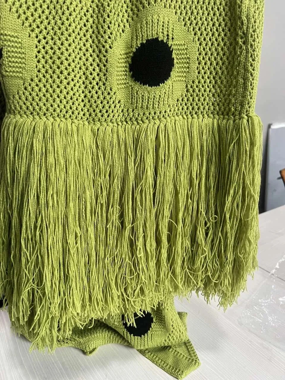 Designed Polka Dot Knitted Long Dress V Neck Hollow Out Fringe Hem Dresses 2025 Summer New Women's Elegant Party Evening Gown
