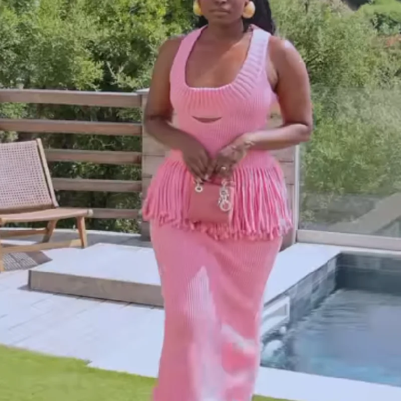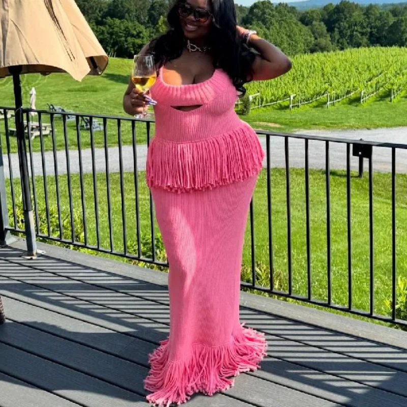 2025 Fashion V-neck Knitted Match Color Long Dress Women Elegant Sleeveless Slim Tassels Maxi Dresses Lady Summer Party Robes