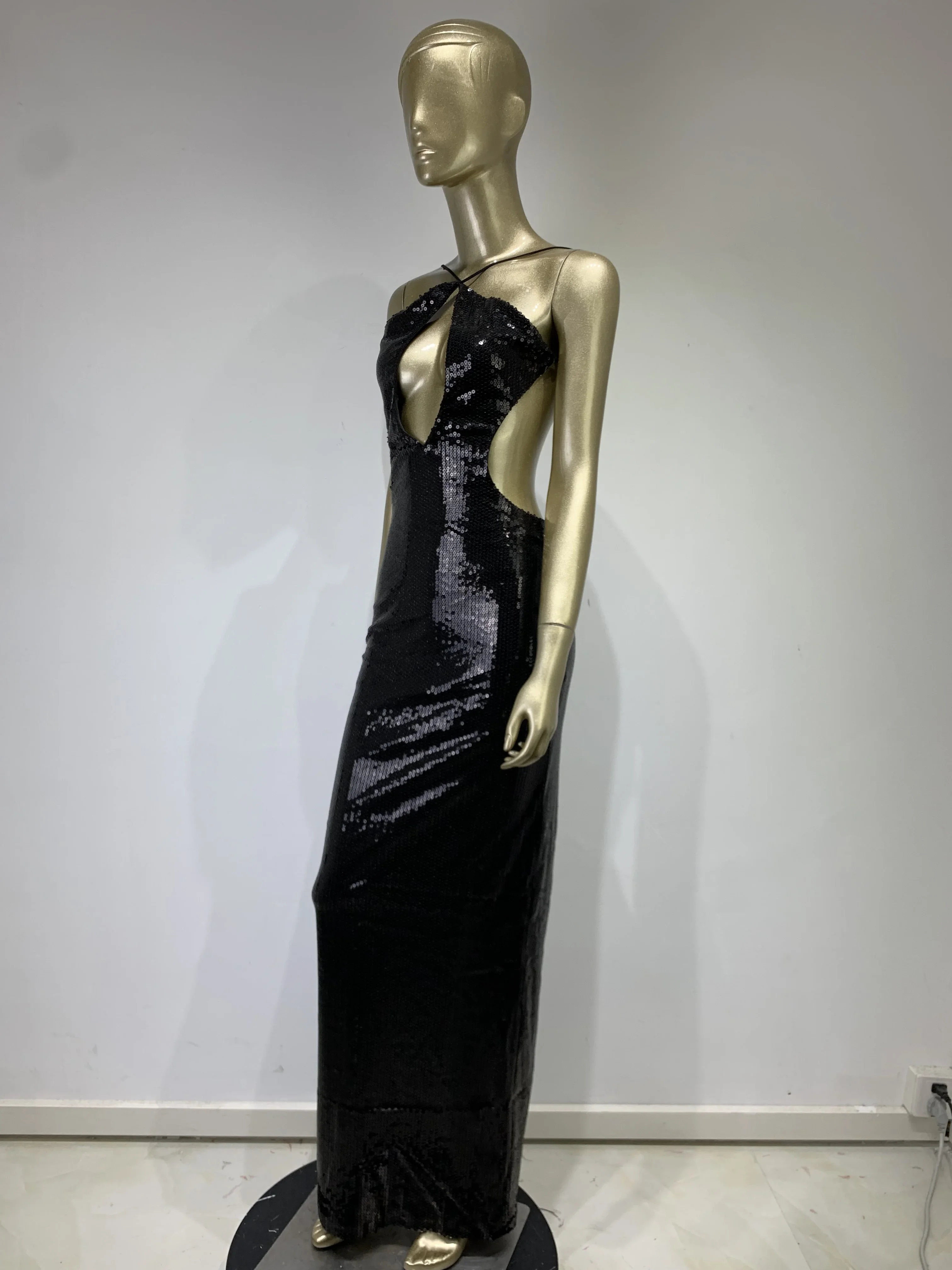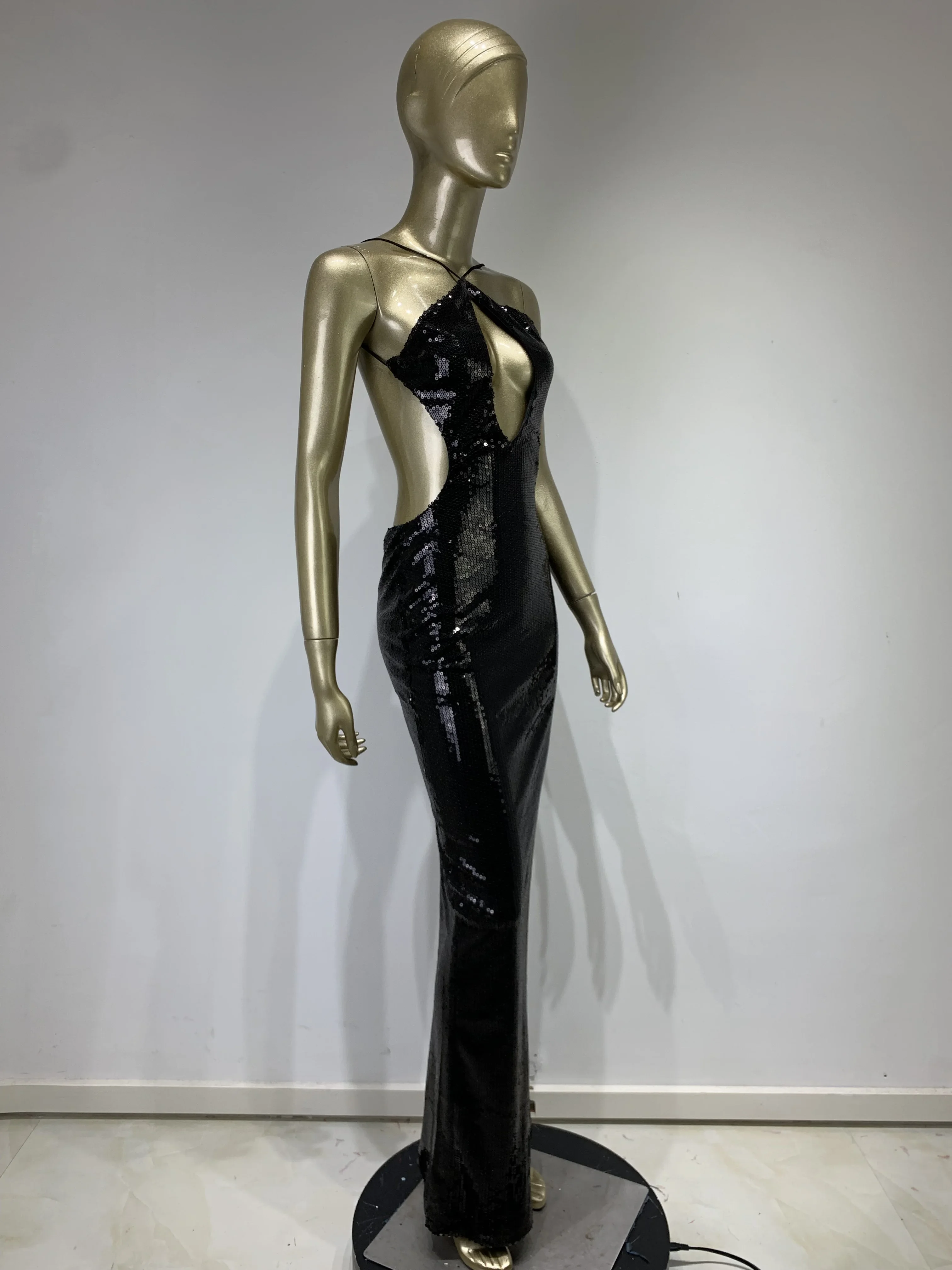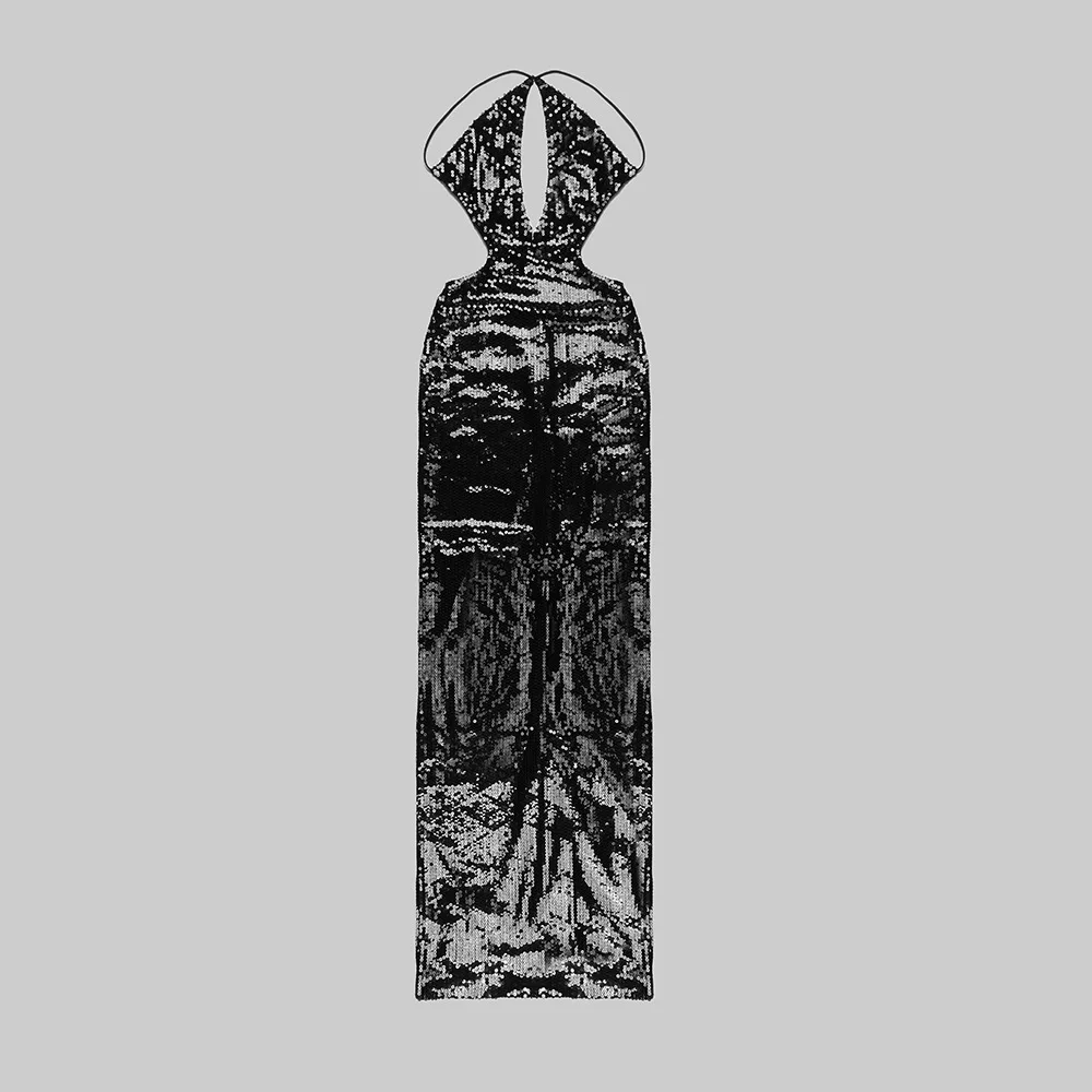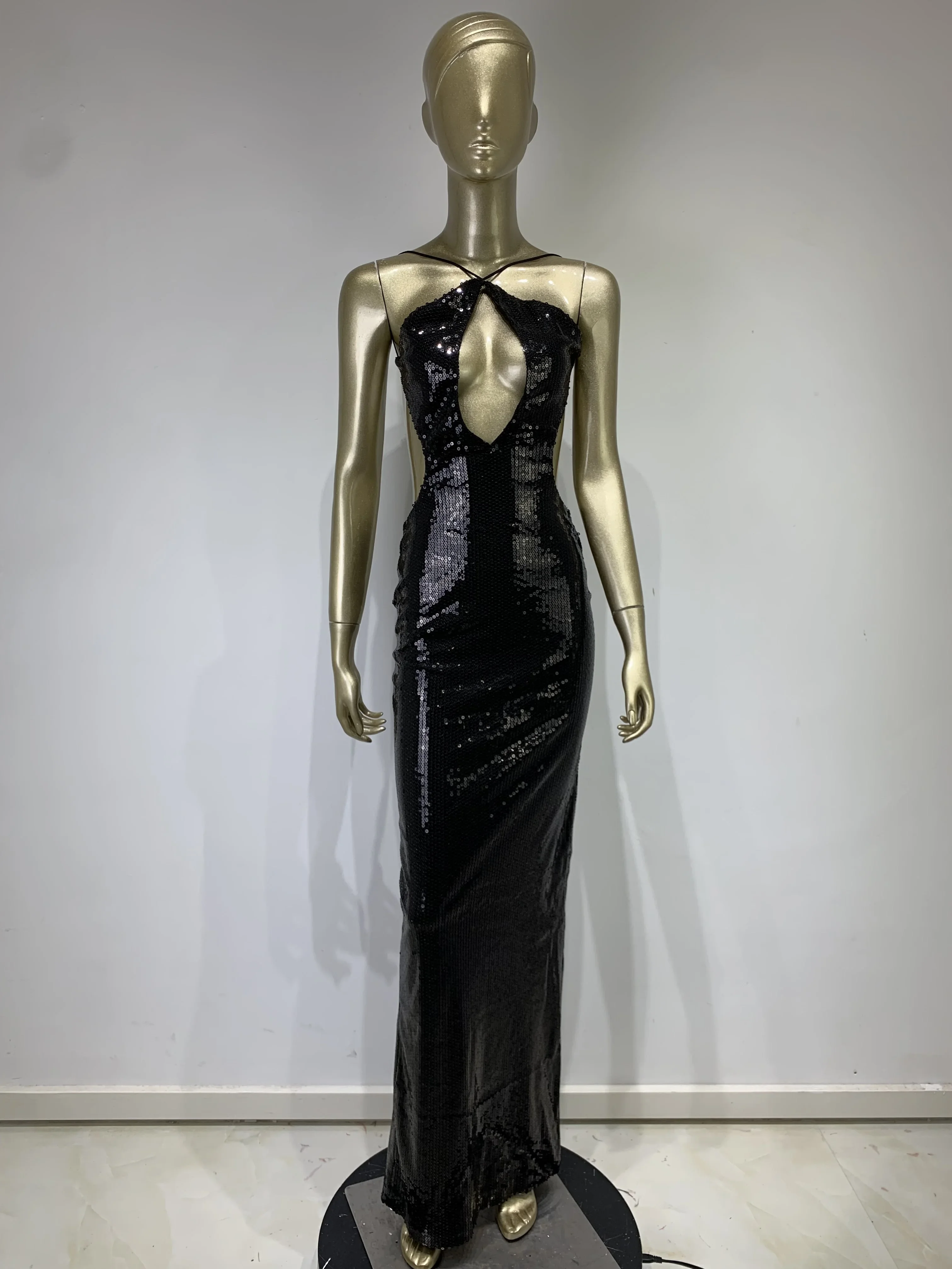 Women Summer Luxury Sexy Strap with Open Back Black Hollow Mesh Shining Long Dress Elegant Celebrity Evening Club Dress