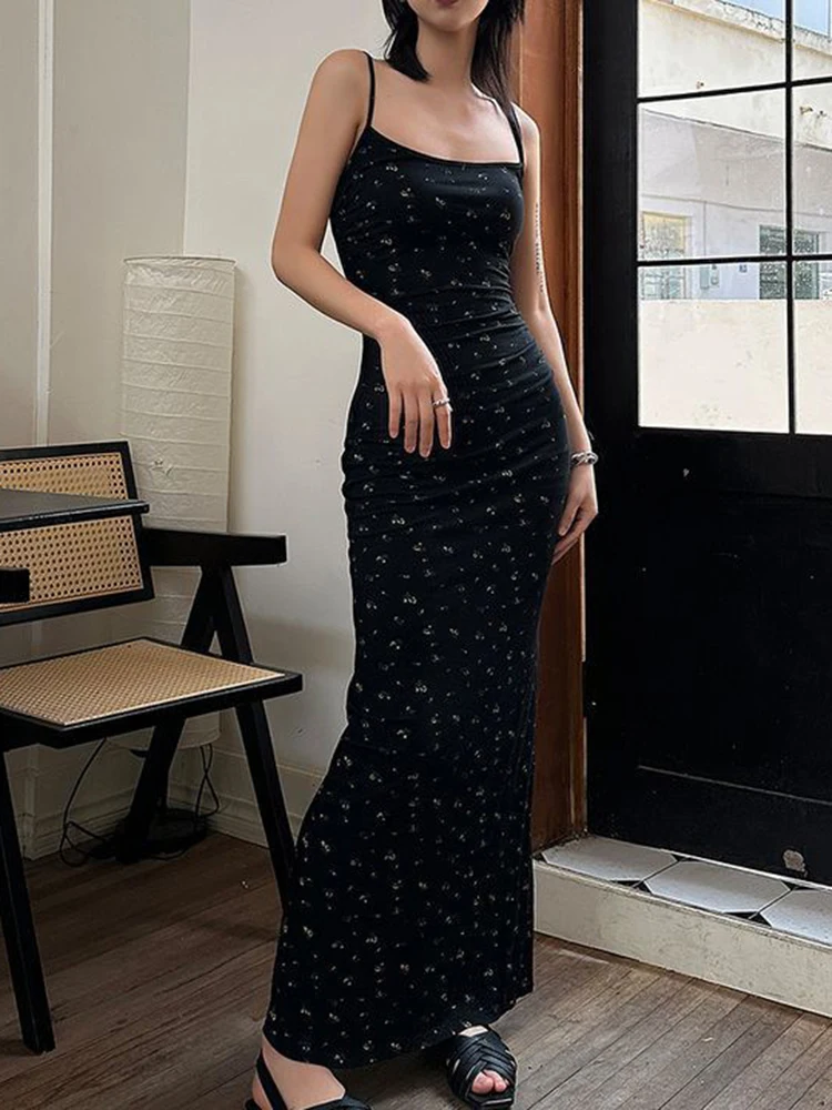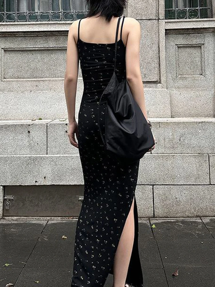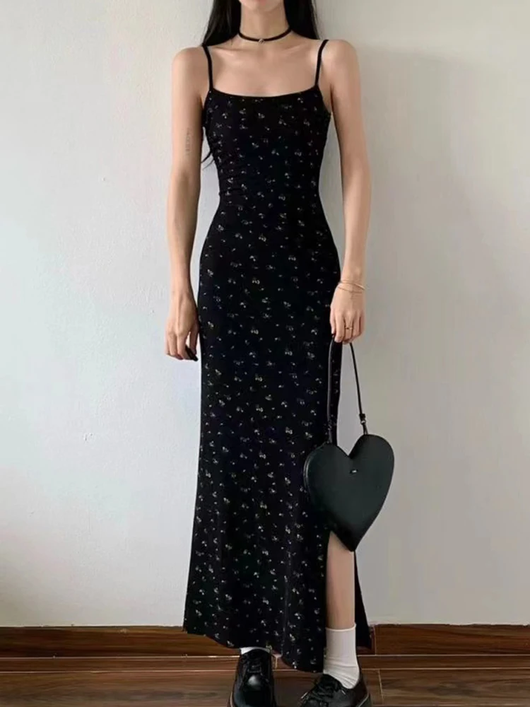 Women Summer Sexy Bodycon Dress Lady Sexy Spaghetti Strap Sleeveless Split Sheath Floral Dress Maxi Black Vestidos