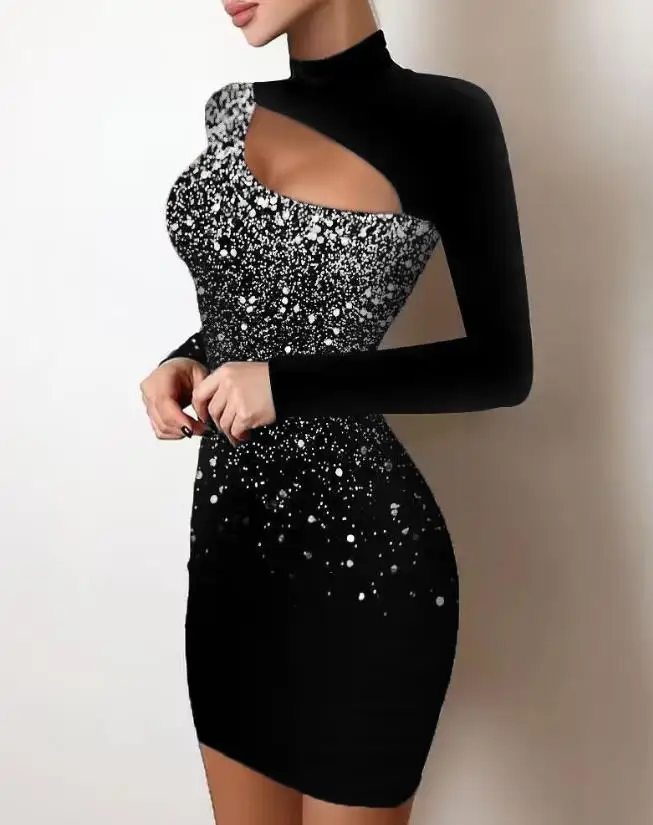 Women's Dresses 2022 Summer Fashion Sexy Off Shoulder Contrast Lace Glitter Plain Skinny Party Mini Long Sleeve Dress