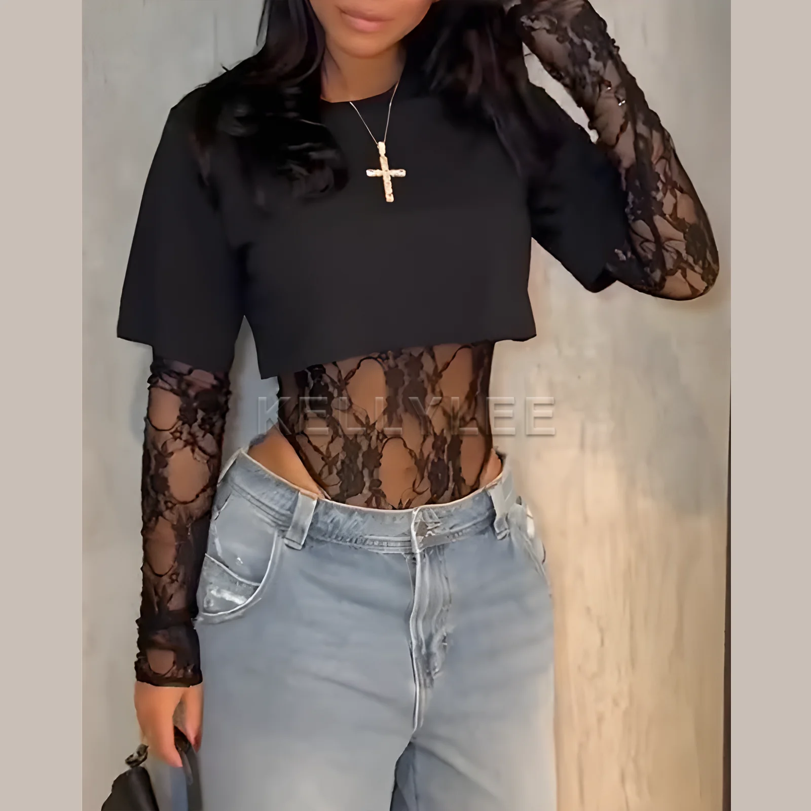 Women's Lace Bodysuit T-shirt Two-Piece Set Ladies Sexy Long Sleeve Shapewear Corsets 2025 New Stylish Women's Clothing Outwear