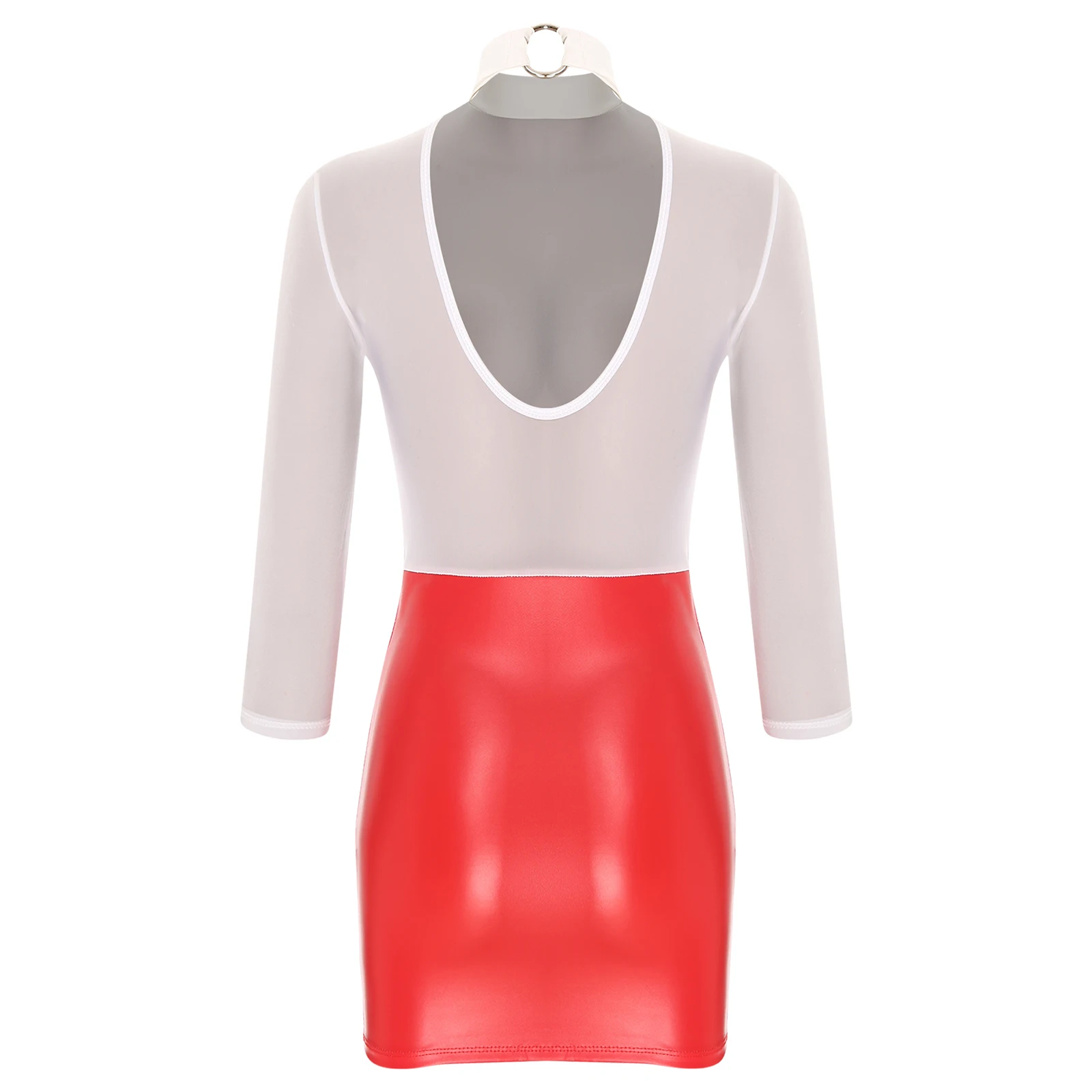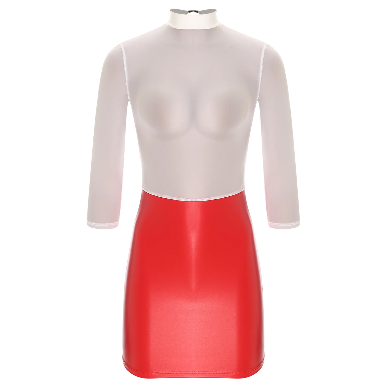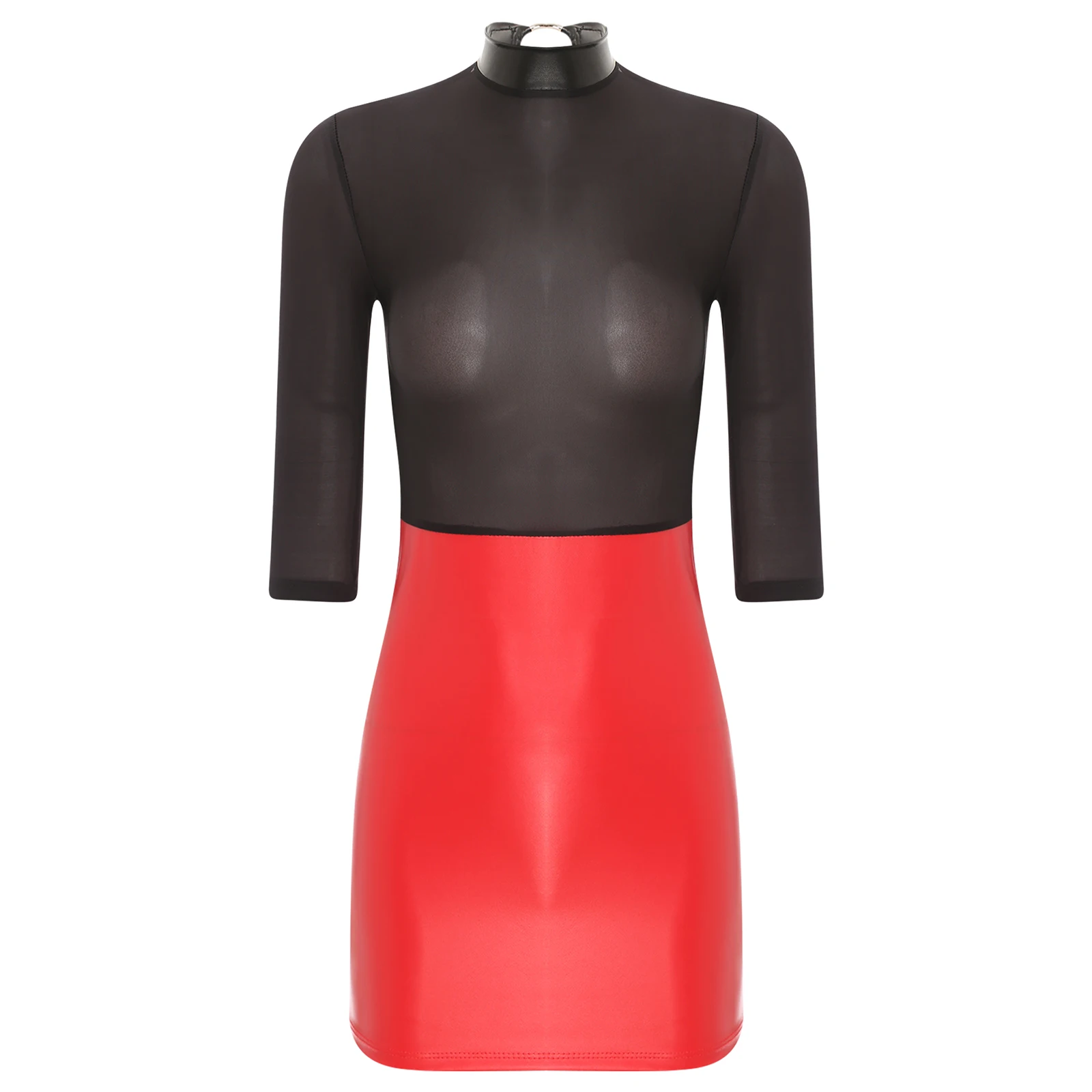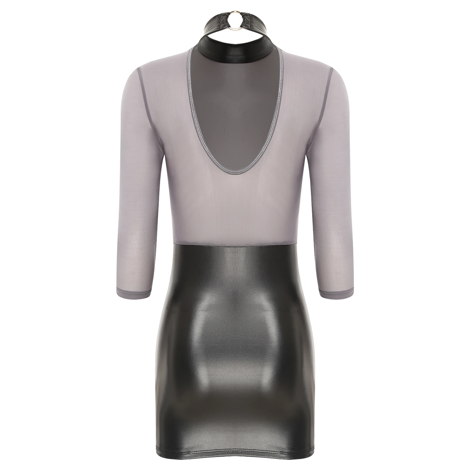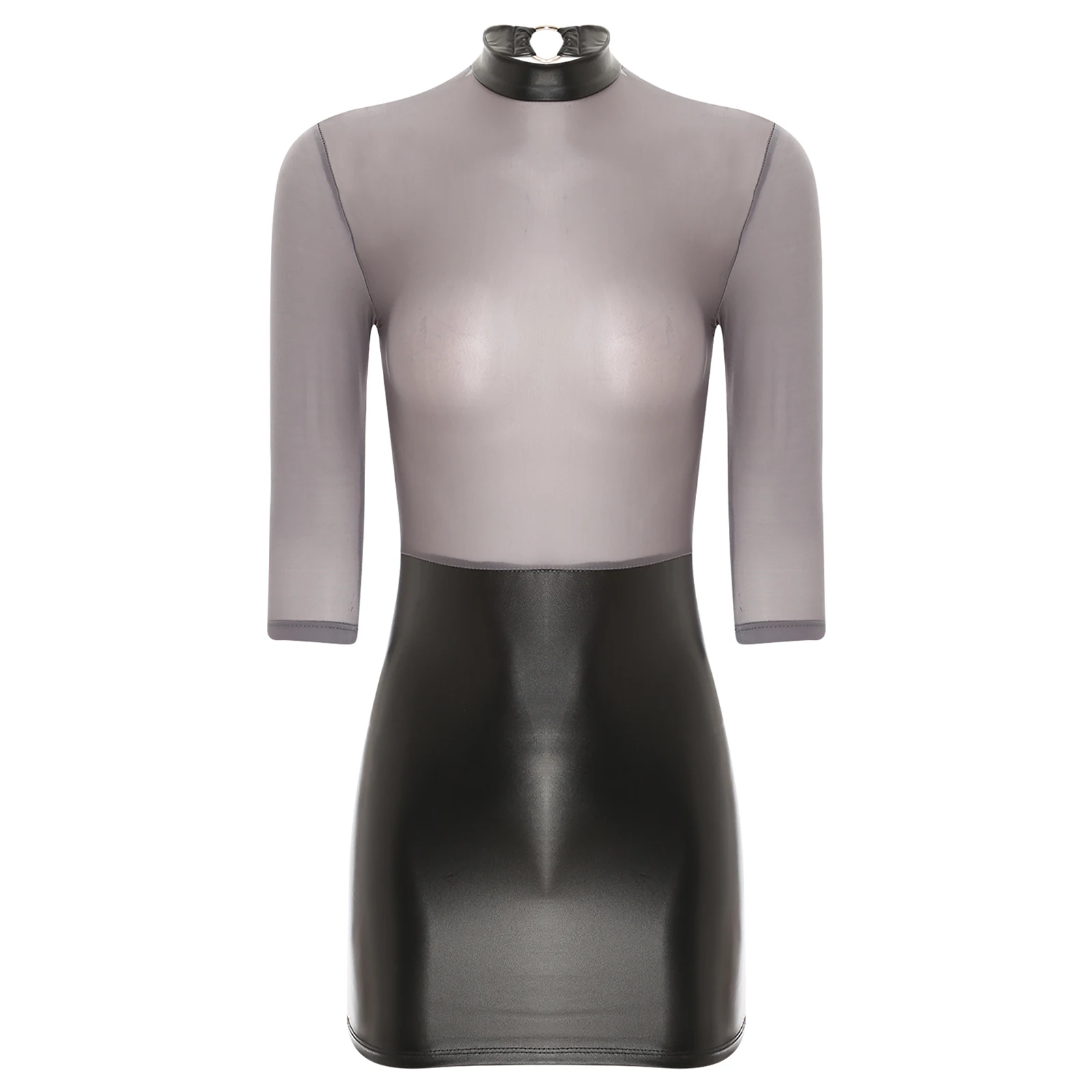 Womens Sexy Bodycon Dress 3/4 Sleeve See-through Bodice Glossy PU Leather Skirt Reversible Dress for Nightclub Party Clubwear